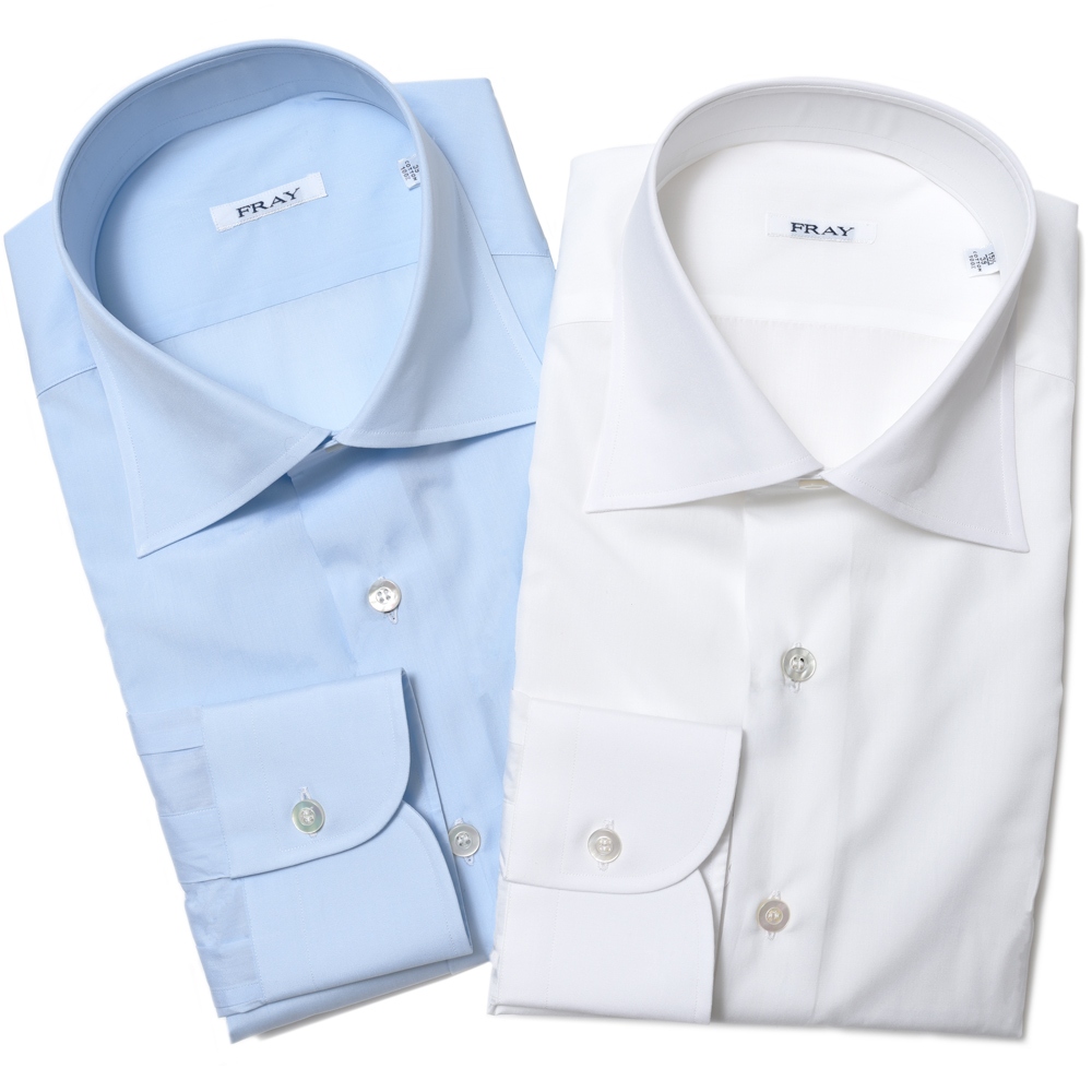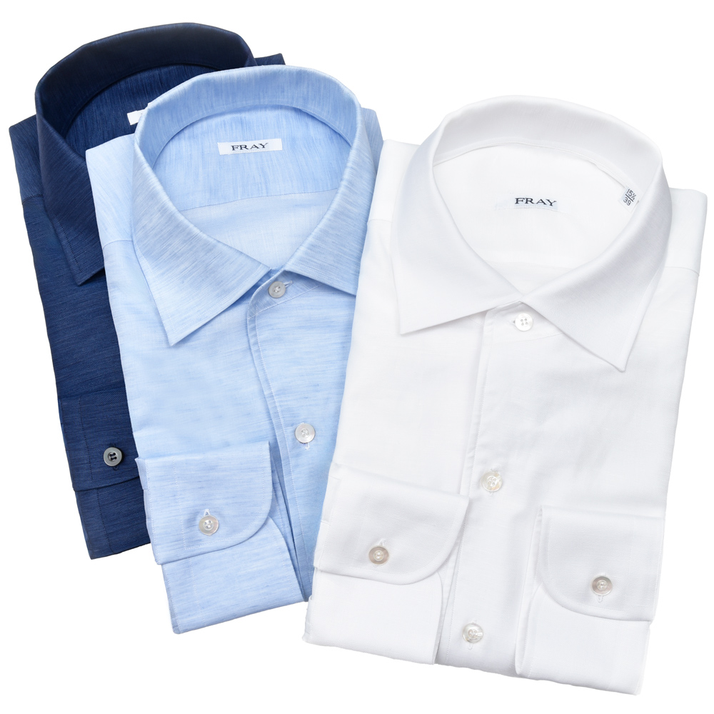 良いシャツの条件は素材、カッティング、縫製の3要素がいかにバランスよく高次元でまとまっているか、なのです。「FRAY(フライ)」が使用する素材は非常に厳選されたものばかりであり、160~200双の細番手な物がその中心。またシャツ地の宝石とも言われるCarlo Riva社の一番のカスタマーといえばその生地への拘りは推して知るべしです。