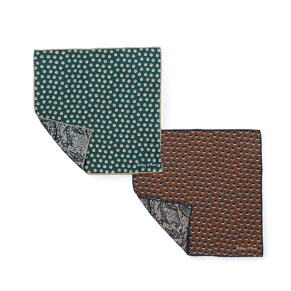 Holliday & Brown社は1926年にAubrey Brown氏と、ブラウン家の古くからの友人であった Holliday(ホリデー)氏によって設立。もともとは、1919年、Aubrey Brown氏がバーリントン・アーケードにシルクネクタイを扱うショップをオープンしたのが「Holliday&Brown(ホリデーアンドブラウン)」の始まりです。当時、自社デザイナーを使うのが主流の時代にフリーランスの外部デザイナーを起用し、一人のデザイナーがプリントと織物の両デザインを手掛けるなど、その独創性は際立っていました。また、名門紳士服店が集中していることで有名なサヴィル・ロウ(Savil Row)のテーラースタイルに学んだパターンや色使いも手伝い、 「Holliday&Brown(ホリデーアンドブラウン)」の洗練されたデザインはより知られるようになり、ペイズリーからレジメンタル、フラワーモチーフなど、 Holliday&Brownのエキセントリックかつユニークなネクタイは英国紳士の間でさらに存在感を強めるようになりました。