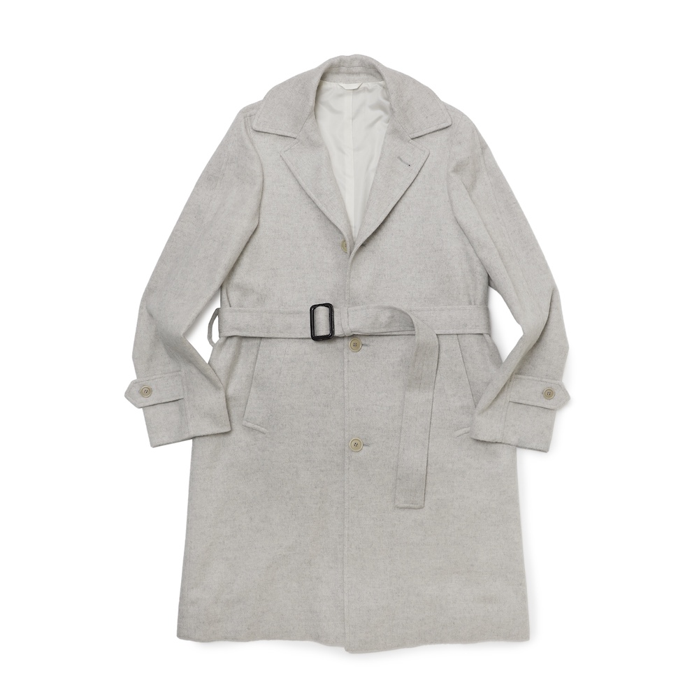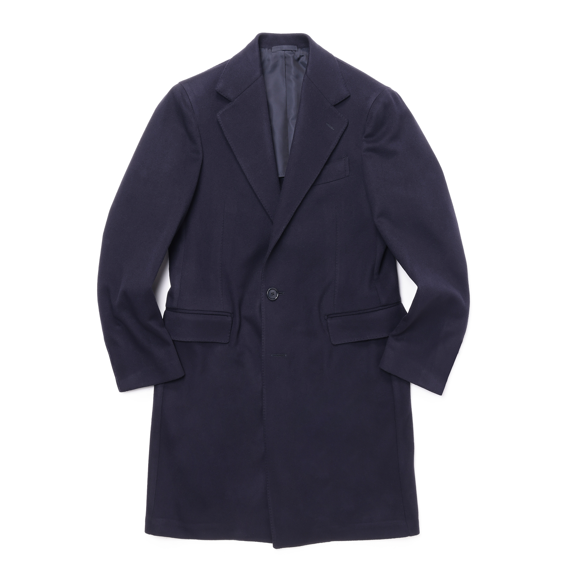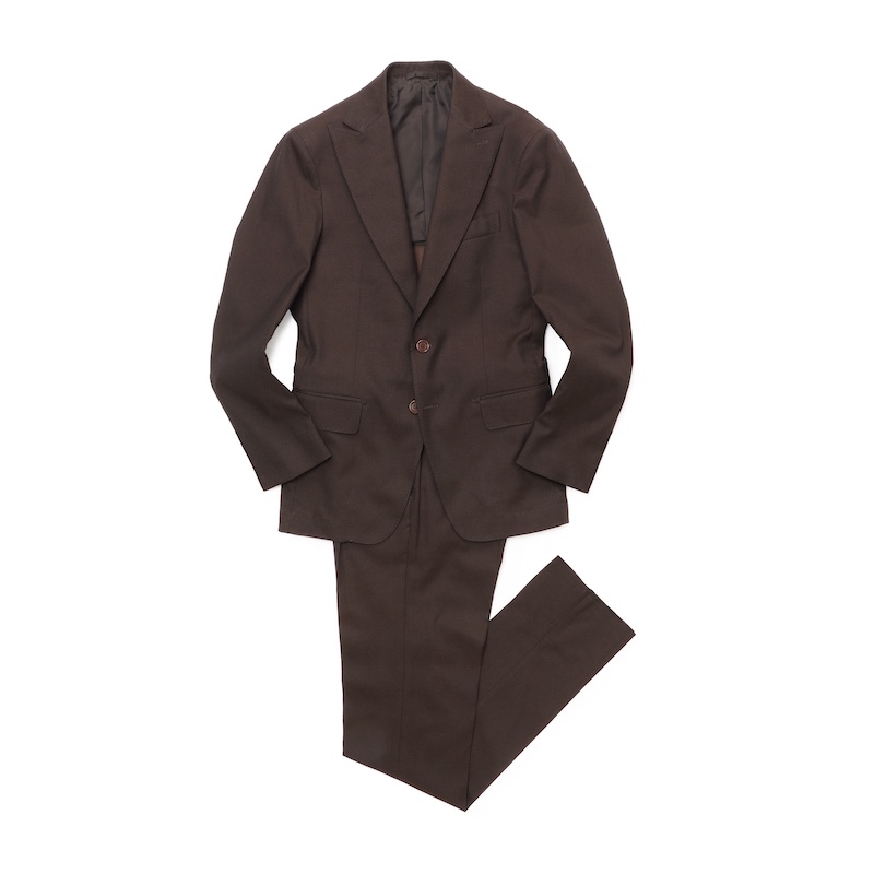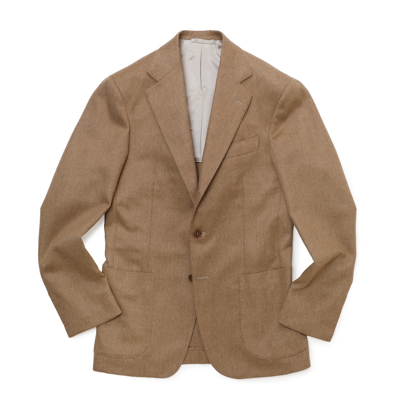 クラシックなデザインではなく、細身にシェイプされたシルエットが特徴。ポケット、襟、ボタン位置のバランスを考え、ゴージ位置を高くすることで、よりモダンな印象に。裾の開きはナポリらしく大きなカーブで軽いイメージ。肩は着る人の肩がそのままわかるくらいコンパクトに。袖は細いものの動き易さを追求。胸ポケットはナポリ仕立ての特徴とも言えるカーブしたバルカポケット。