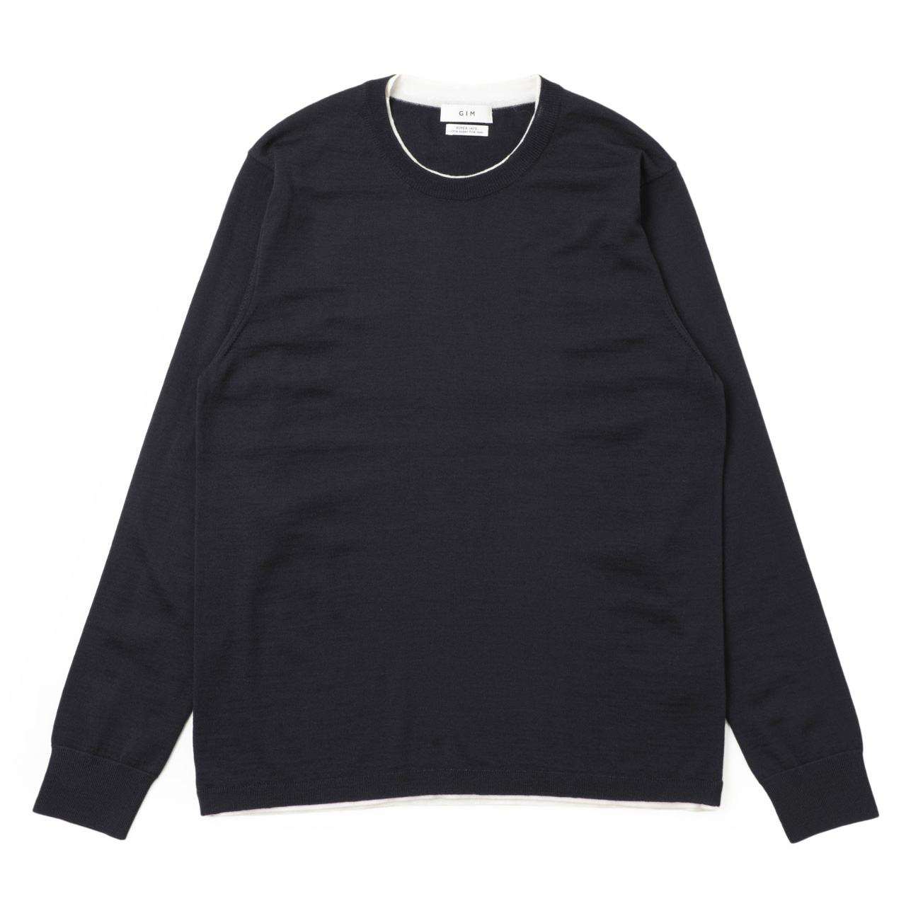 【菅原靴店別注】 gim ジム ニット ハイゲージ クルーネック ウルトラスーパーファイン Super 140's レイヤード風 25504519 705 ネイビー