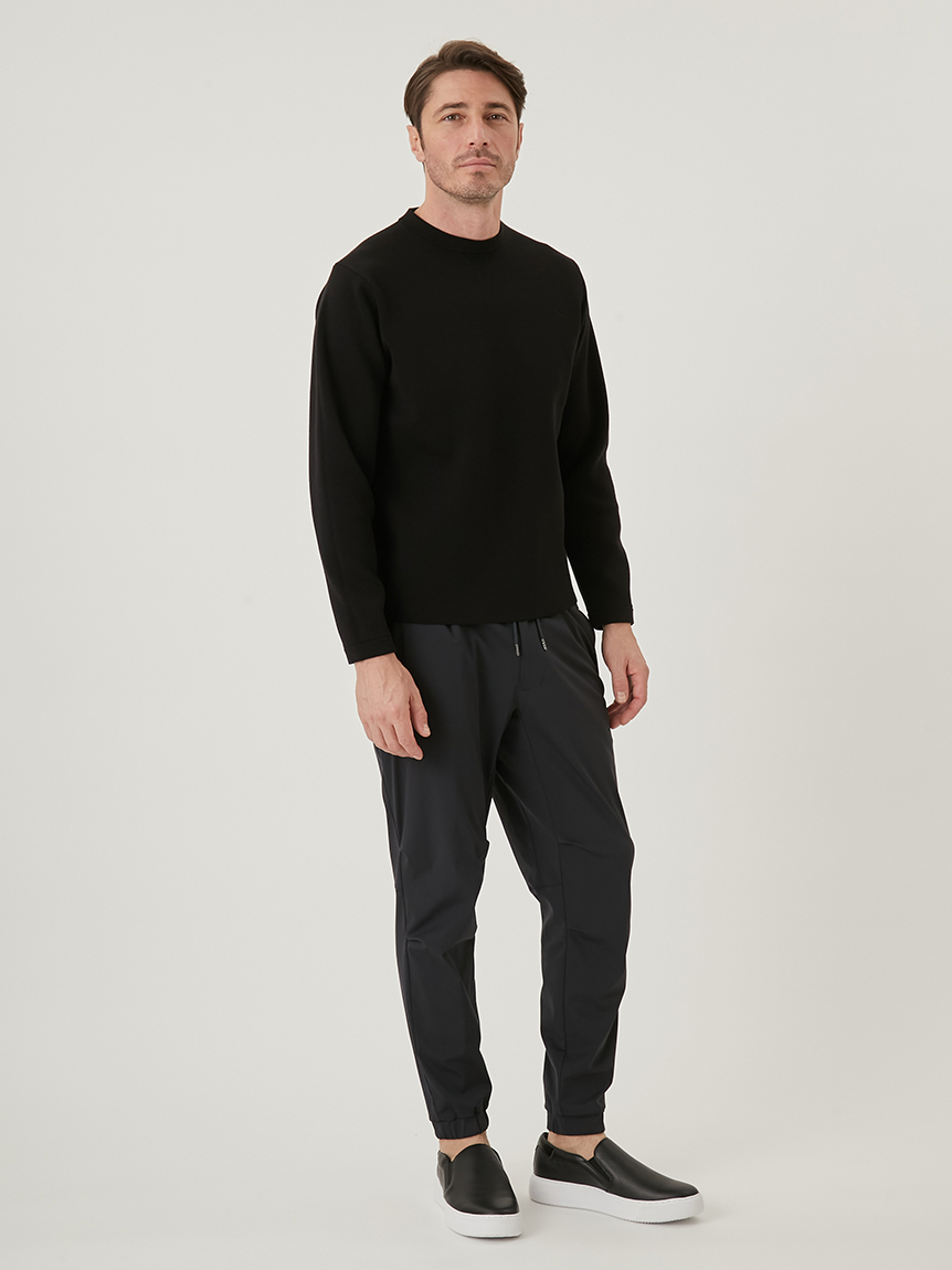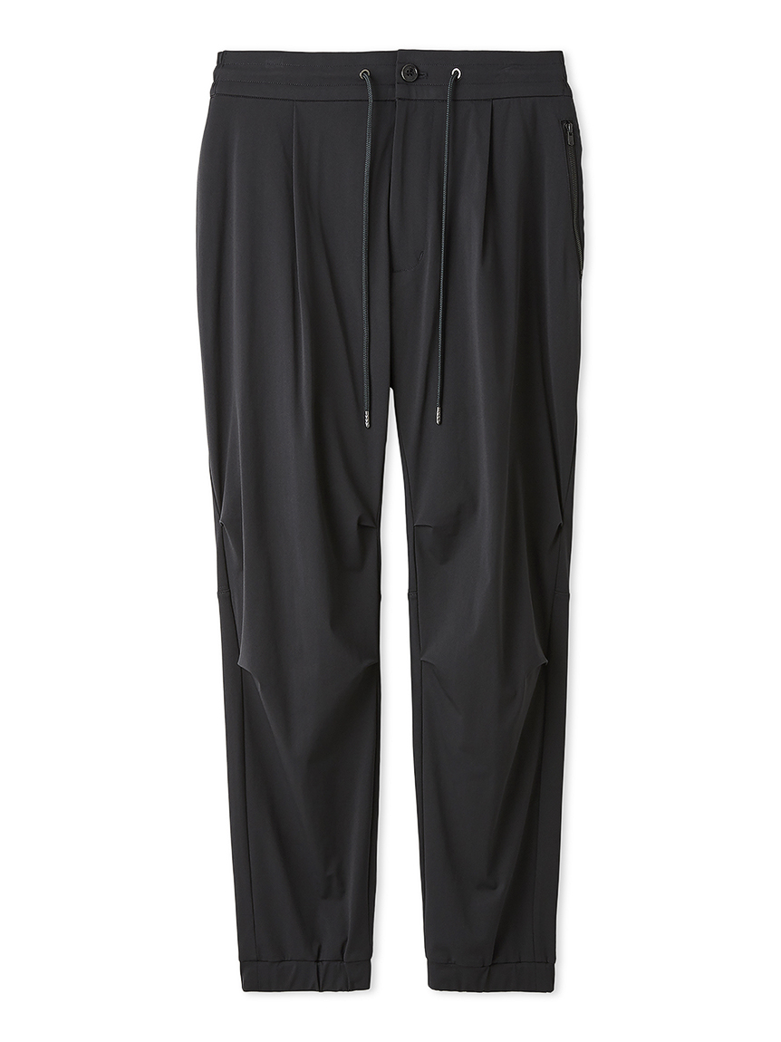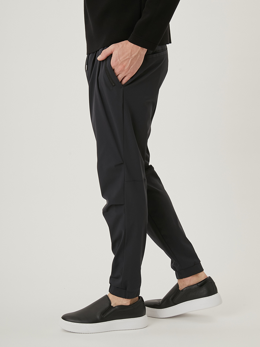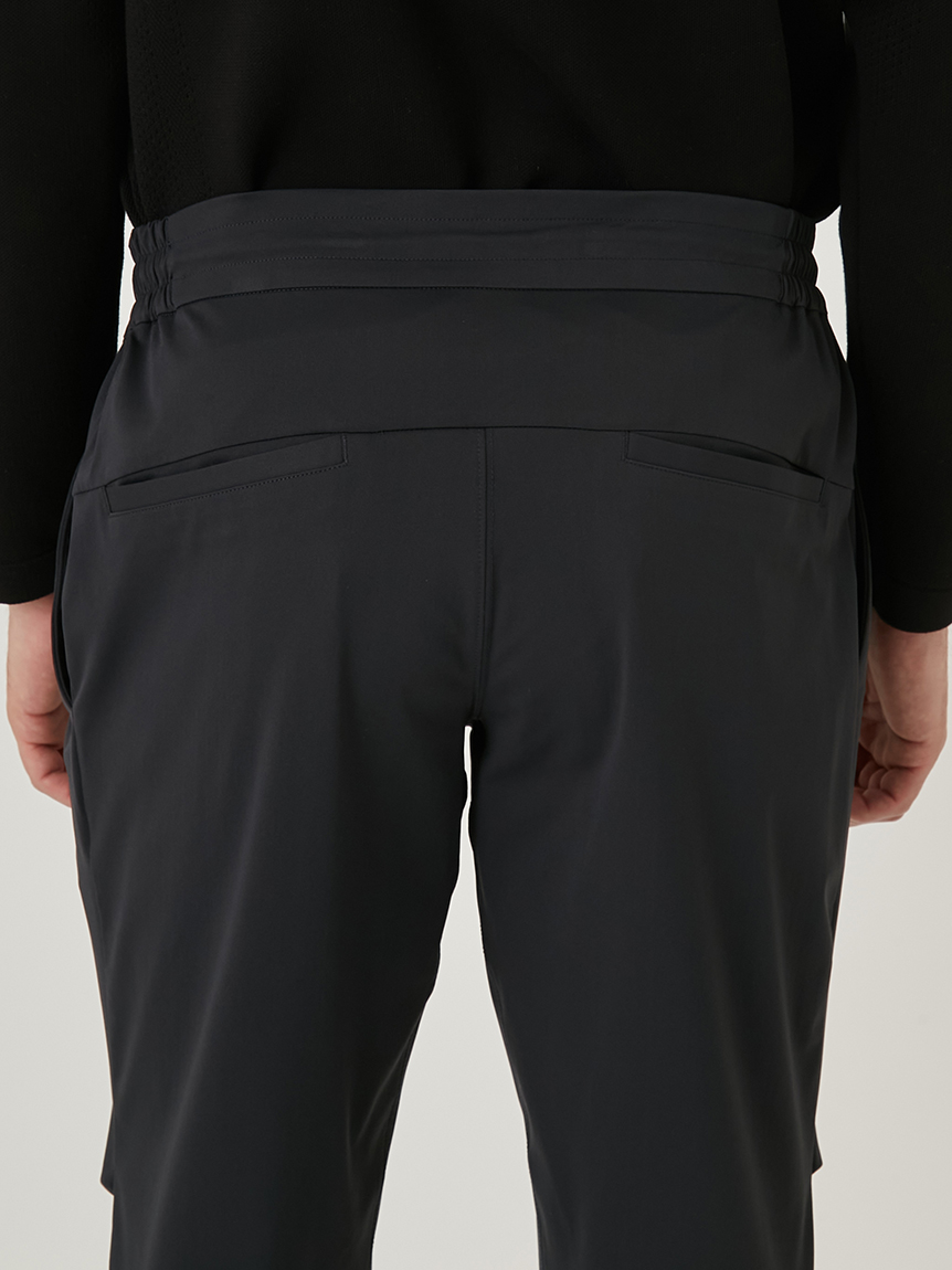 素材の伸縮をいかし、シルエットはやや細身のテーパードタイプ。裾をリブ風にすることで足元がスッキリとして、スニーカーとの相性も◎。