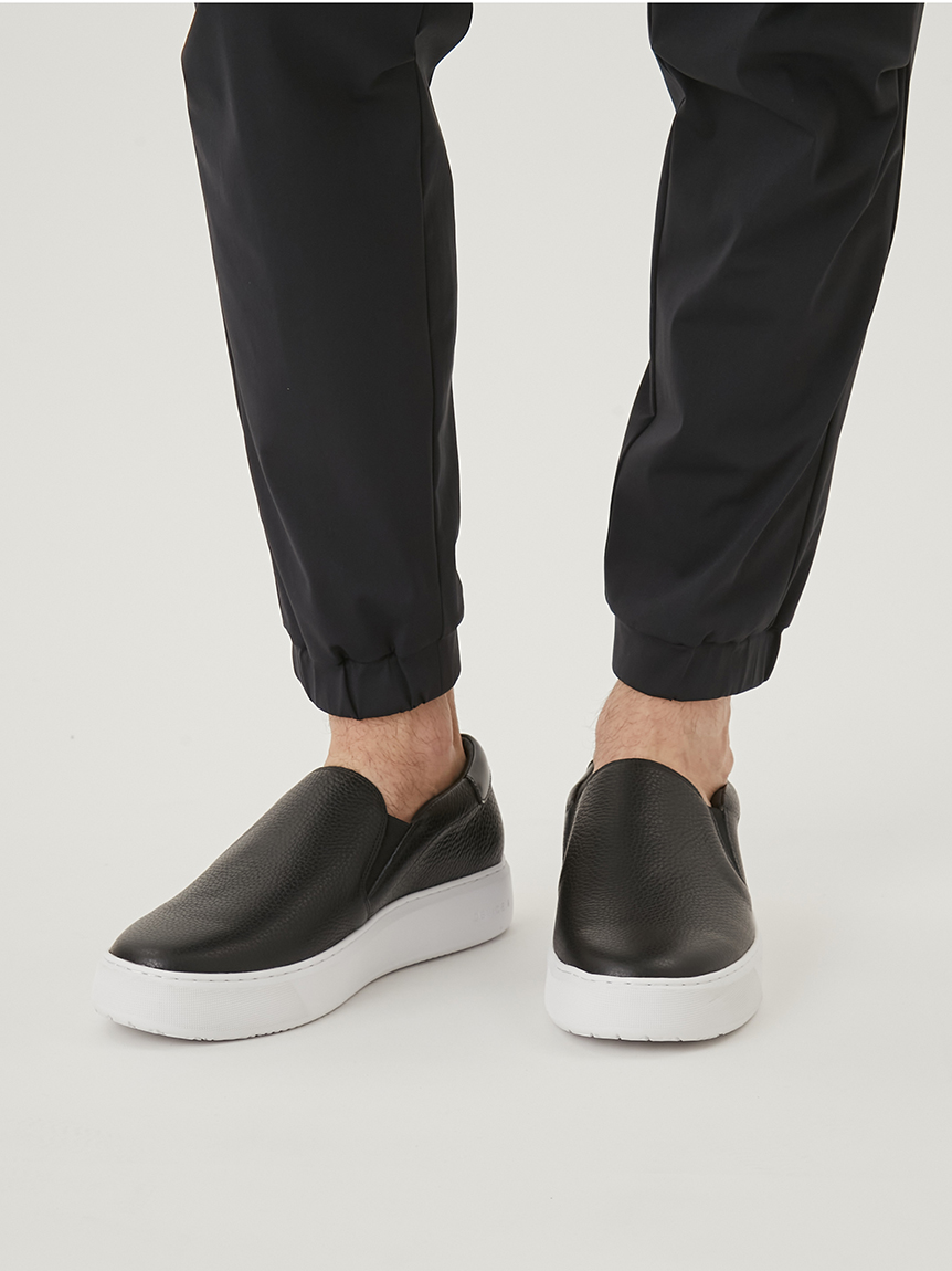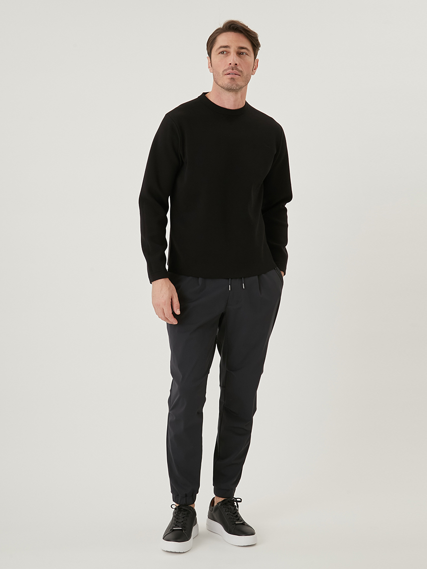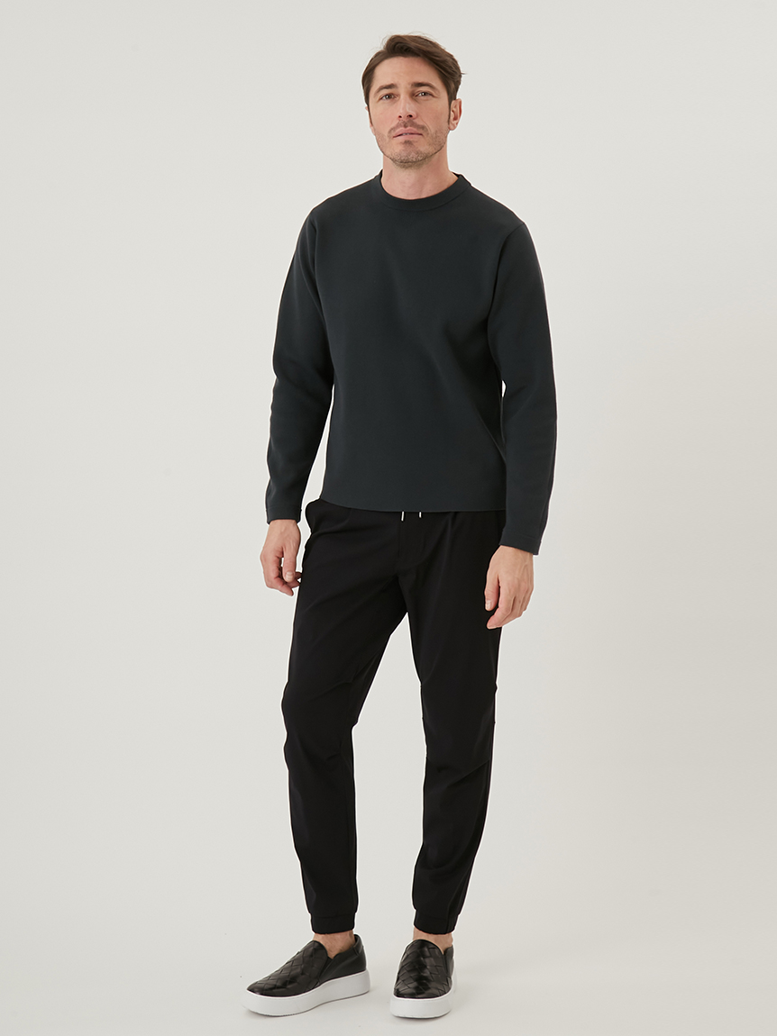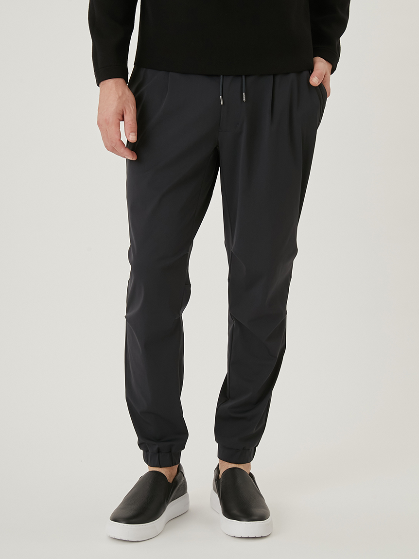 素材の伸縮をいかし、シルエットはやや細身のテーパードタイプ。裾をリブ風にすることで足元がスッキリとして、スニーカーとの相性も◎。