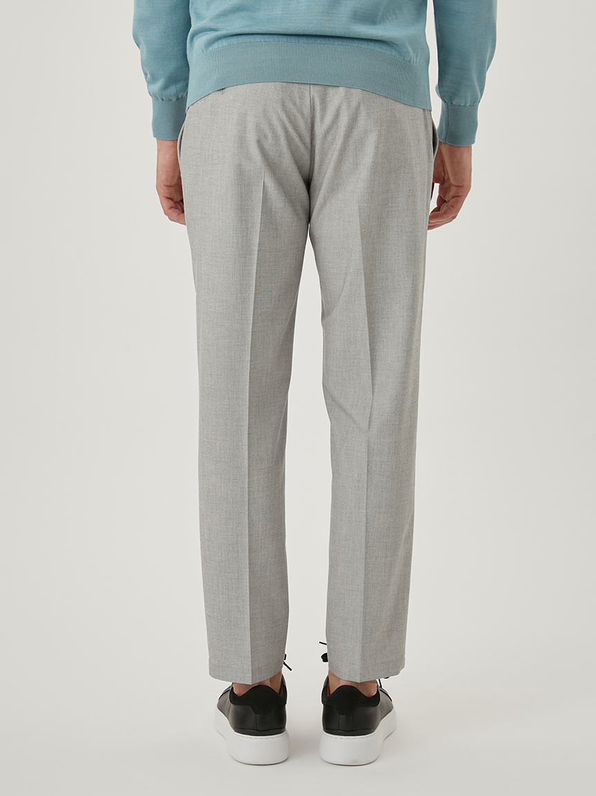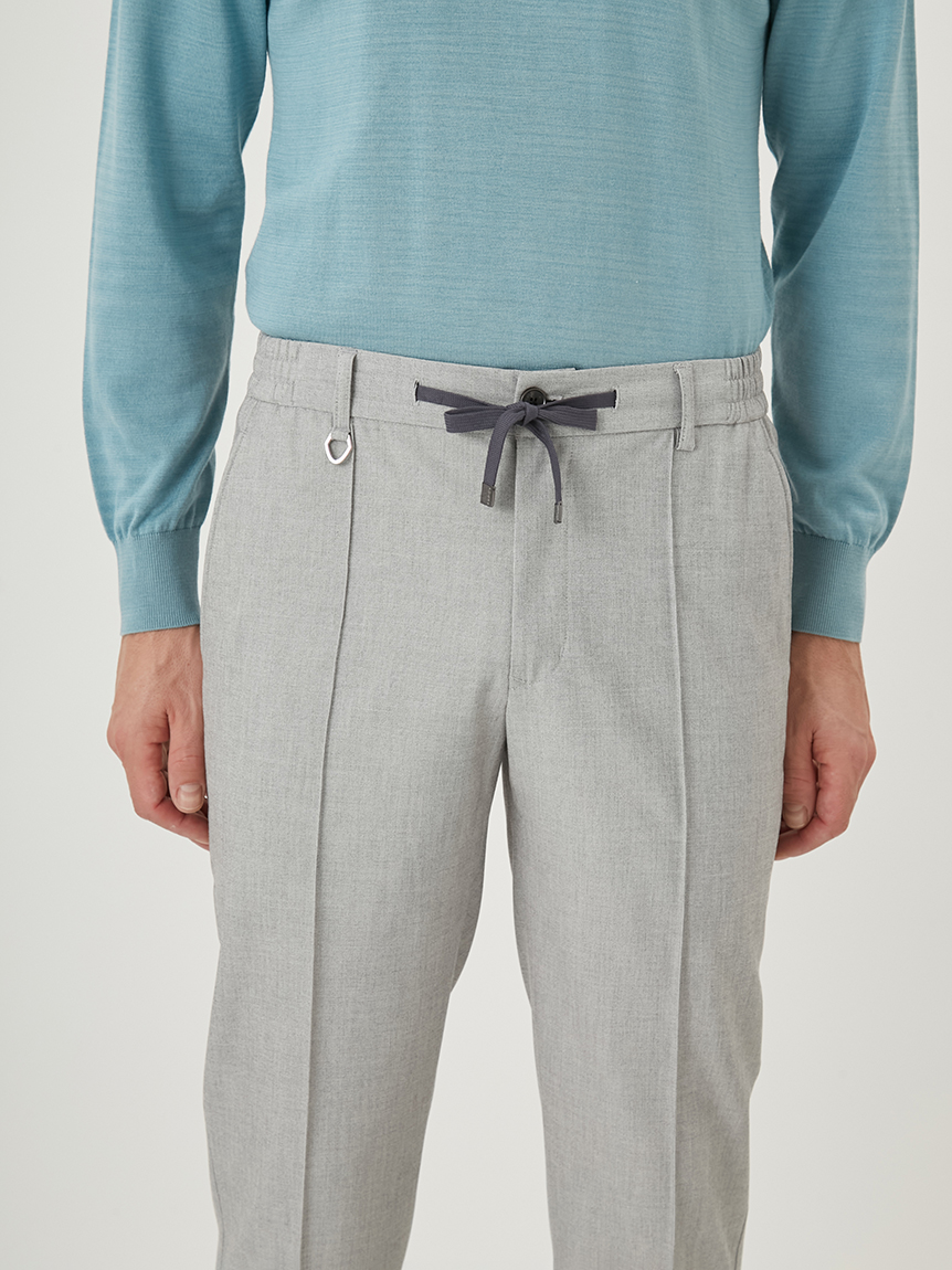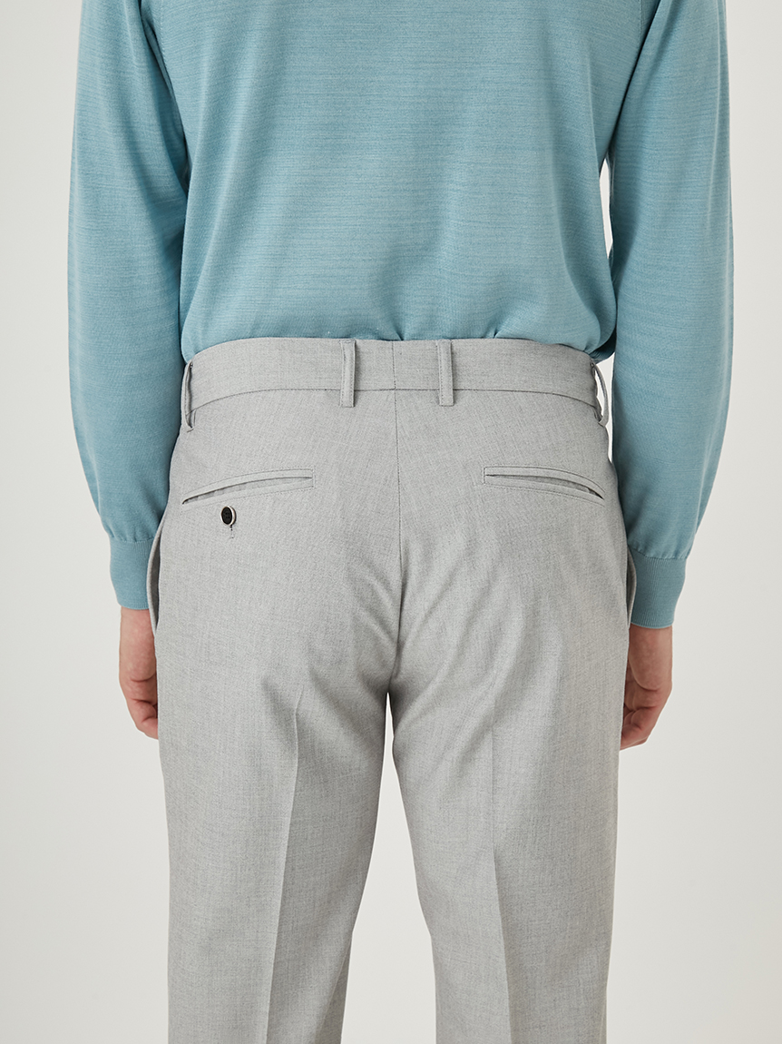 足元は変わらずすっきりとしているので、革靴やスニーカーなどアイテムを選ばずに穿ける仕上がりに。年間を通じて穿いて頂ける素材となっており、ワードローブの定番として取り入れておきたい1本です。