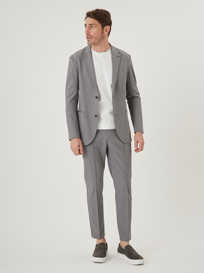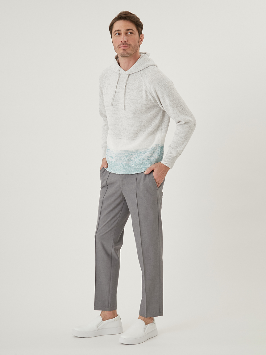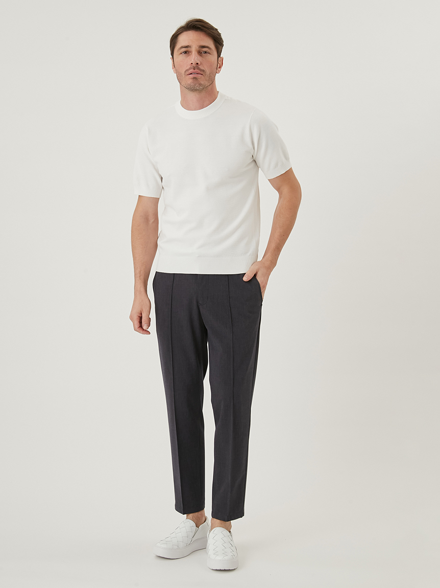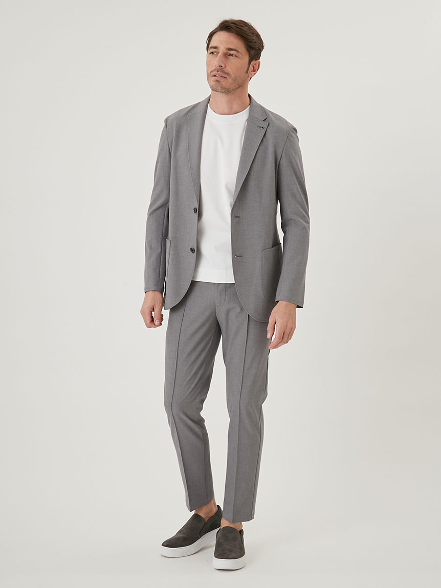 足元は変わらずすっきりとしているので、革靴やスニーカーなどアイテムを選ばずに穿ける仕上がりに。年間を通じて穿いて頂ける素材となっており、ワードローブの定番として取り入れておきたい1本です。