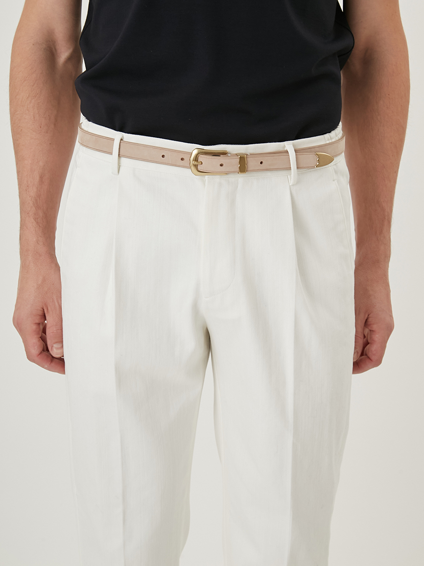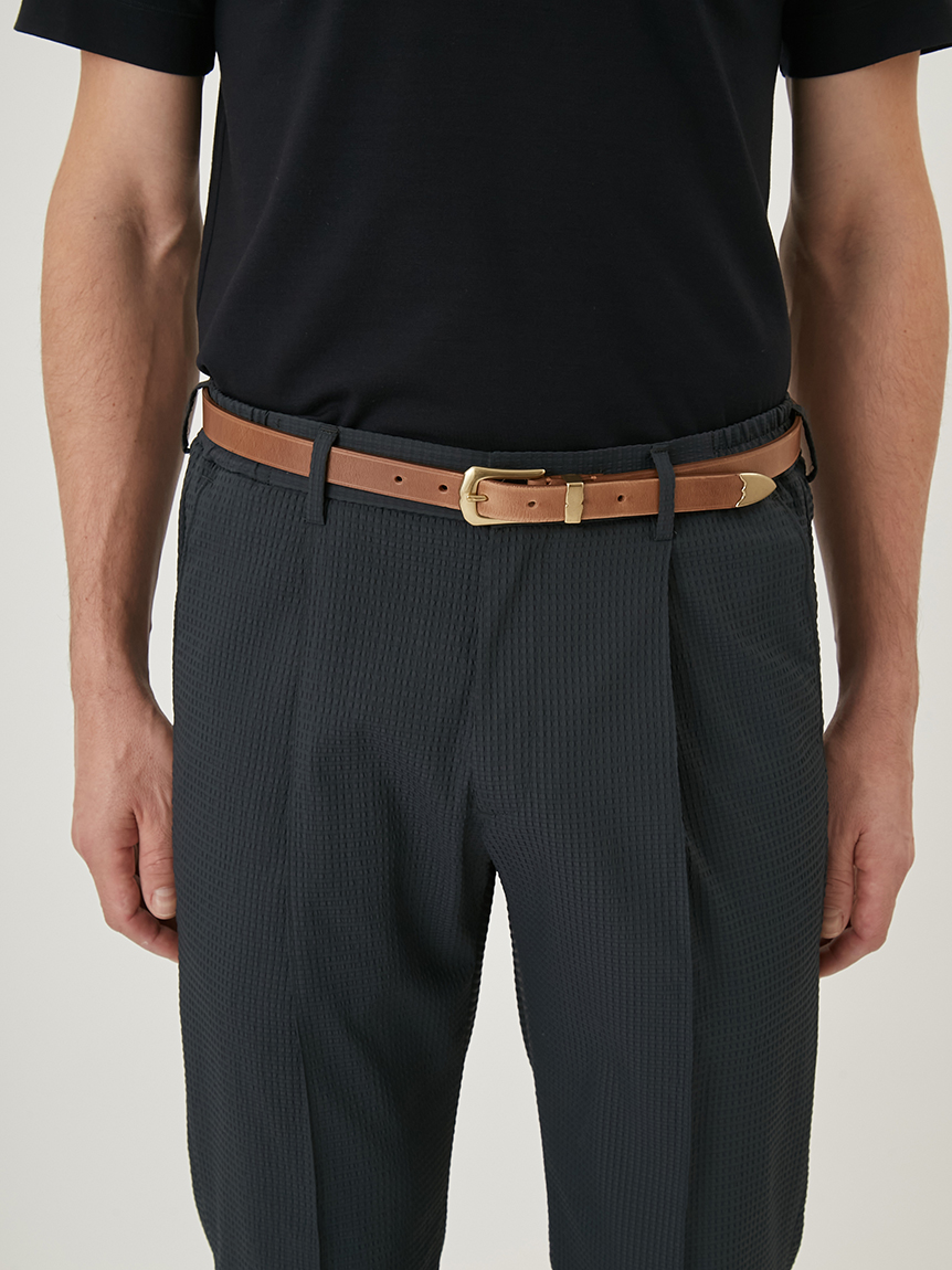 バックル、ベルトループ、ベルト先に金属パーツをあしらい、高級感あふれるデザインに仕上がっております。上下端にライン状の溝が入っており、立体的な見え方を楽しめます。