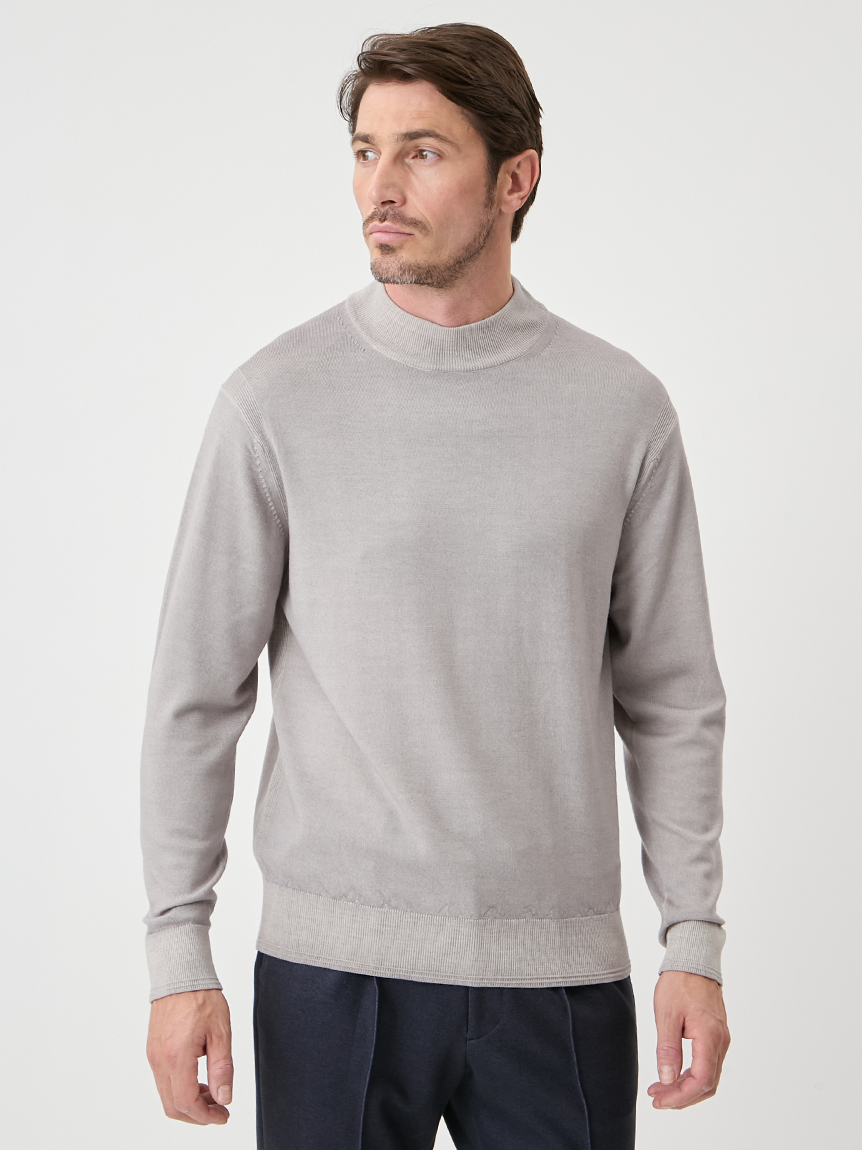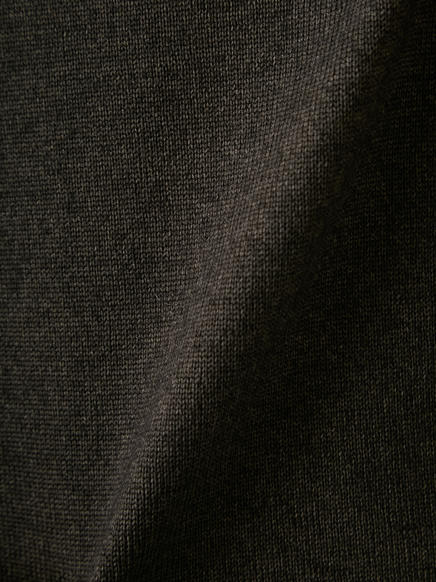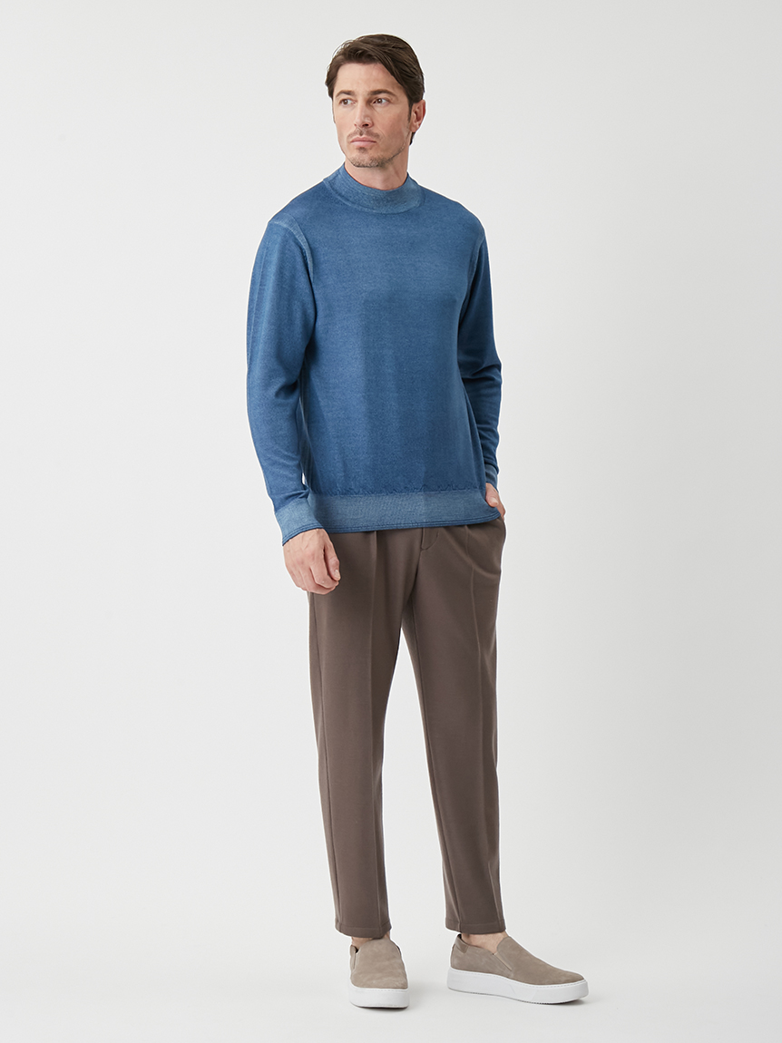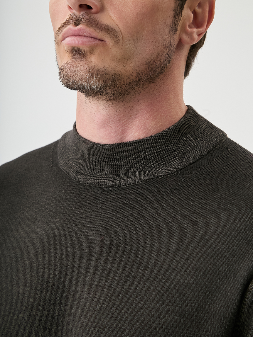 ジャケットにも合わせられるようにコンパクトな設計にし、モックネックで衿回りをカバーしています。