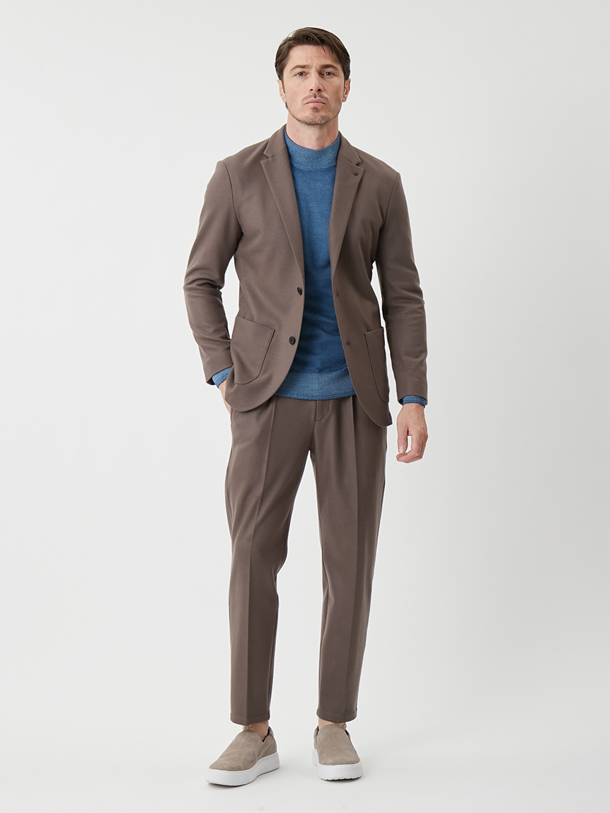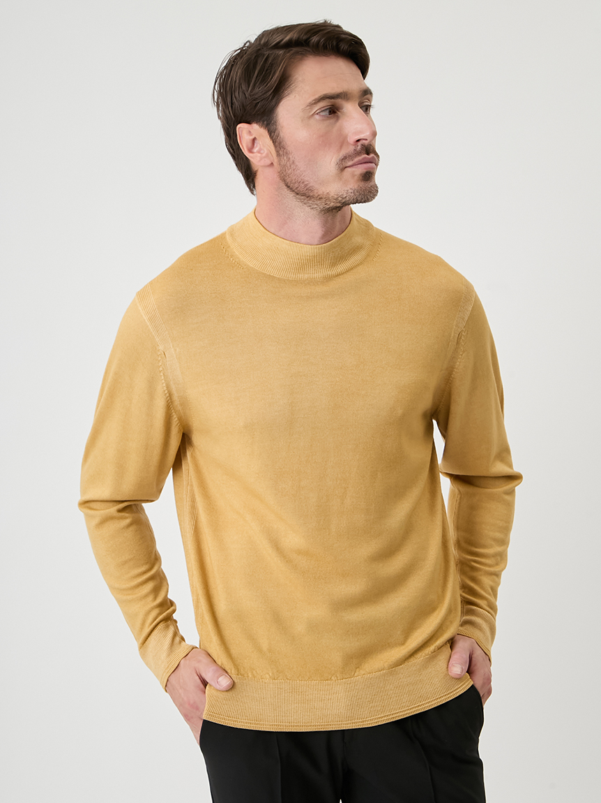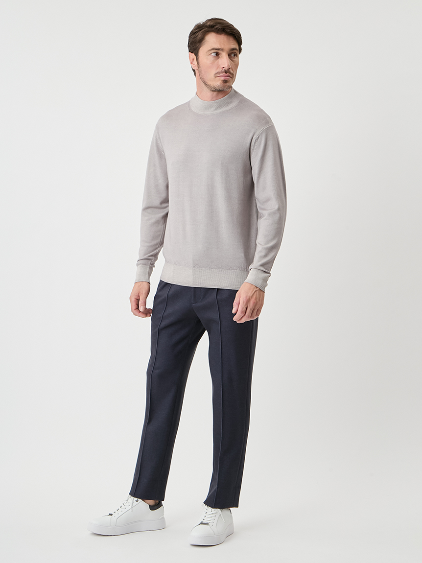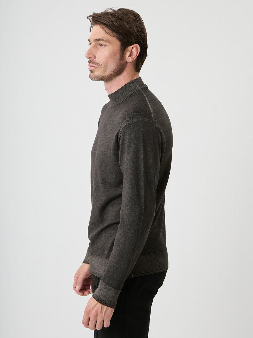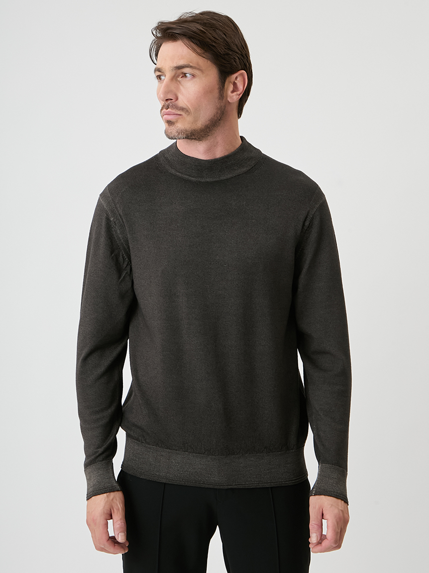 ジャケットにも合わせられるようにコンパクトな設計にし、モックネックで衿回りをカバーしています。
