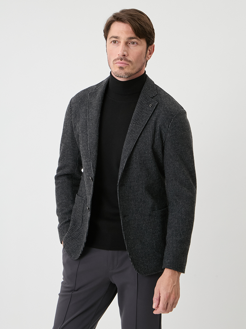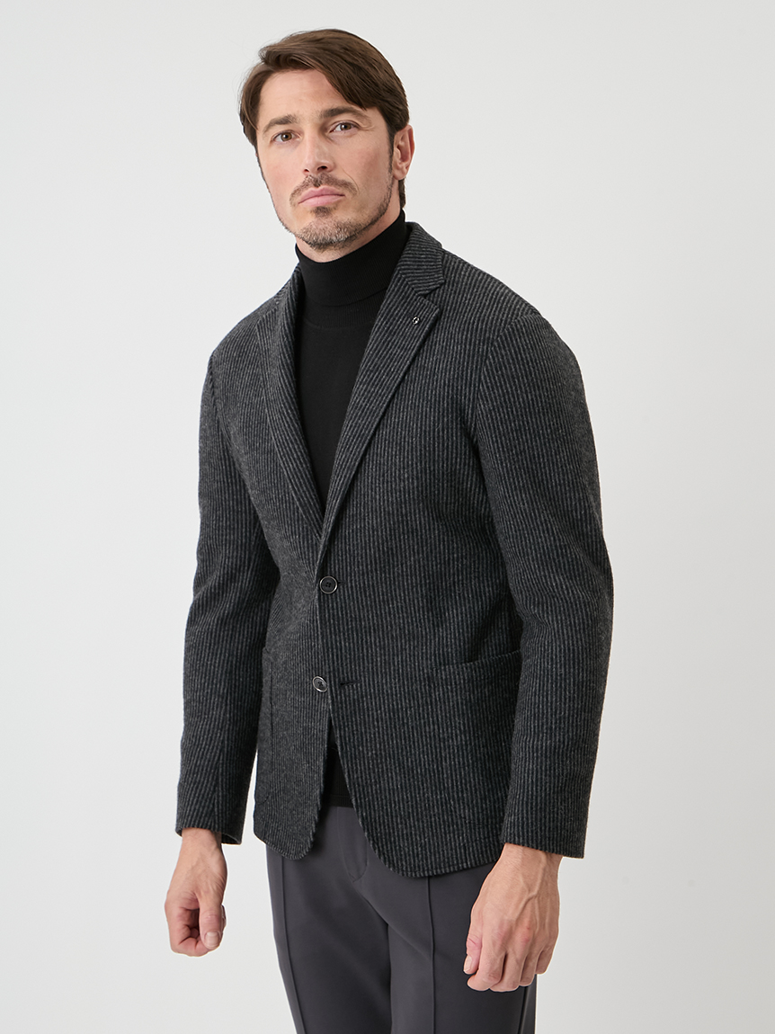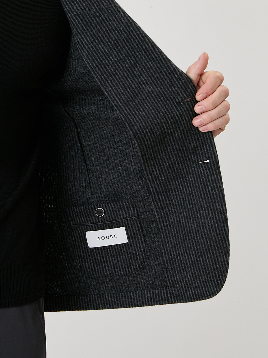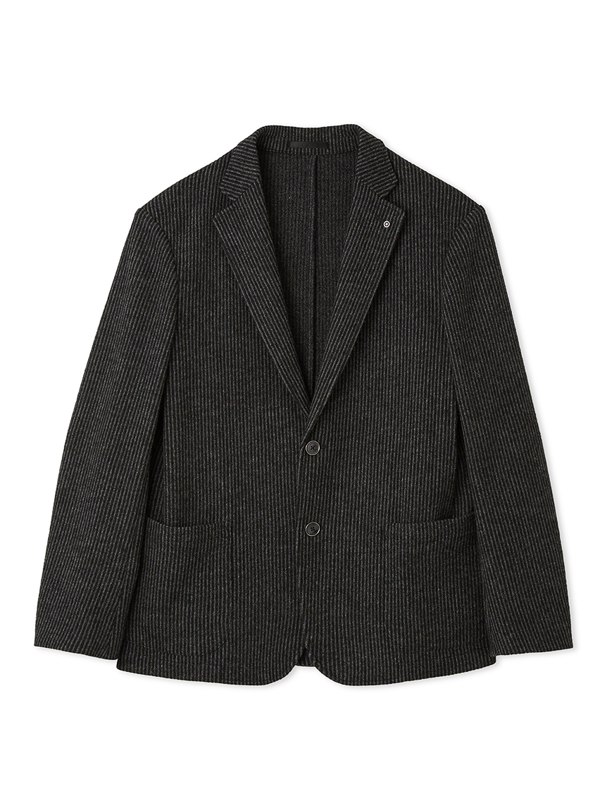 | 起毛感のあるストライプが特徴のジャケット 【 DESIGN POINT 】 気軽に着れる<楽ちん大人ジャケット>をテーマに掲げ、カジュアルアップが主流の中で品格と楽を体現できる大人なジャケットの提案。 温かみのある起毛ストライプ素材は、スタイリッシュな印象と柔らかな着心地を実現。 表面の起毛感や同系色のストライプ柄が上品なムードを引き立てます。 シルエットにも程よくゆとりを持たせており、スラックスからデニムまで、幅広いコーディネートを楽しめる汎用性の高いジャケットです。 【 FABRIC 】 起毛のかかったウール混の素材。 起毛感のある立体的な表情と、同系色で構成されたストライプが、上品な存在感を演出します。 ほどよいストレッチ性も備えており、ジャケット素材としても映える生地です。 |