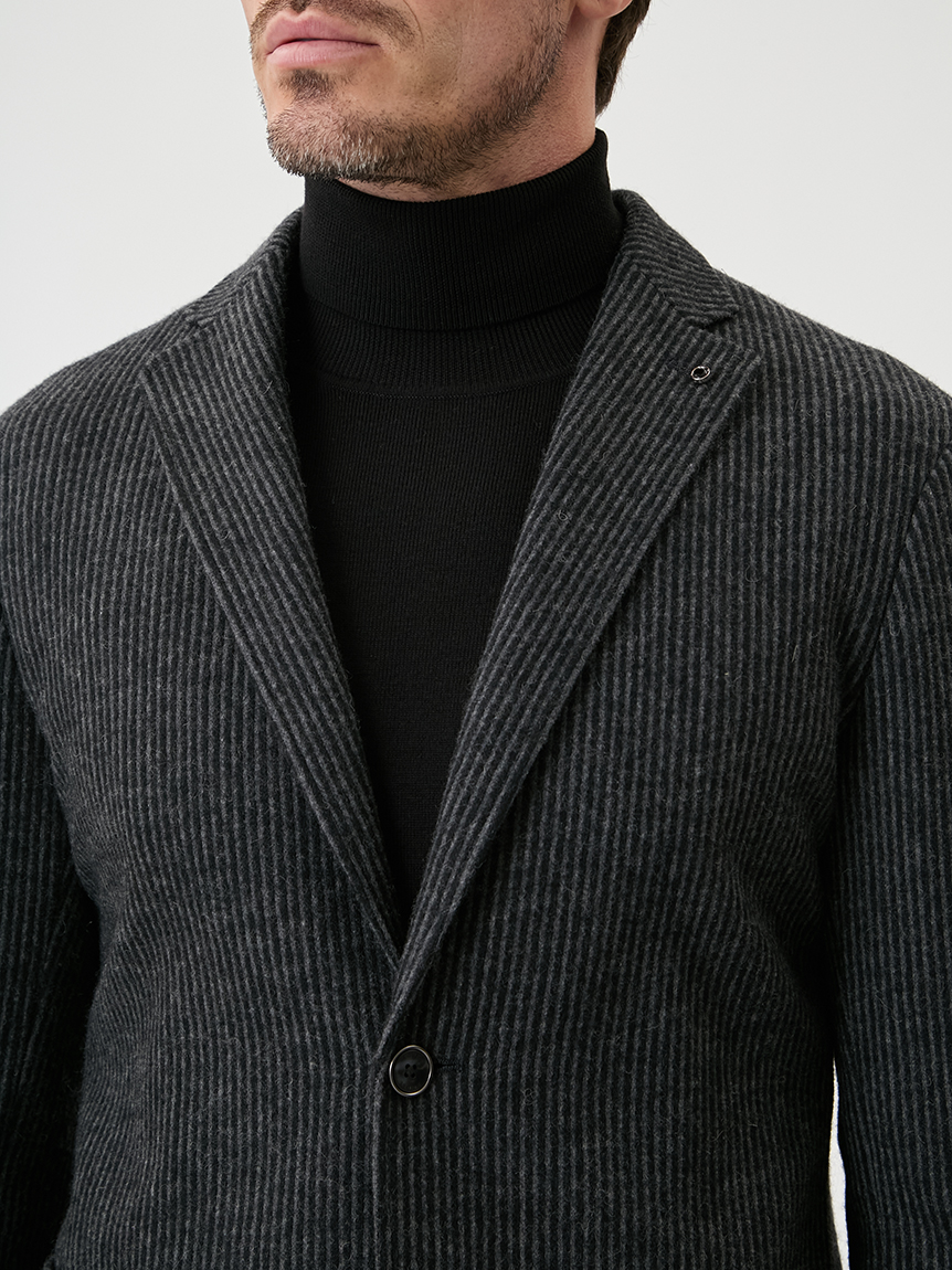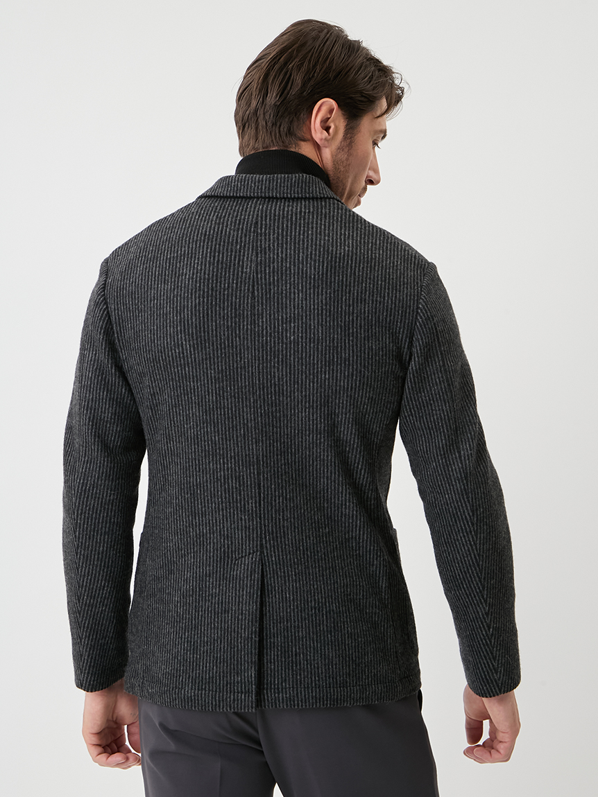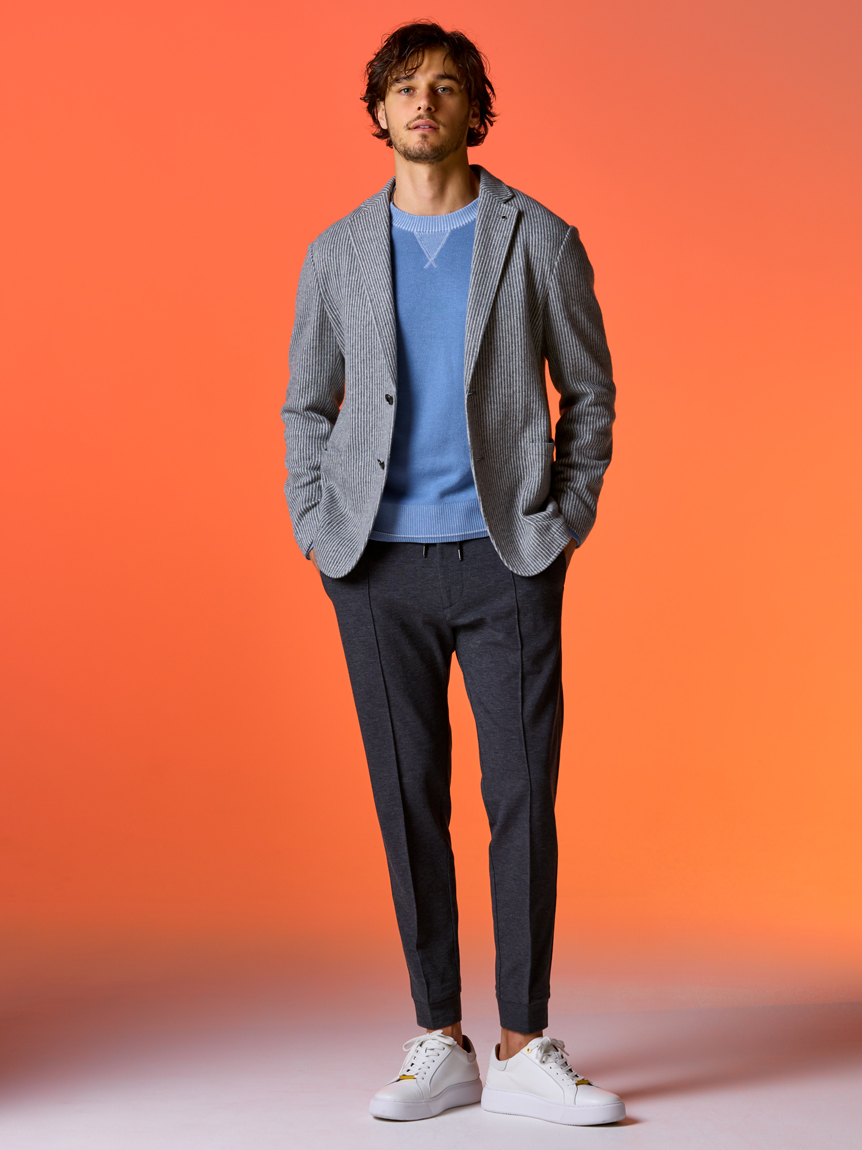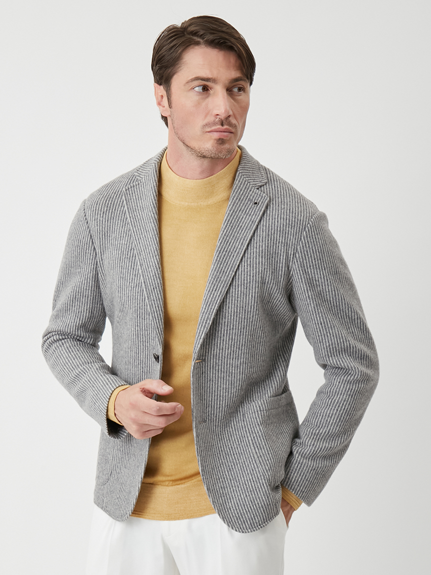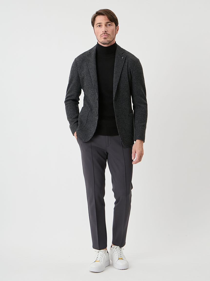 | 起毛感のあるストライプが特徴のジャケット 【 DESIGN POINT 】 気軽に着れる<楽ちん大人ジャケット>をテーマに掲げ、カジュアルアップが主流の中で品格と楽を体現できる大人なジャケットの提案。 温かみのある起毛ストライプ素材は、スタイリッシュな印象と柔らかな着心地を実現。 表面の起毛感や同系色のストライプ柄が上品なムードを引き立てます。 シルエットにも程よくゆとりを持たせており、スラックスからデニムまで、幅広いコーディネートを楽しめる汎用性の高いジャケットです。 【 FABRIC 】 起毛のかかったウール混の素材。 起毛感のある立体的な表情と、同系色で構成されたストライプが、上品な存在感を演出します。 ほどよいストレッチ性も備えており、ジャケット素材としても映える生地です。 |