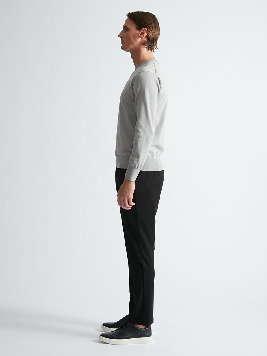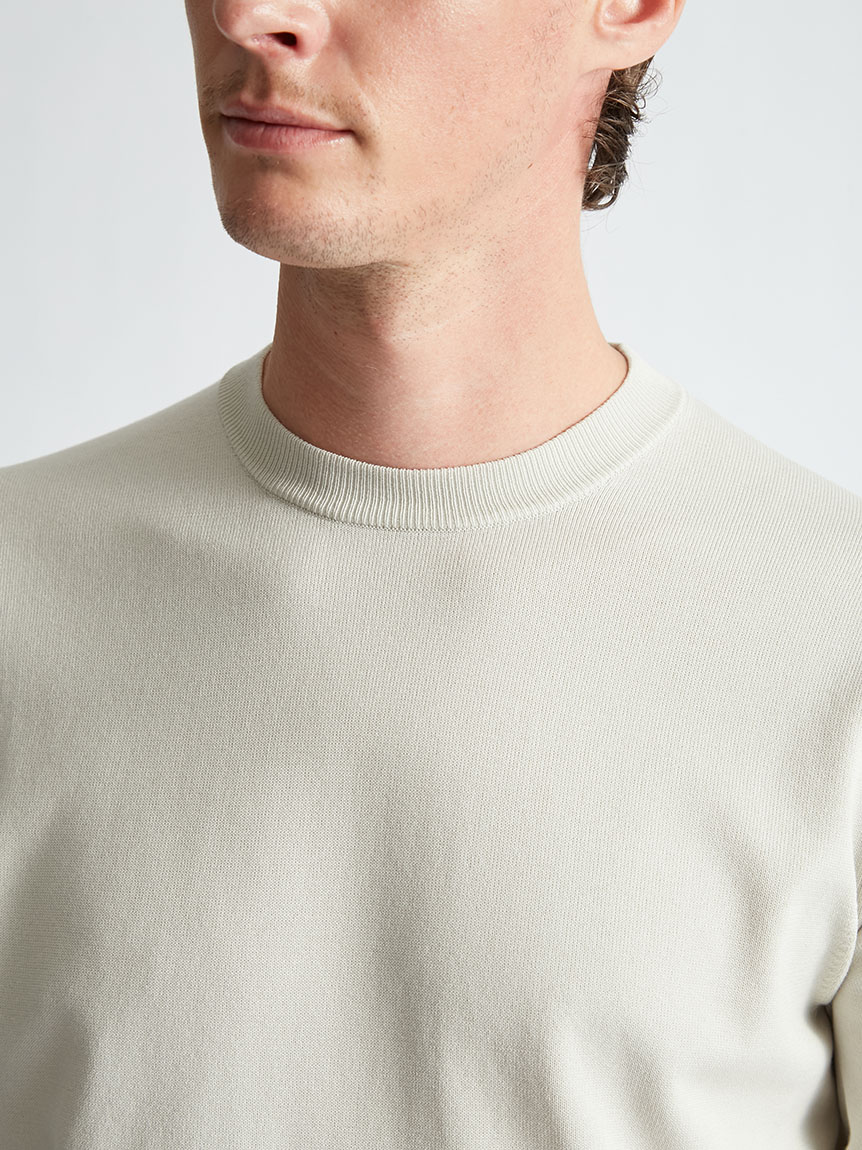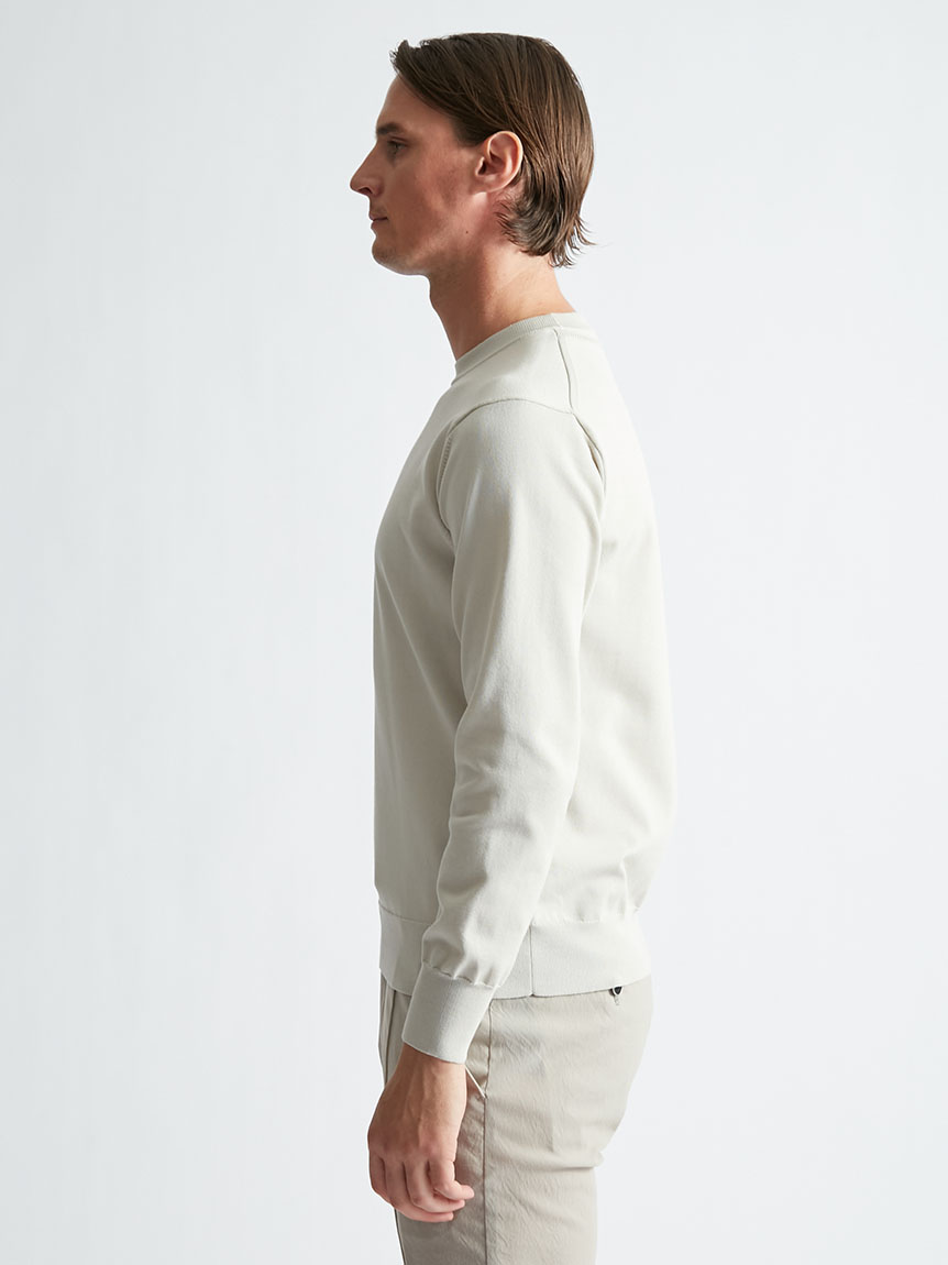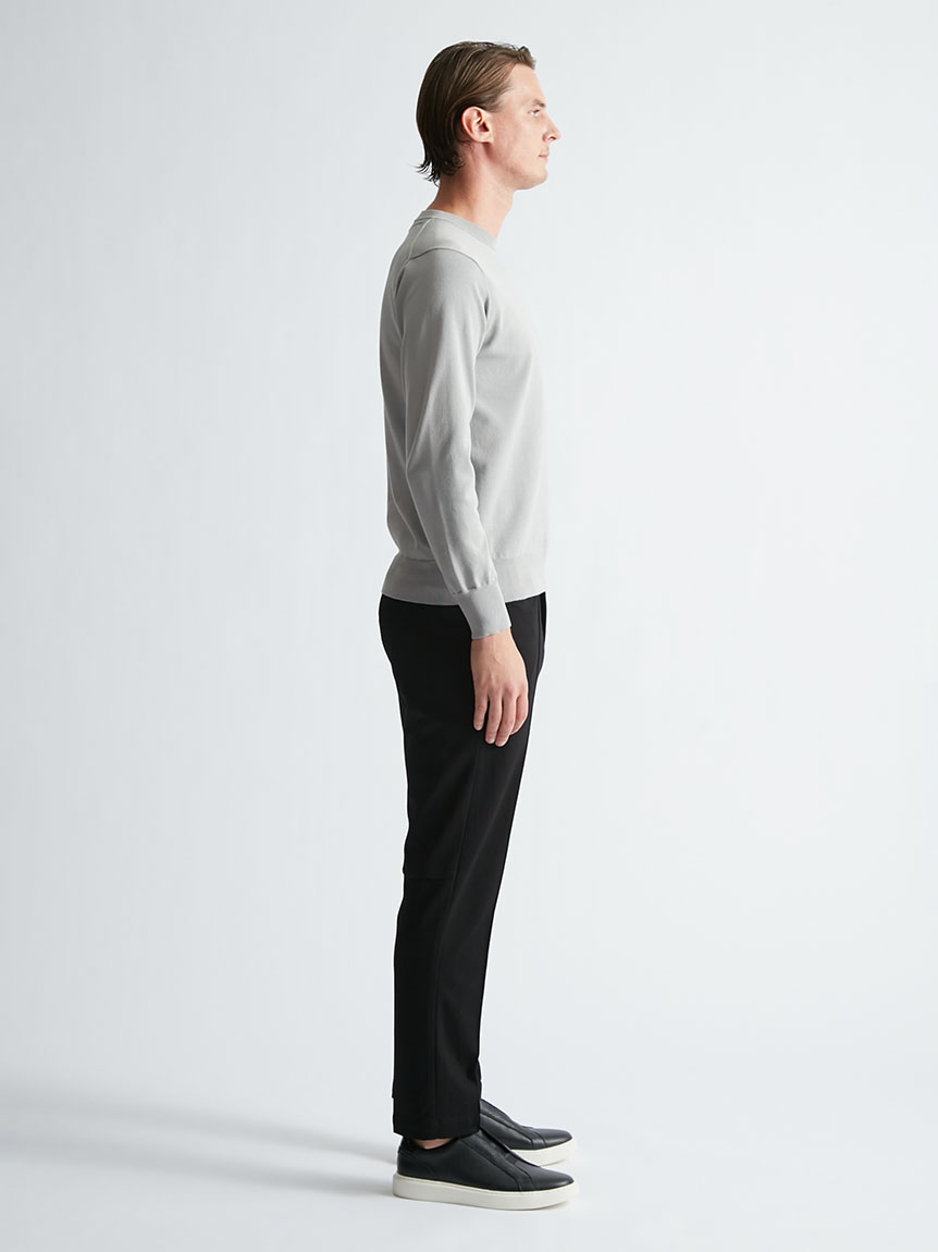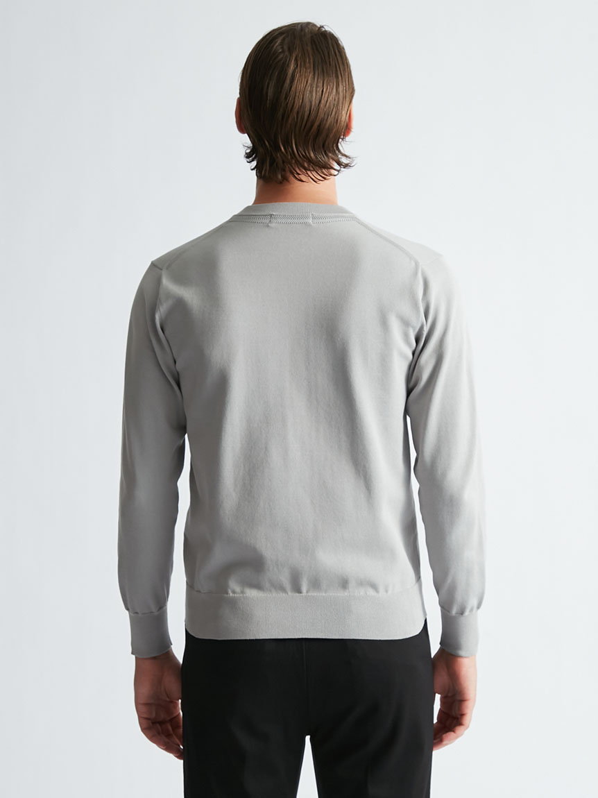 クルーネックは、ネックラインのリブ幅やテンションを繊細に調整し、詰まりすぎず開きすぎないバランスに。