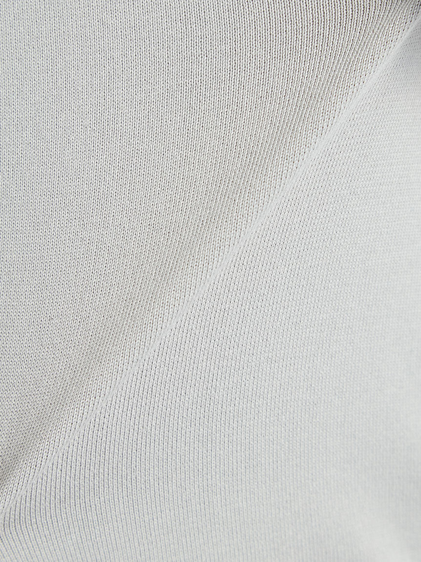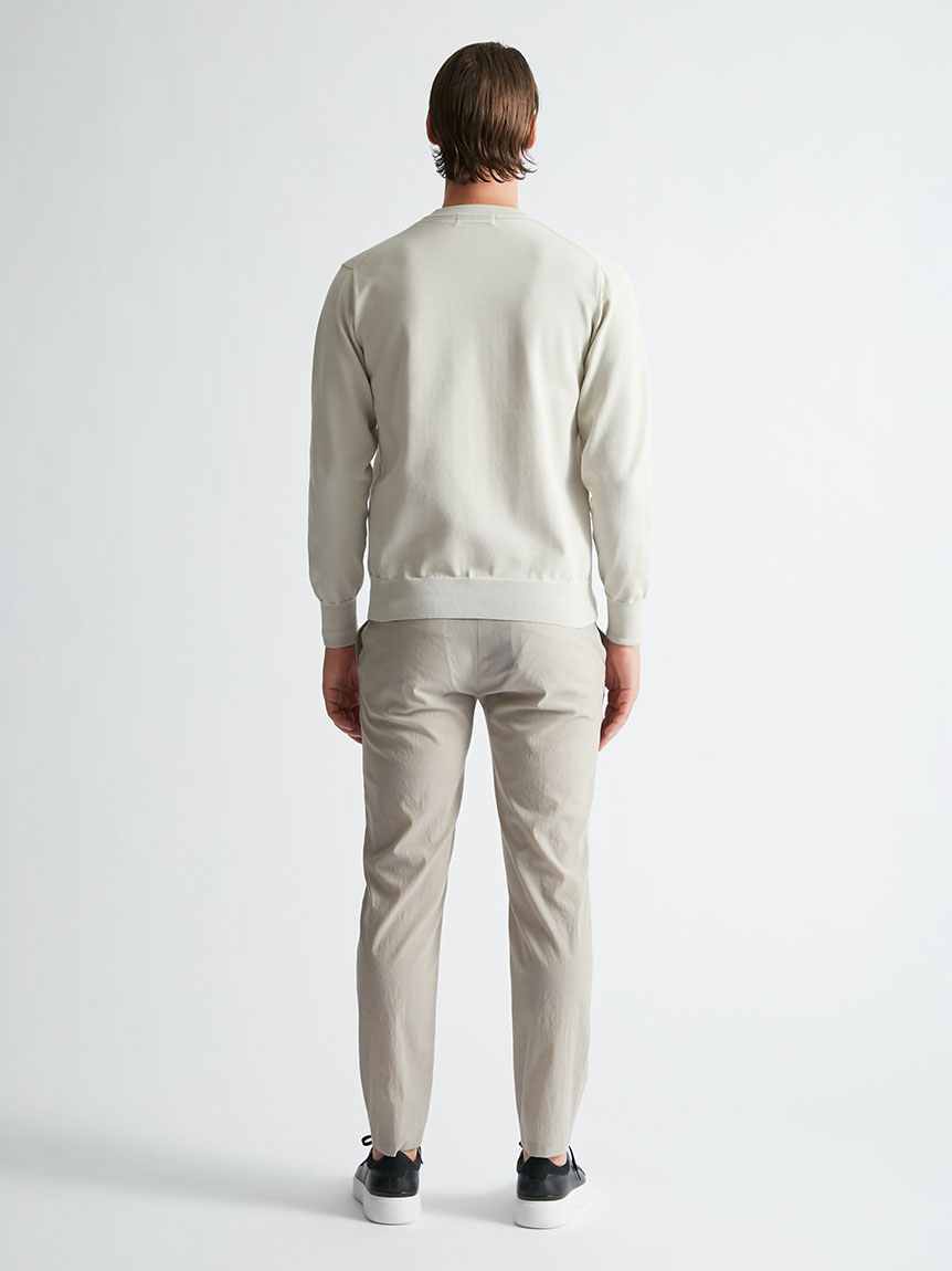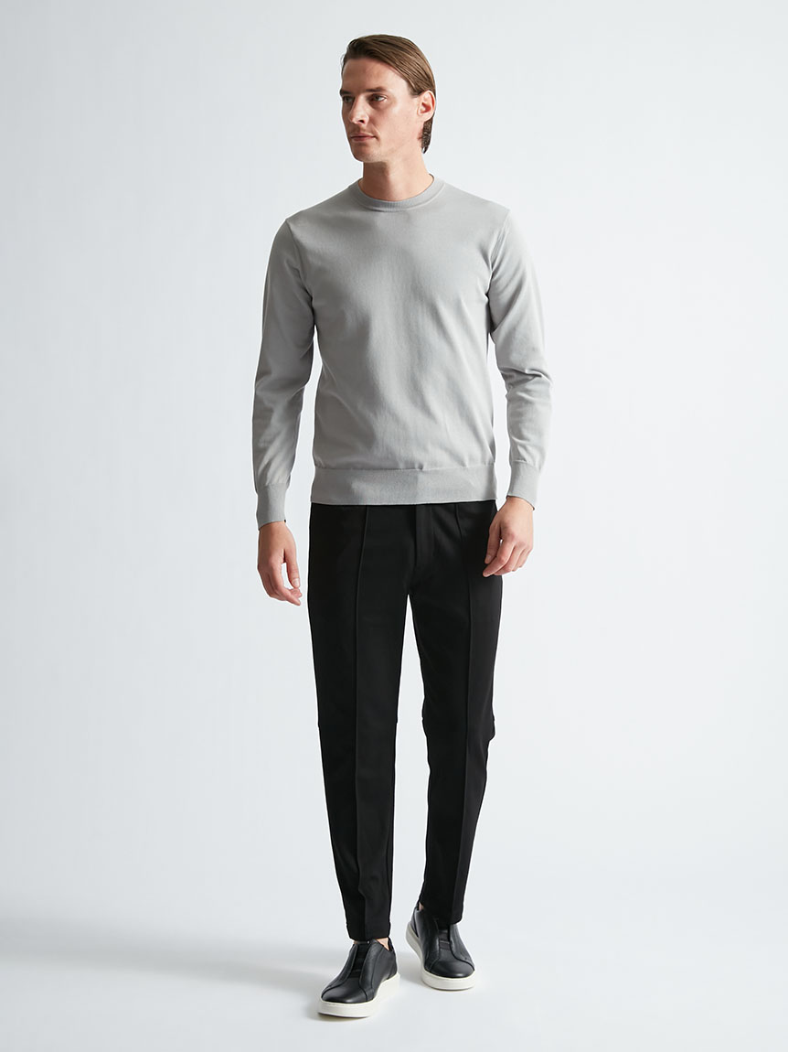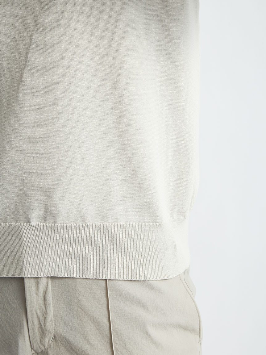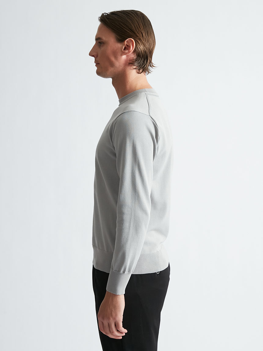 クルーネックは、ネックラインのリブ幅やテンションを繊細に調整し、詰まりすぎず開きすぎないバランスに。