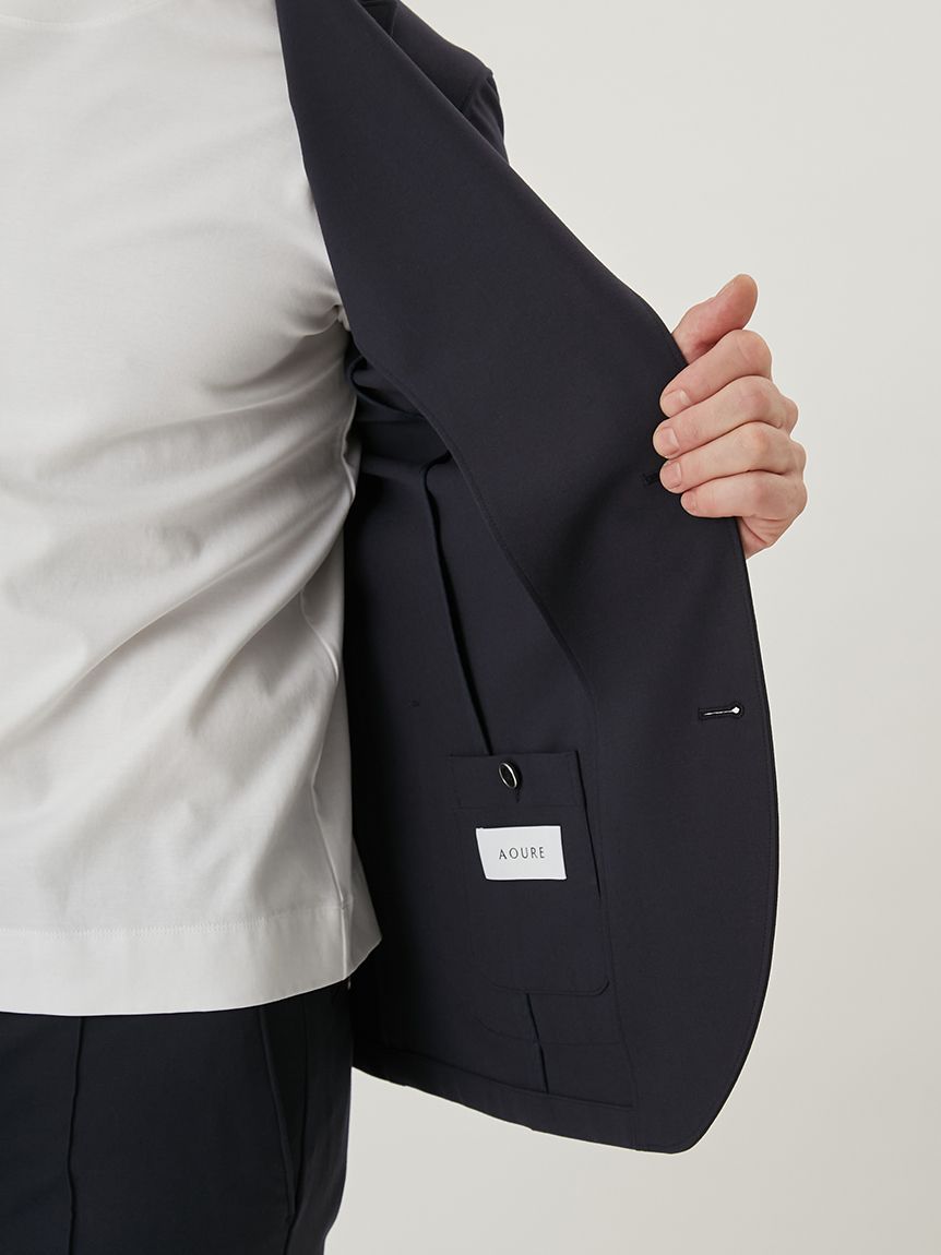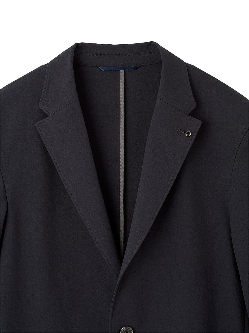 セットアップ対応可能なパンツのシルエットに合わせジャケットもコンパクトに設計し、シャープな顔に仕立てています。フロントのカッティング、腕まわりの設計にこだわり、スタイリッシュな印象にデザインしました。素材の伸縮性を存分にいかし、腕の可動域も広範囲にとれ、シャープなシルエットながら快適な着心地を実現しています。