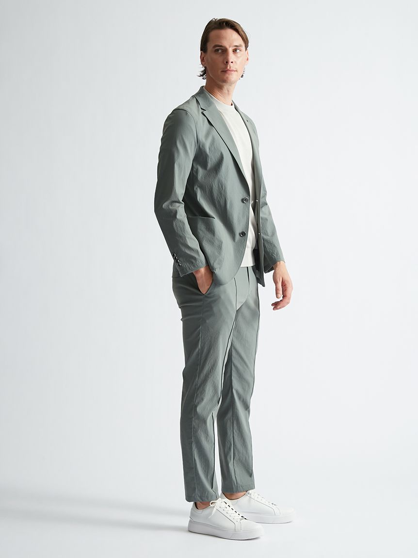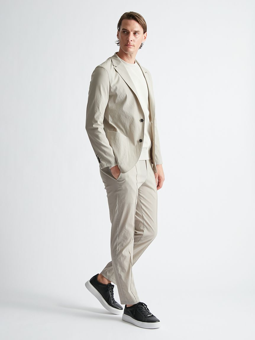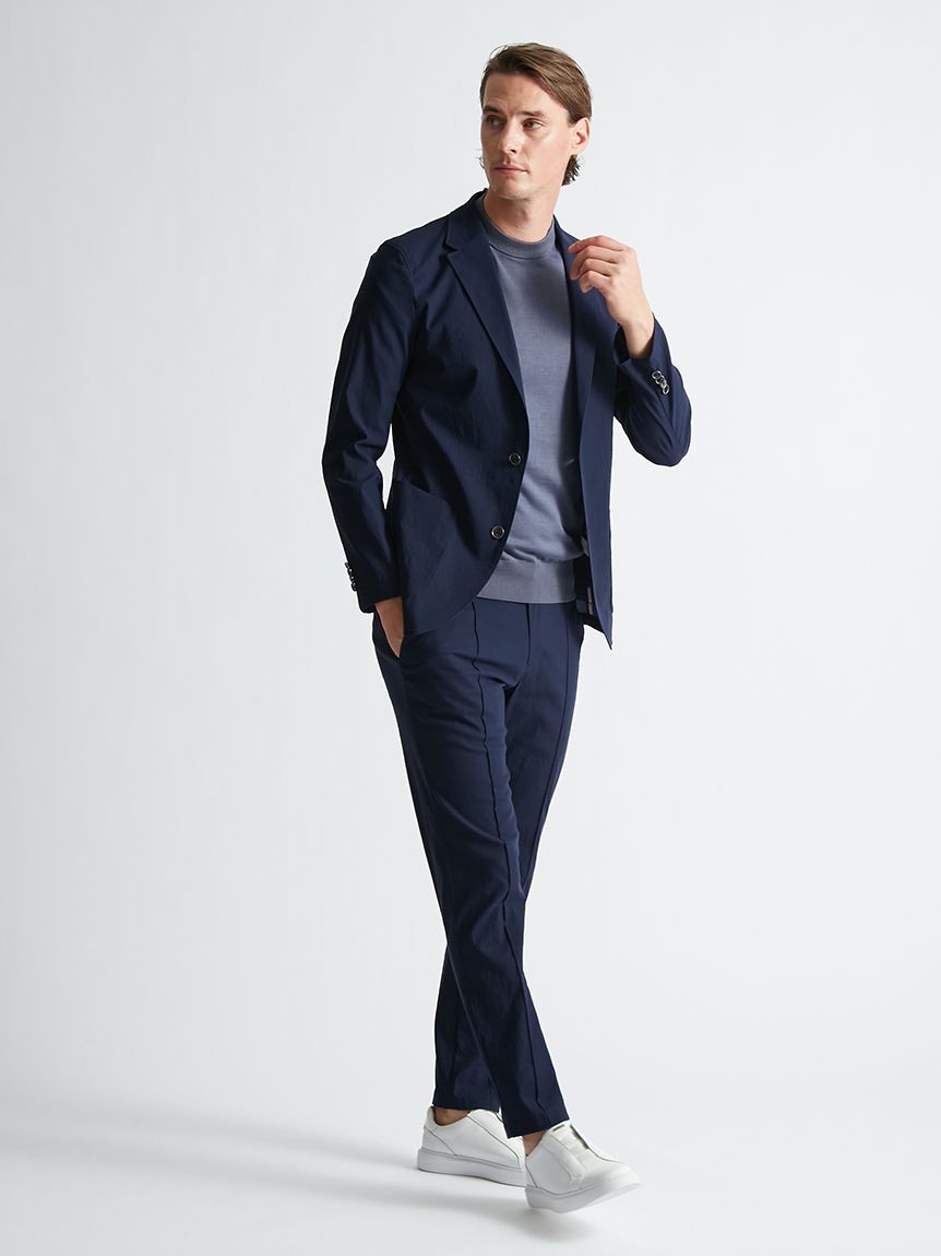 ニットのような光沢感とソフトなタッチ感は継承しつつ、イージーケア性をアップさせる進化を遂げた。以前よりもほんの少し糸番手を太くし、絶妙な肉感としっかりさを加えて着用時や洗濯時におきるしわを軽減。原料は毛羽の少ない糸に更にガス焼き工程を繰り返しクリアな表情に仕上げた。最終仕上げにシルケットをすることで綺麗な艶感ももたせました。