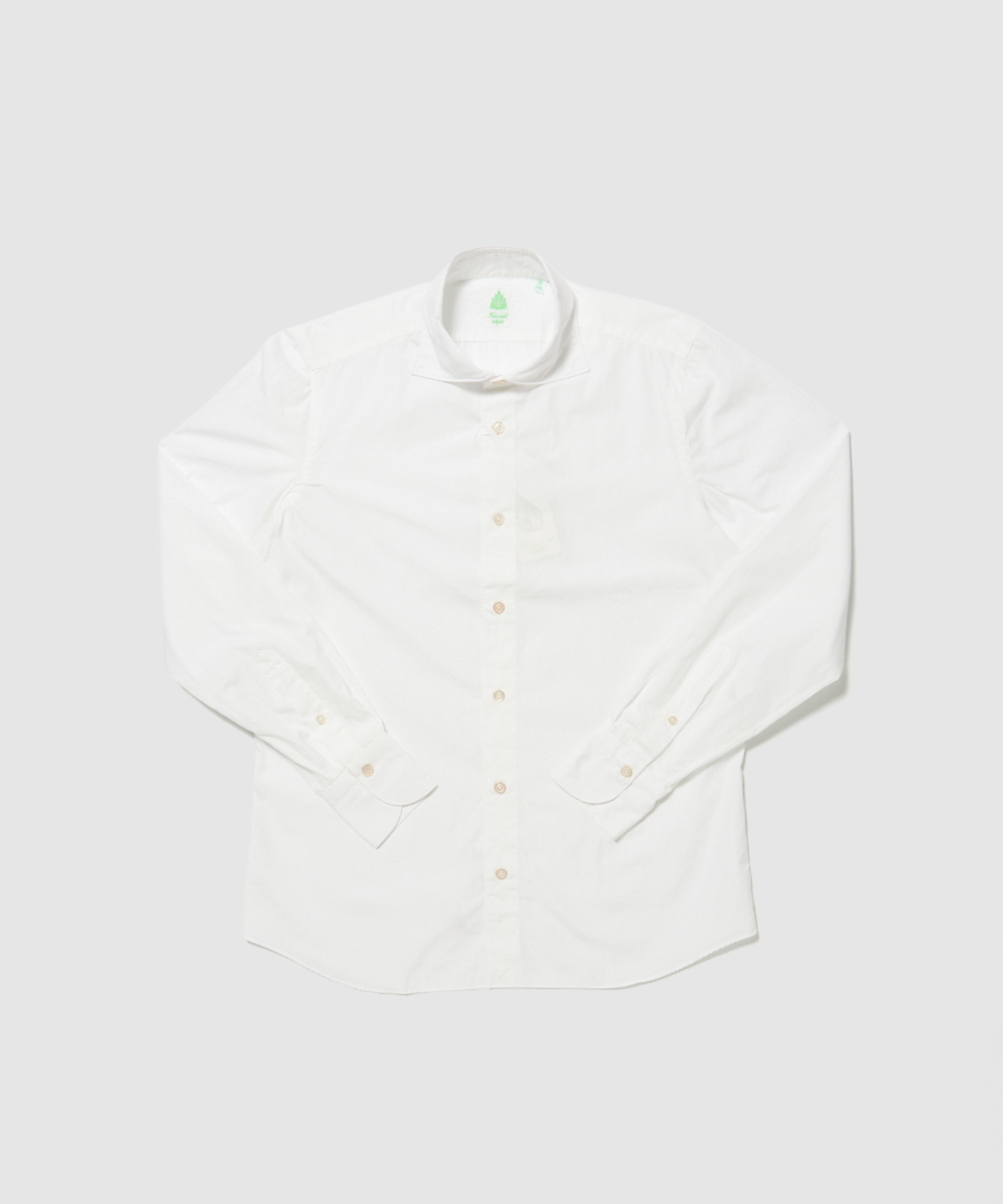カジュアルラインは洗いのかかったナチュラルな風合いが特徴で、アームホール、ボタン、ガゼット部分は熟練した職人の手によるハンドメイド。ドレスラインはさらにハンドポイントが増え、ハンドメイドならではの柔らかな風合いとストレッチのような着心地が、90年以上の歴史を誇る老舗シャツメーカーフィナモレの大きな特徴です。