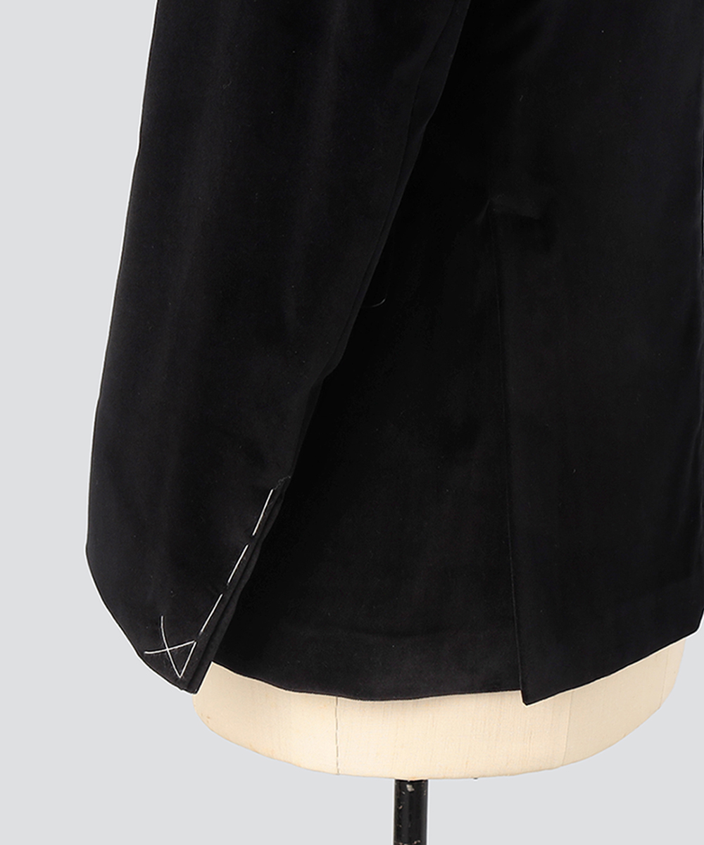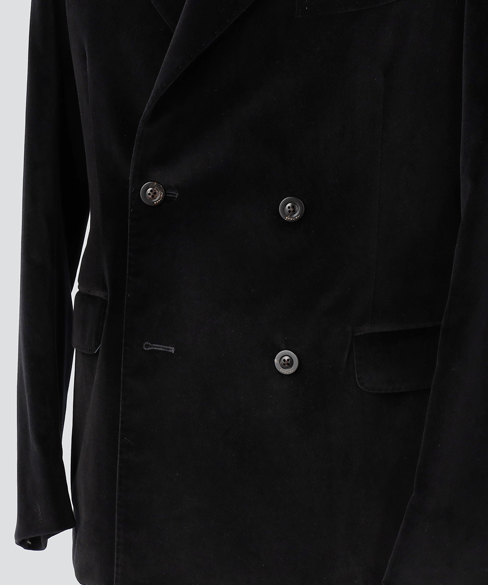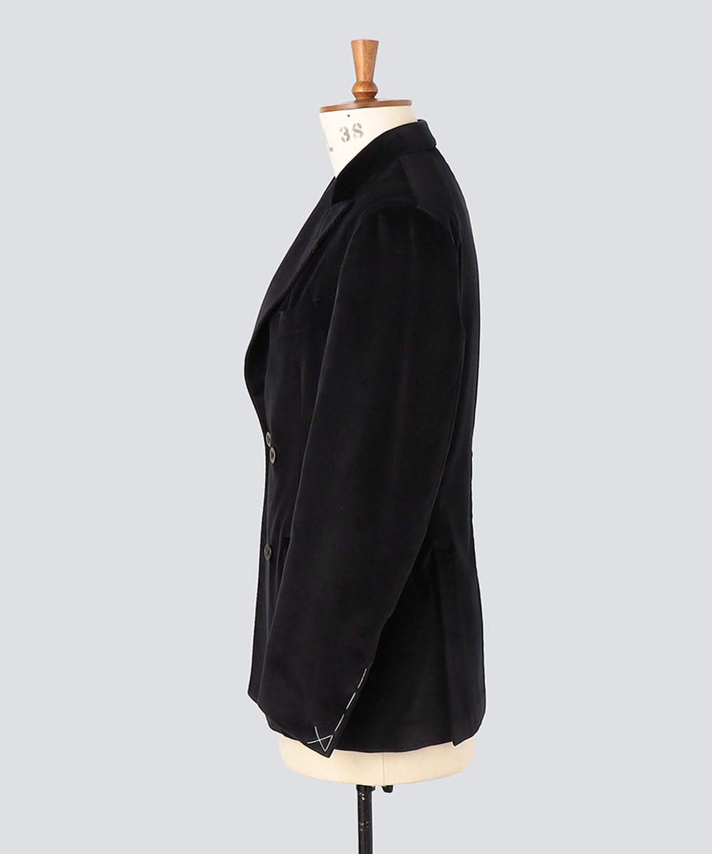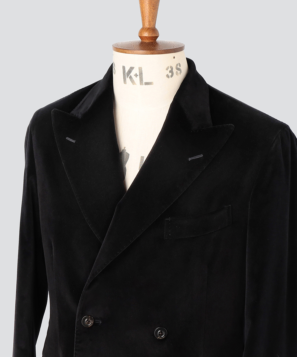 ディテールは、4つボタン、ダブルブレスト、ピークドラペル、バルカポケット、2パッチポケット、サイドベンツ、袖口アンフィニッシュとなります。
