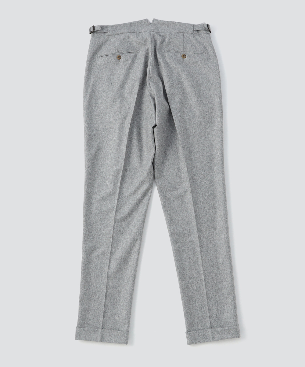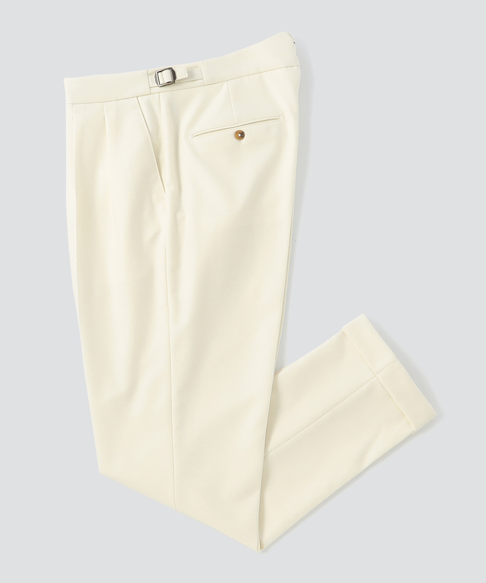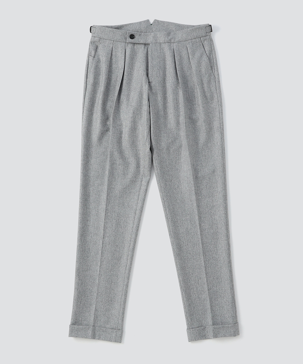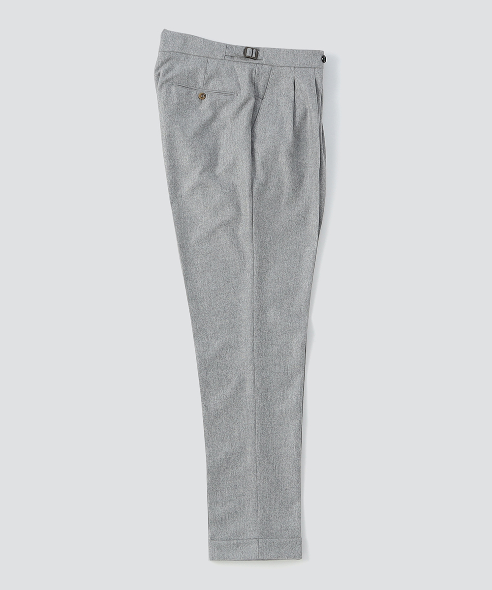 2プリーツが入りサイドアジャスターが付くクラシカルな仕様で、ゆったりとした腰回りと裾口にかけての美しいテーパードが目を惹くモダンクラシックな表情が特徴です。