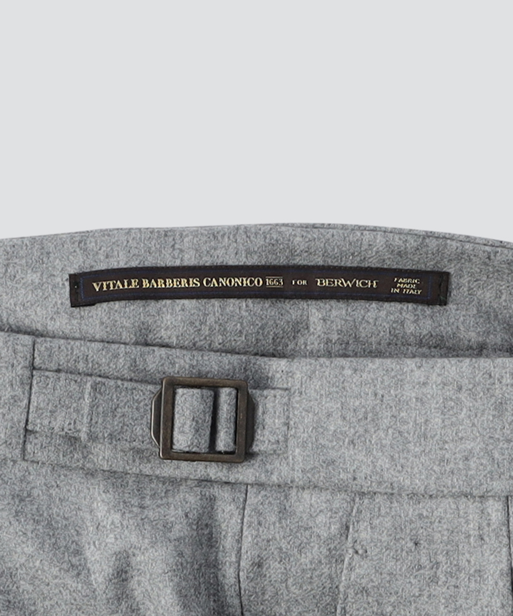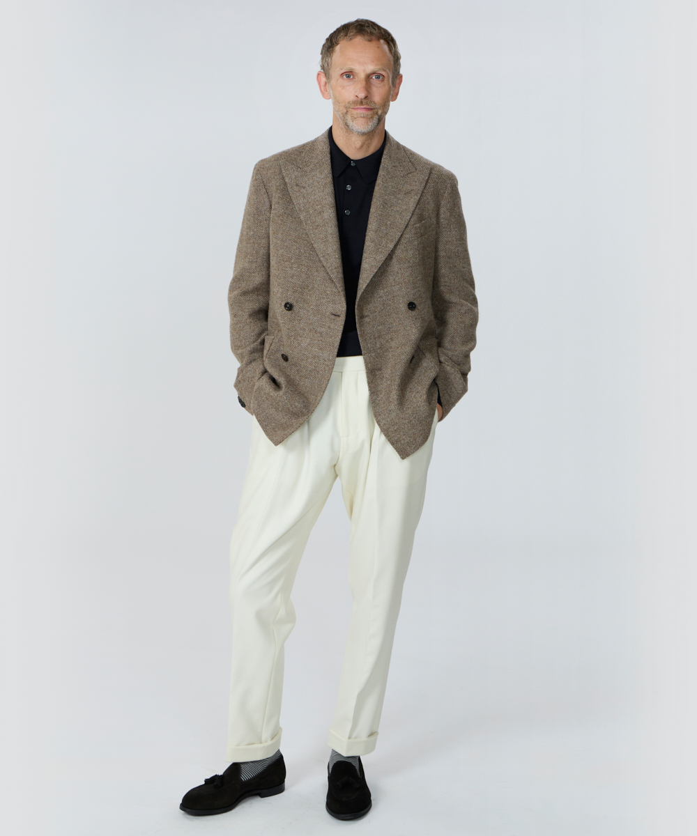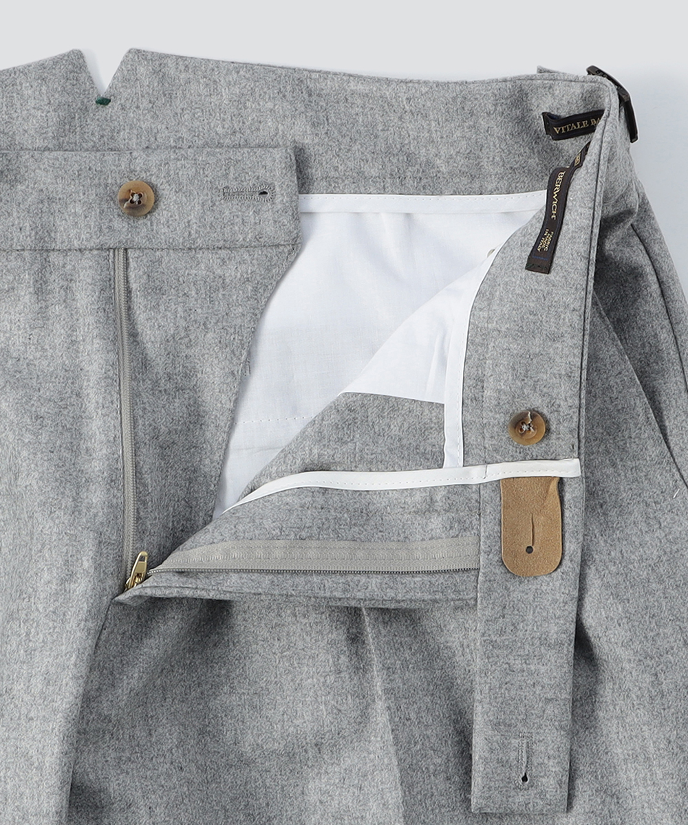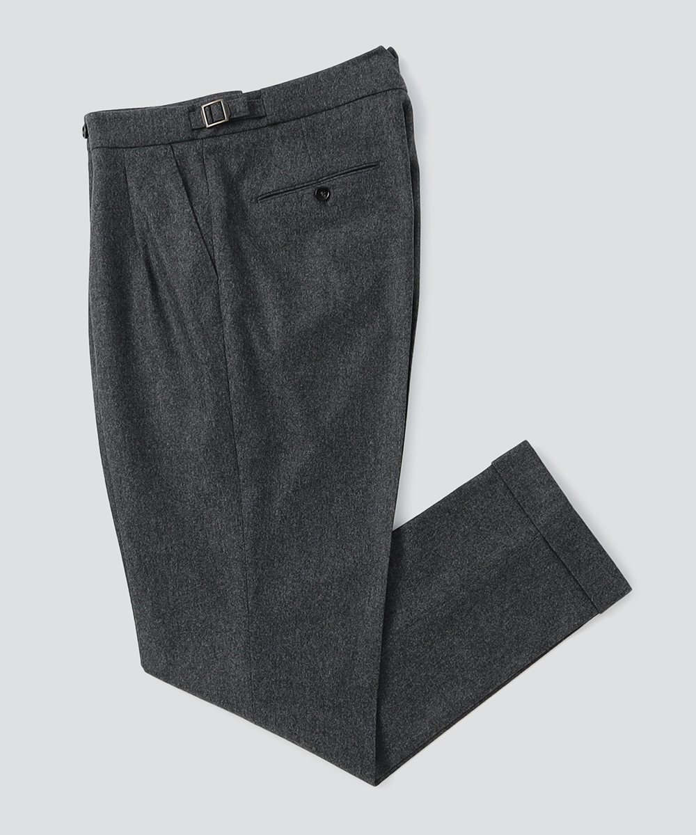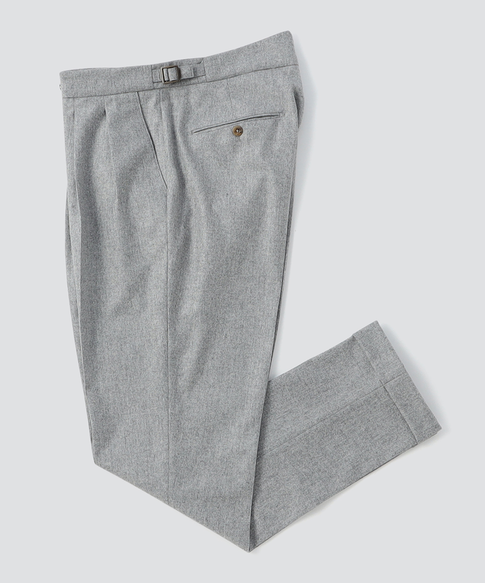 2プリーツが入りサイドアジャスターが付くクラシカルな仕様で、ゆったりとした腰回りと裾口にかけての美しいテーパードが目を惹くモダンクラシックな表情が特徴です。