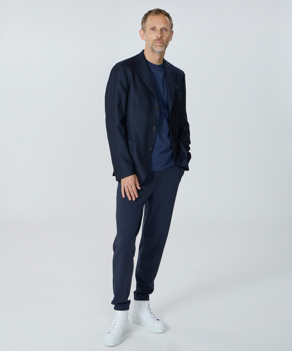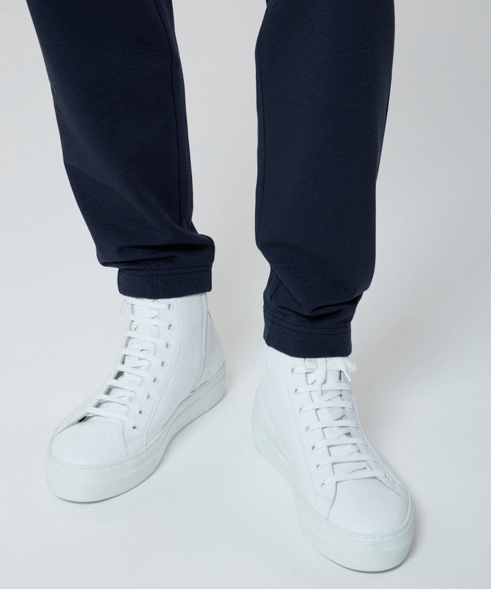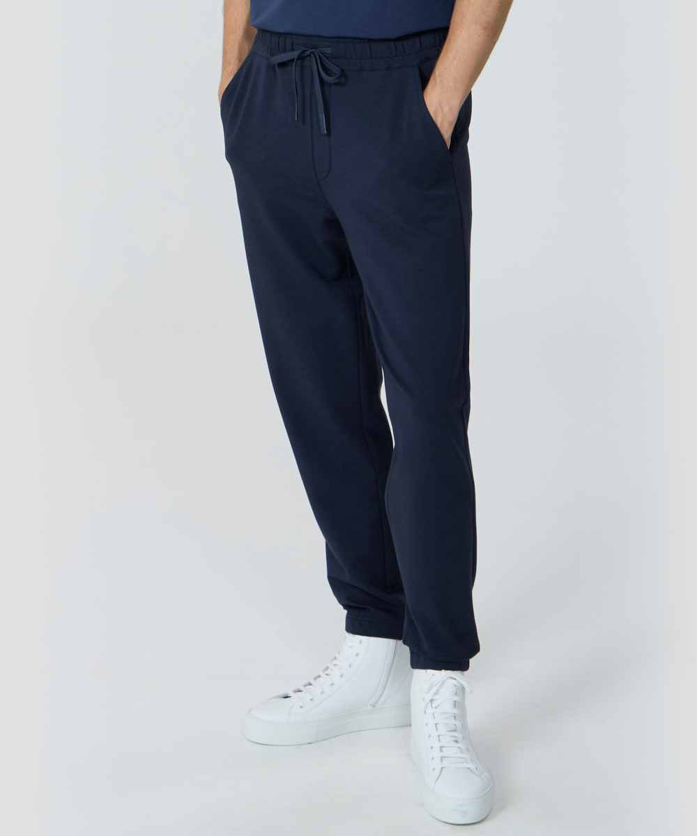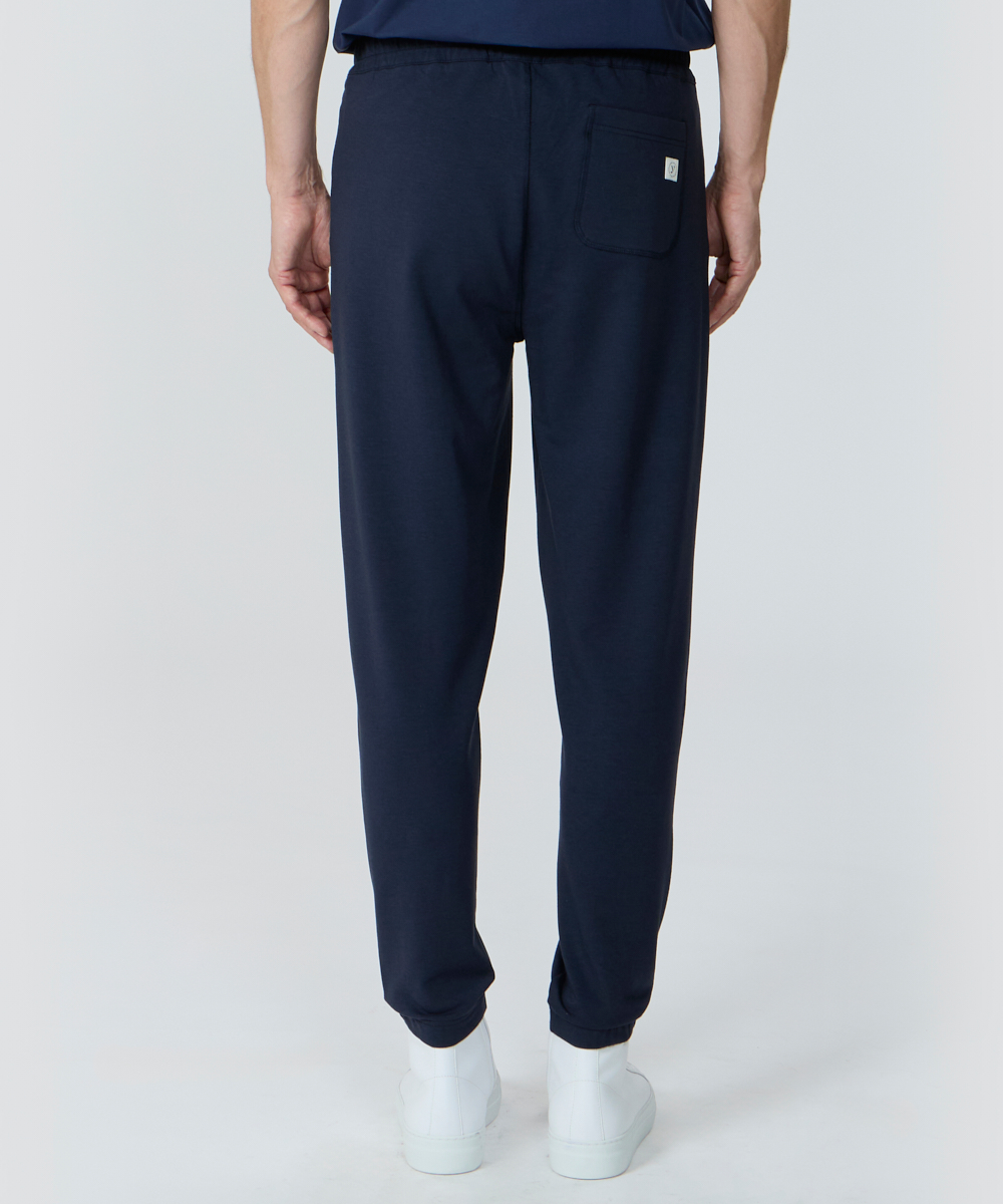 スリムなテーパードシルエットなので美脚効果があり、スウェットというも字面から受ける印象とは全く違う、オーバーミドルに相応しい品格を備えた仕上がりになっています。