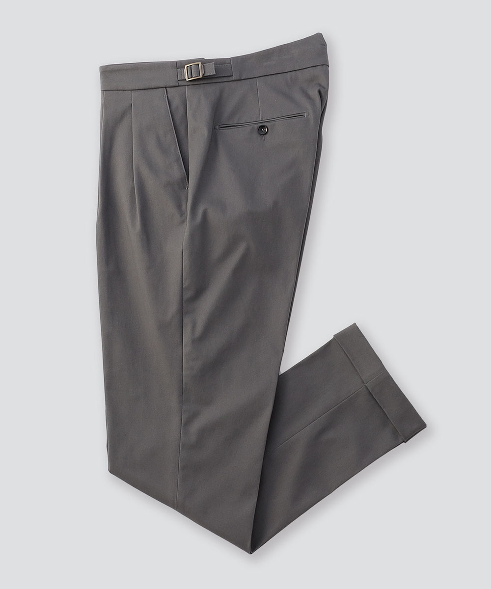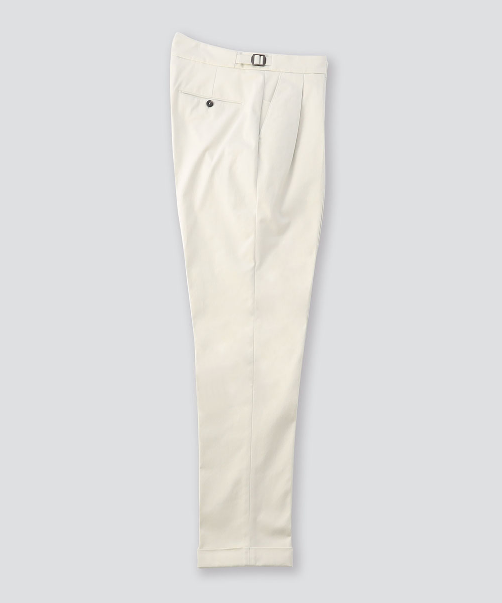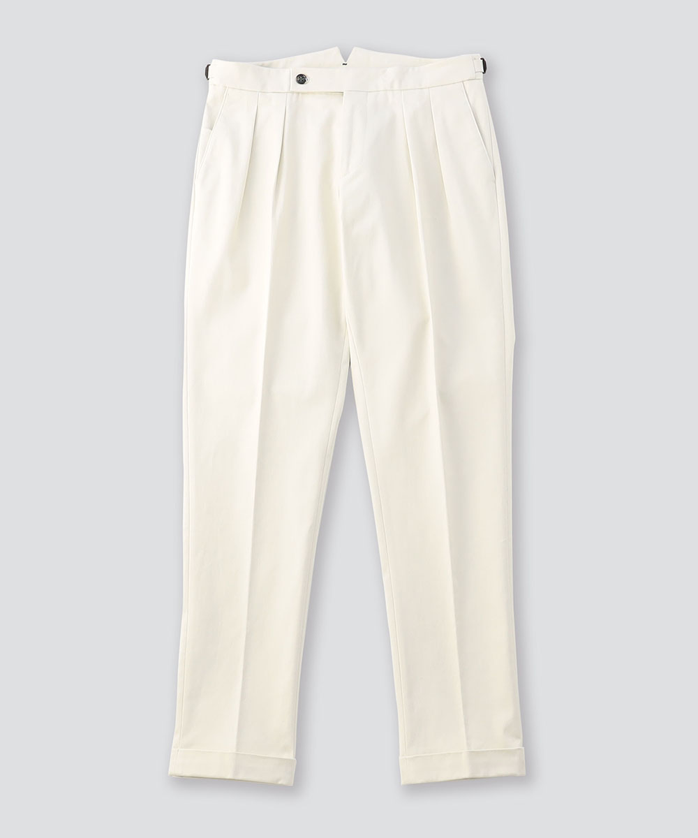 2プリーツが入りサイドアジャスターが付くクラシカルな仕様で、ゆったりとした腰回りと裾口にかけての美しいテーパードが目を惹くモダンクラシックな表情が特徴です。