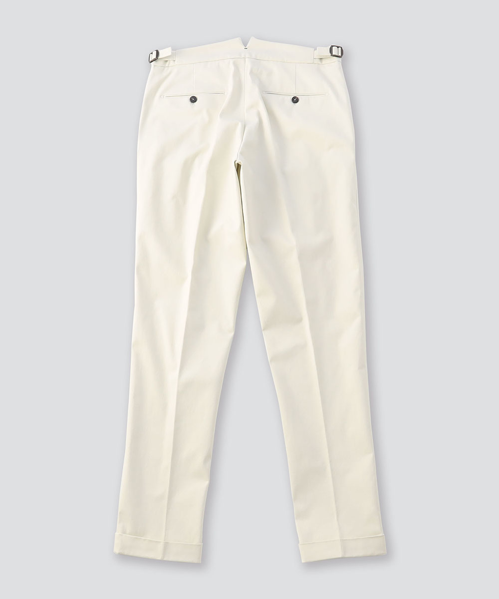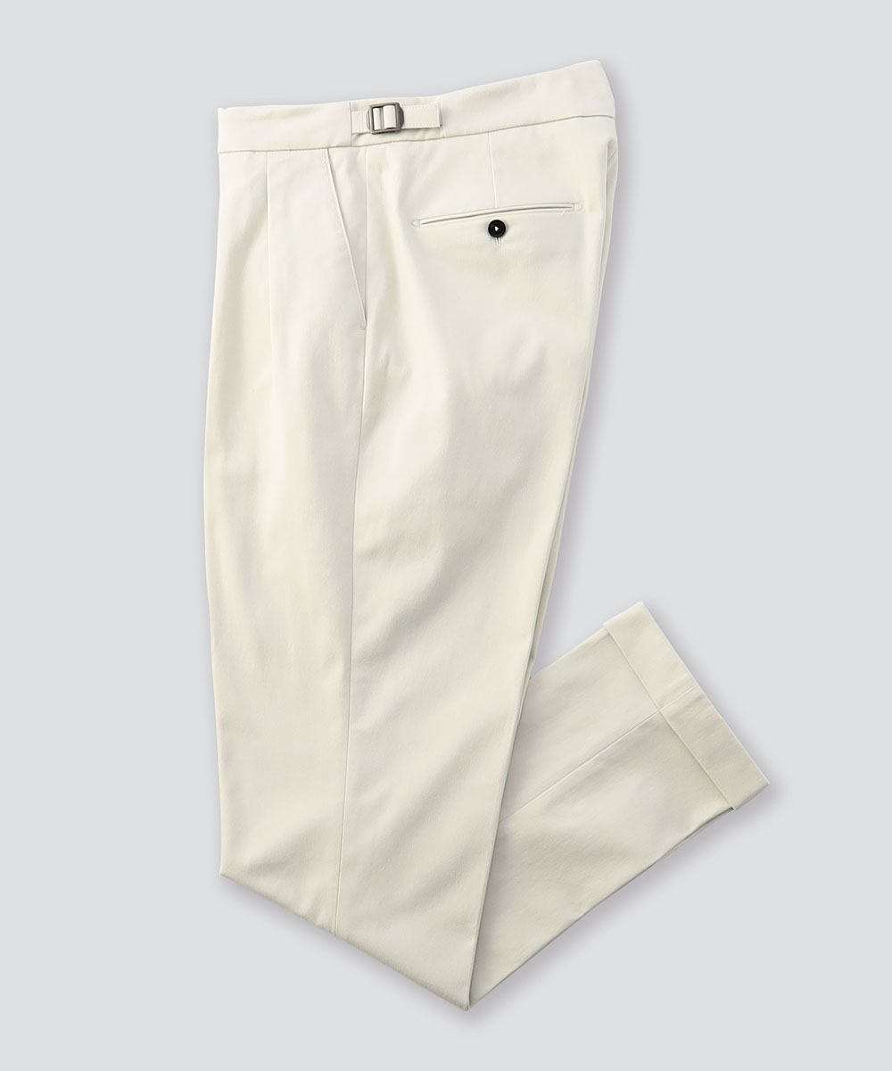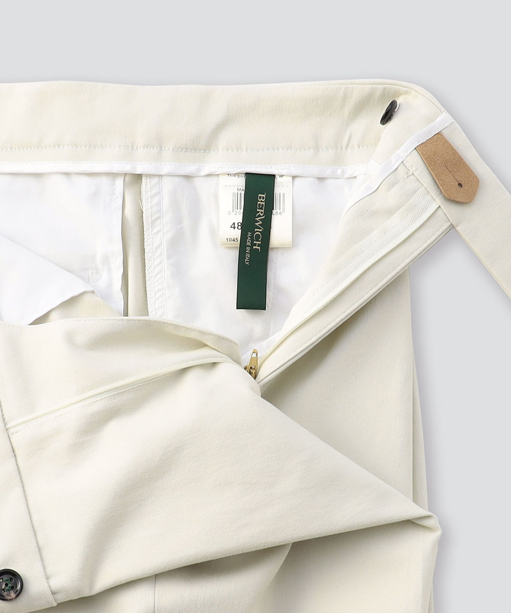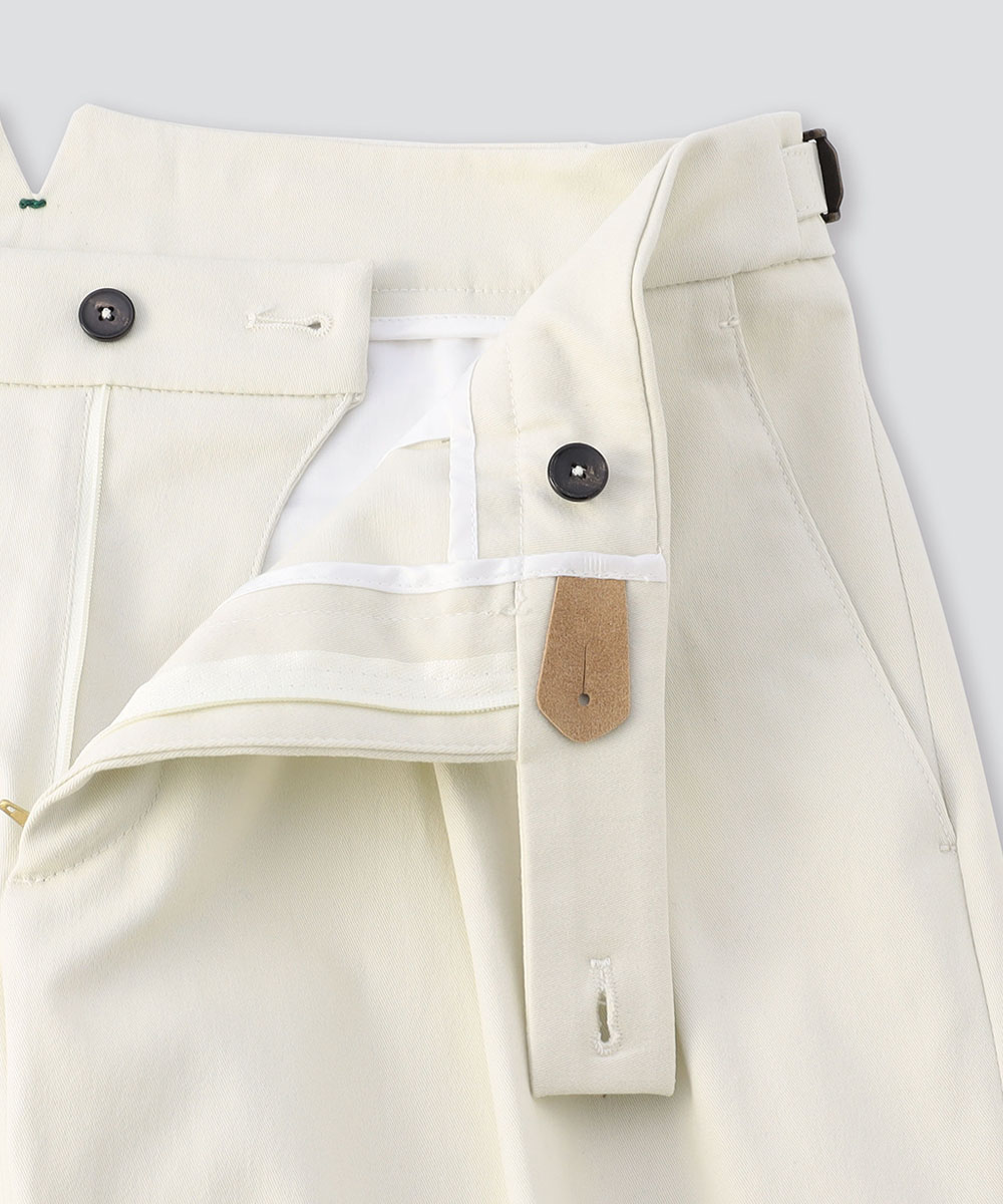 2プリーツが入りサイドアジャスターが付くクラシカルな仕様で、ゆったりとした腰回りと裾口にかけての美しいテーパードが目を惹くモダンクラシックな表情が特徴です。