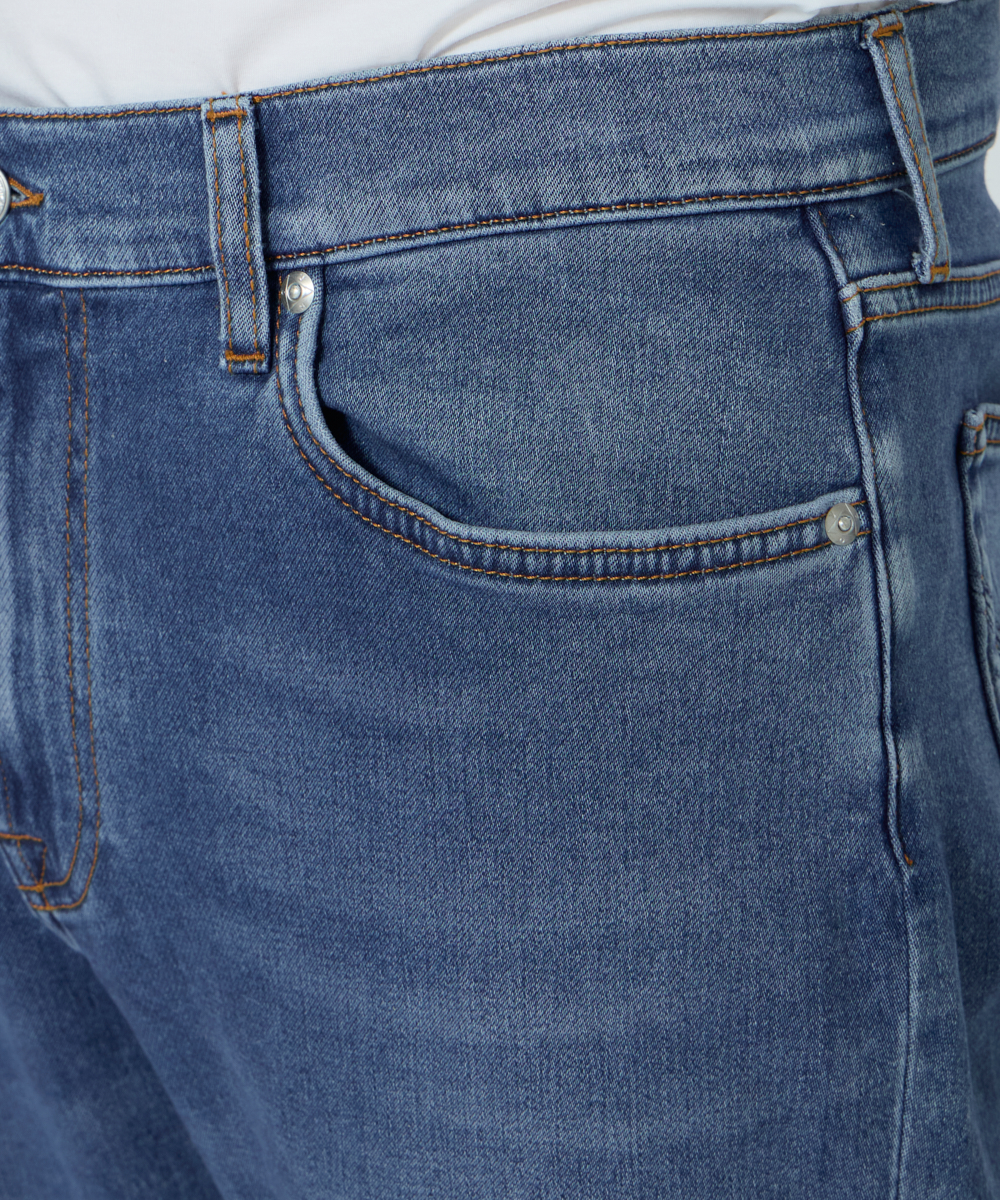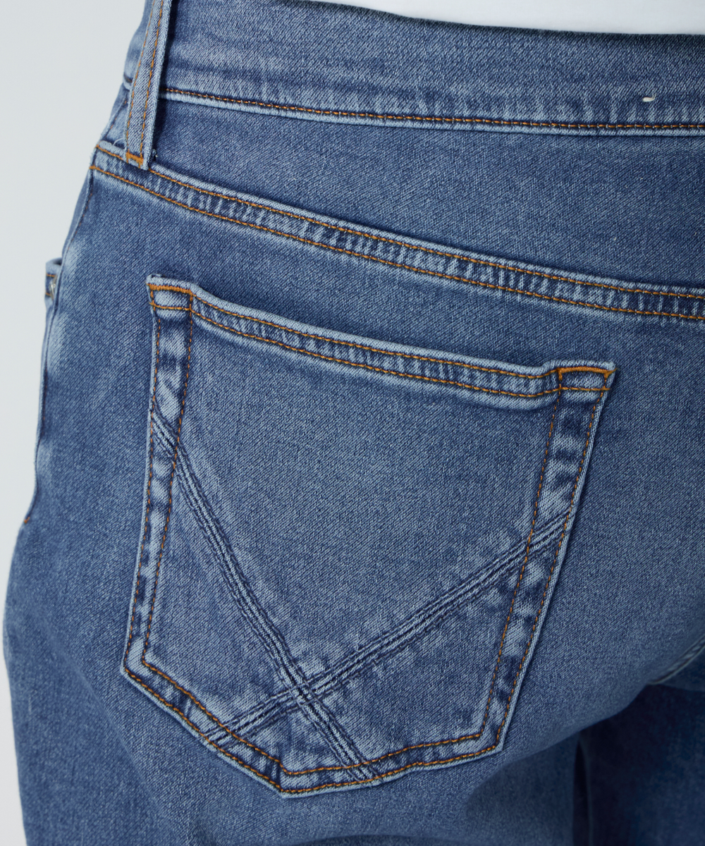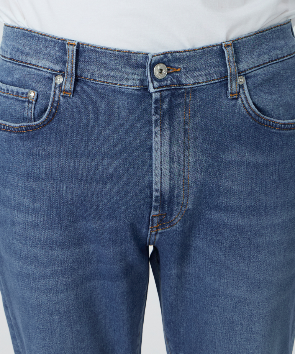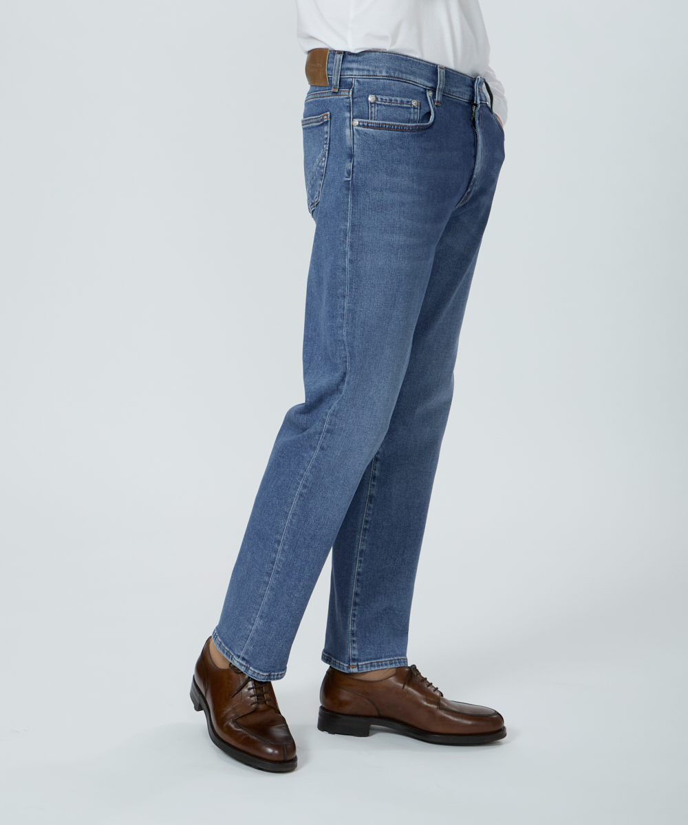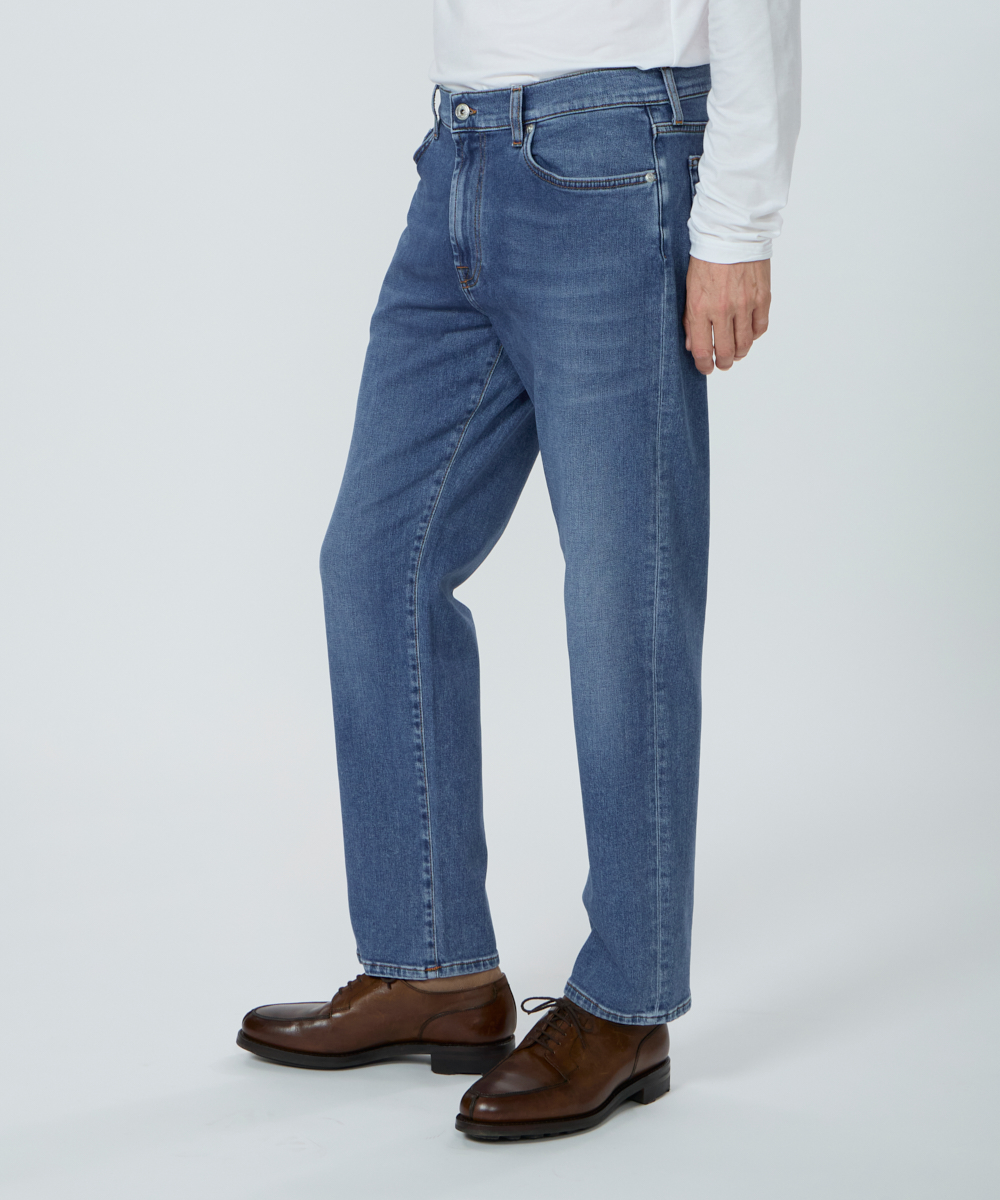 定番人気モデル『LEONARDO(レオナルド)』と比べ、股上はやや深く、ワタリ周りには程よくリラックス感を持たせ、膝下からは適度なテーパードの効いた、大人の方が履いていただきやすいレギュラーフィットデニムに仕上げています。