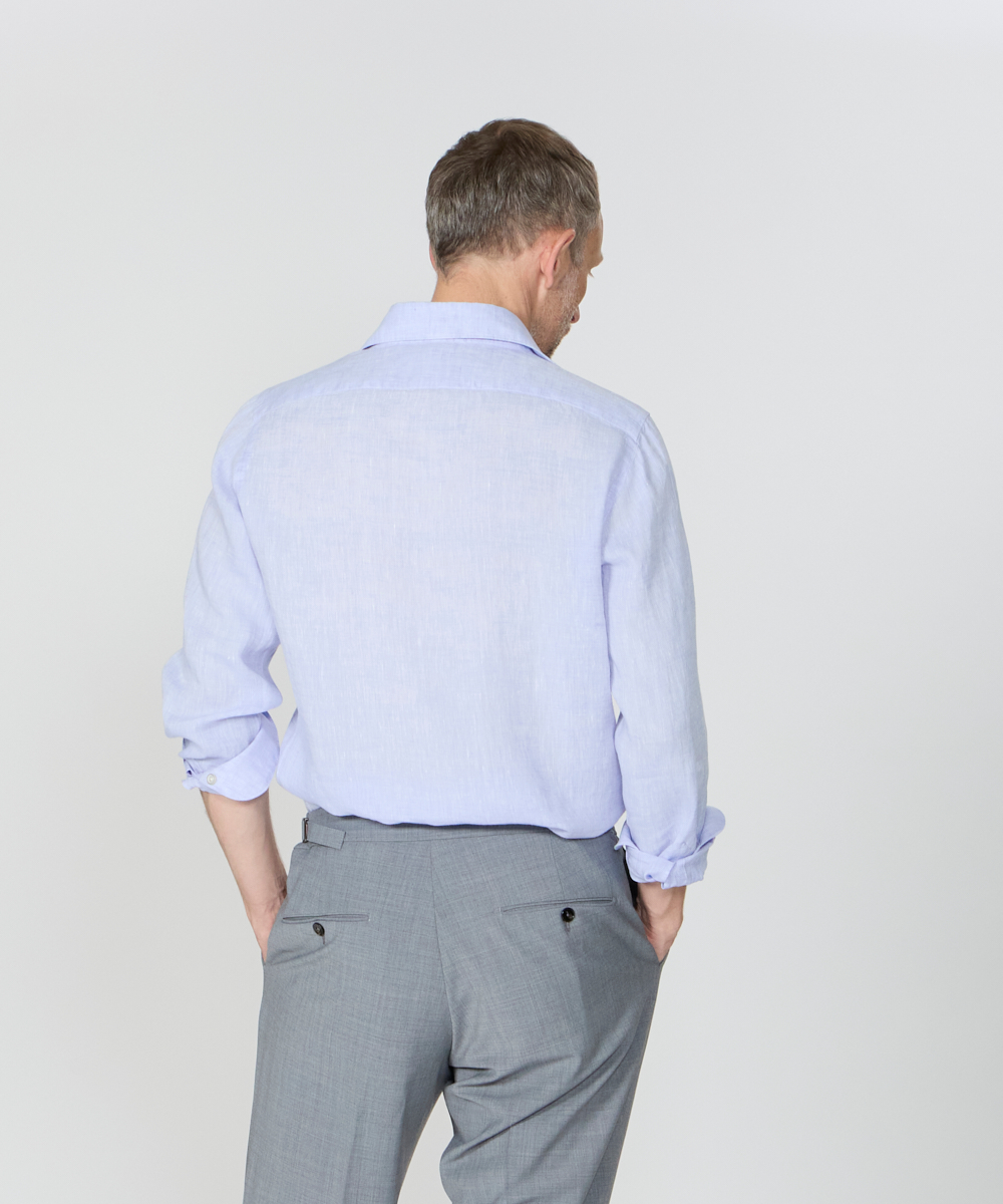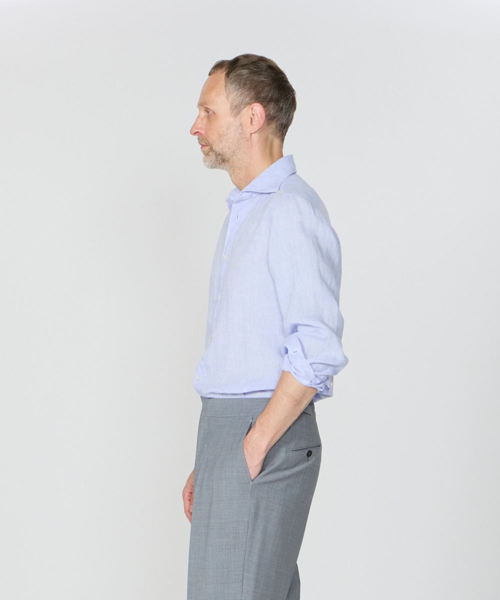 袖付け・ボタン付け・ガゼット付けの3工程をハンドメイドで仕上げ、手縫いならではの柔らかな表情と、動きを妨げない独自のパターン設計により、他にはない快適な着心地を実現。肩幅は通常よりややコンパクトに設計しながら、「いせ込み」と前振りの袖付けを組み合わせることで、十分な可動域を確保しており、見た目のシャープですっきりとした印象をあたえますが、まったくストレスを感じさせない着用感が魅力です。身体に自然にフィットしつつ、程よくリラックスしたシルエットは、タックアウトでも美しく映えるよう計算されており、カジュアルからきちんと感のあるスタイリングまで幅広く対応します。