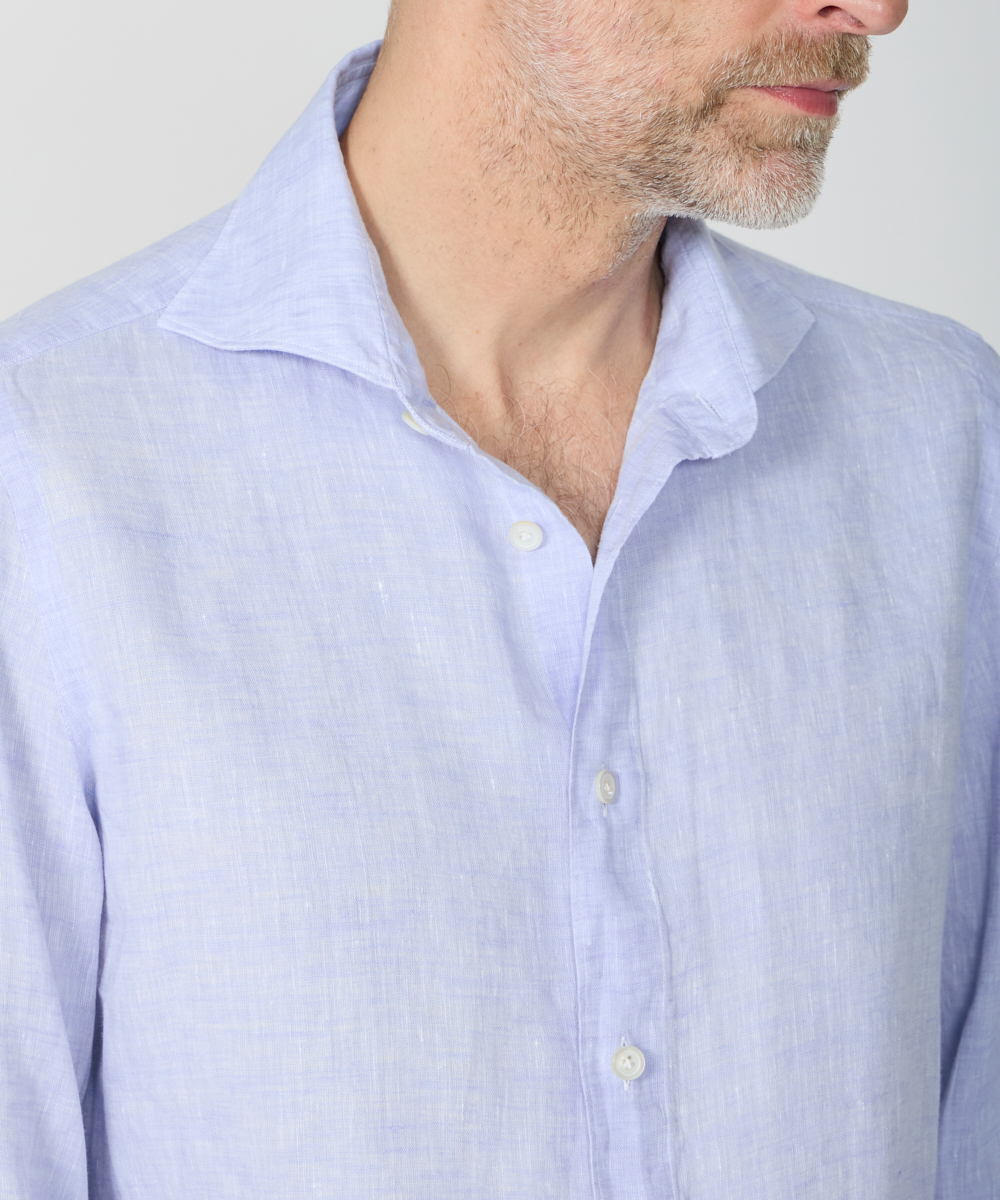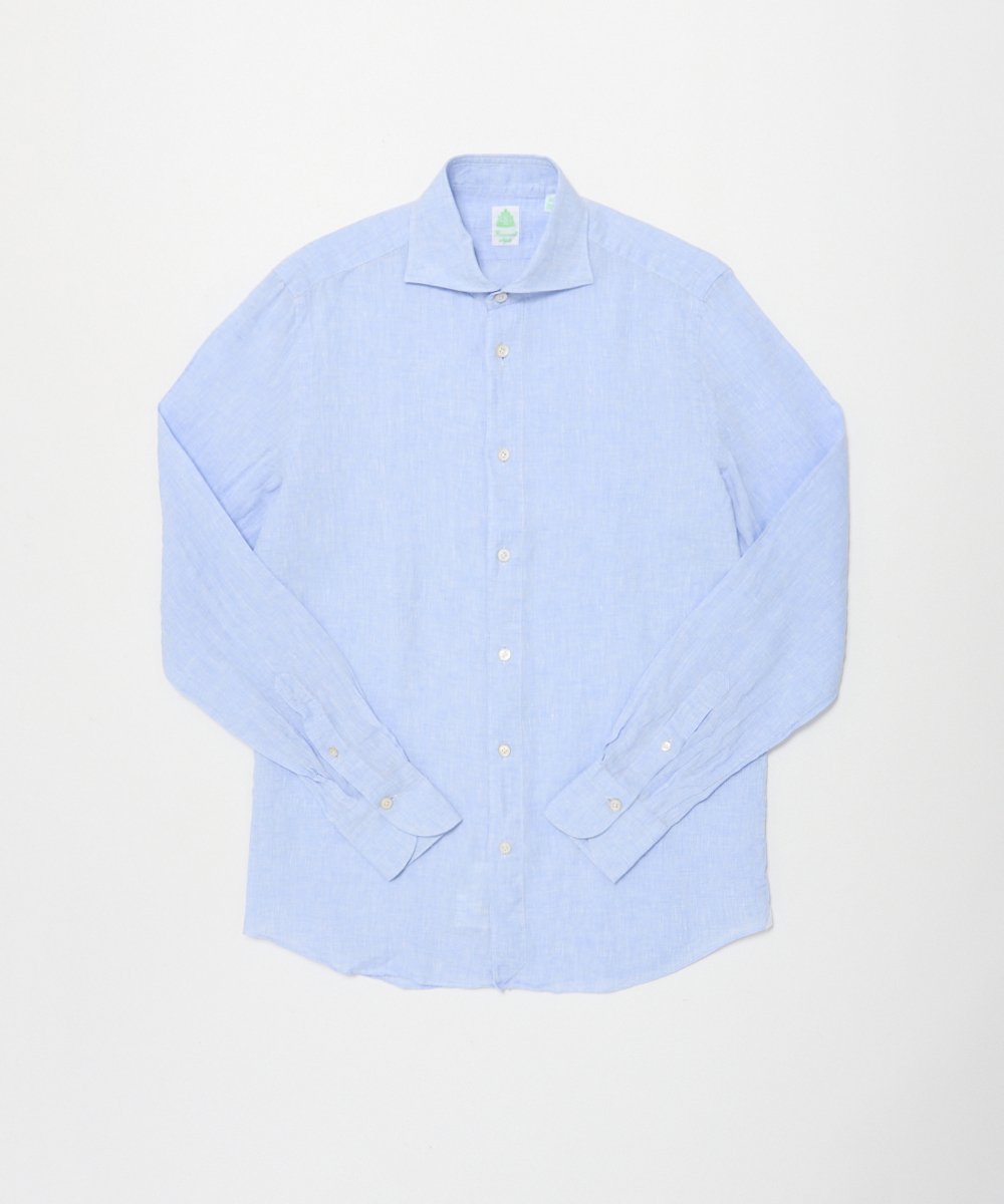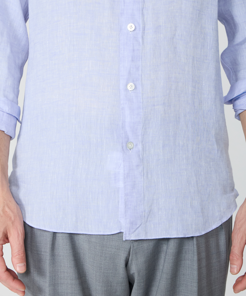 Finamoreを代表する襟型「SIMONE(シモーネ)」を採用。開きすぎず、詰まりすぎない絶妙なバランスで、ネクタイの有無を問わず違和感なく取り入れられる、汎用性の高い襟型です。