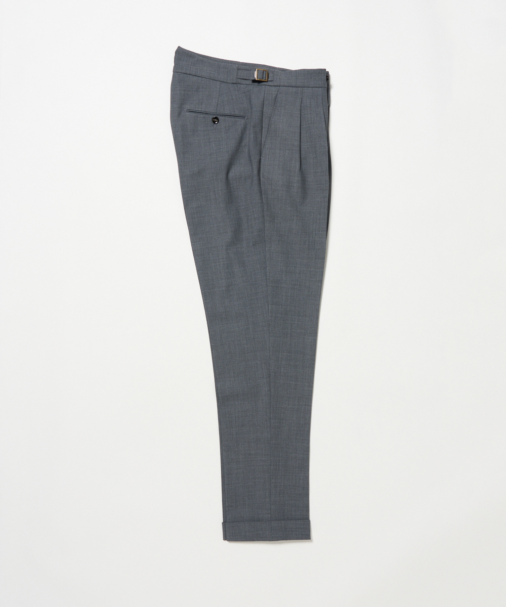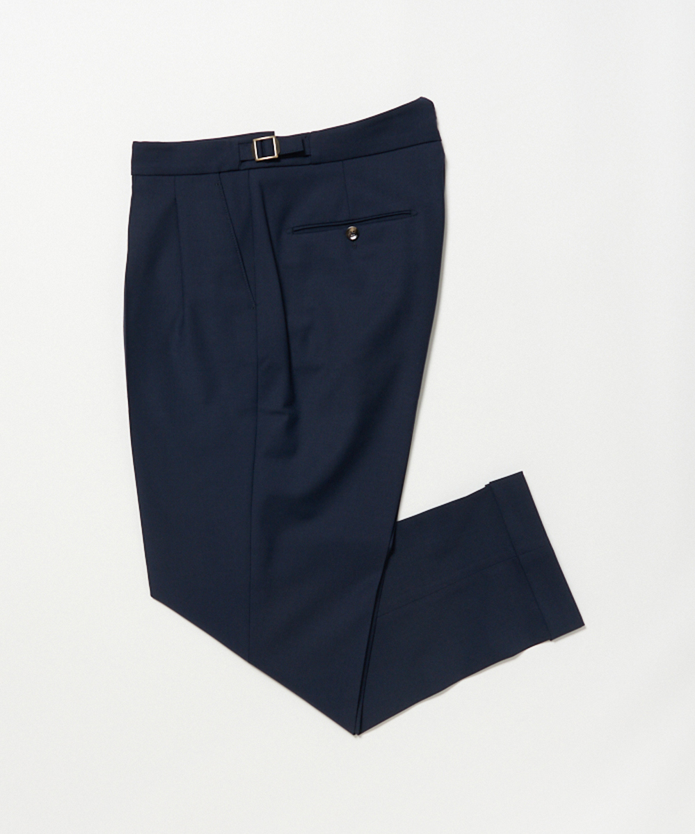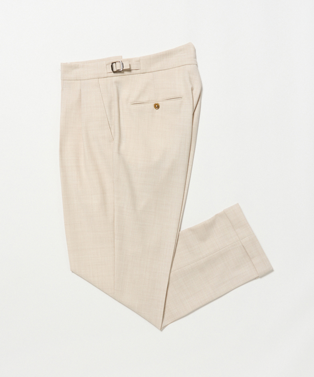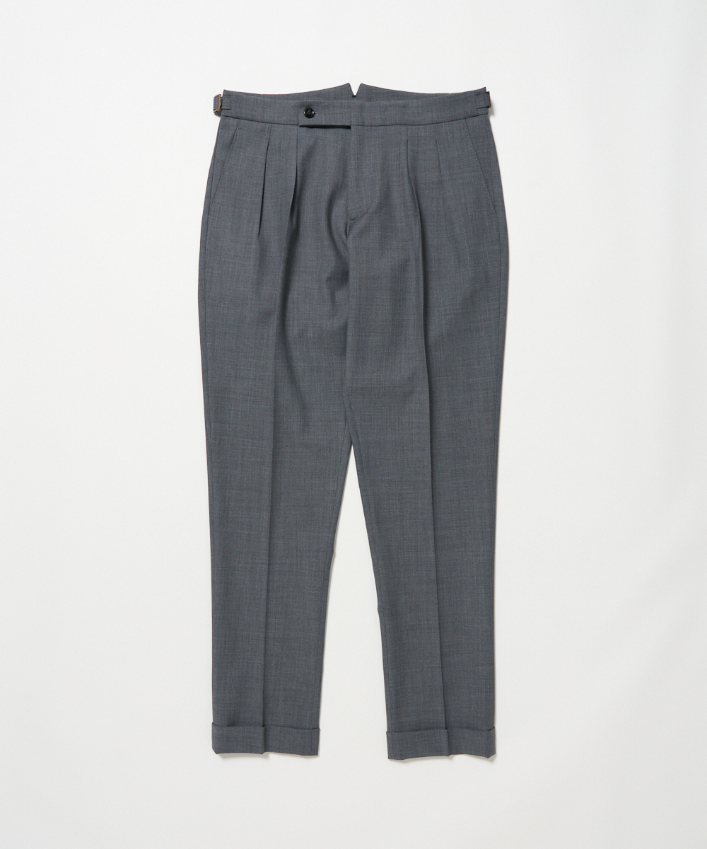 2プリーツが入りサイドアジャスターが付くクラシカルな仕様で、ゆったりとした腰回りと裾口にかけての美しいテーパードが目を惹くモダンクラシックな表情が特徴です。