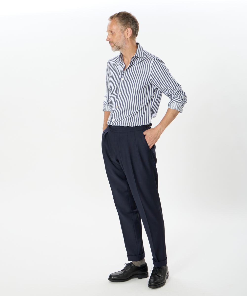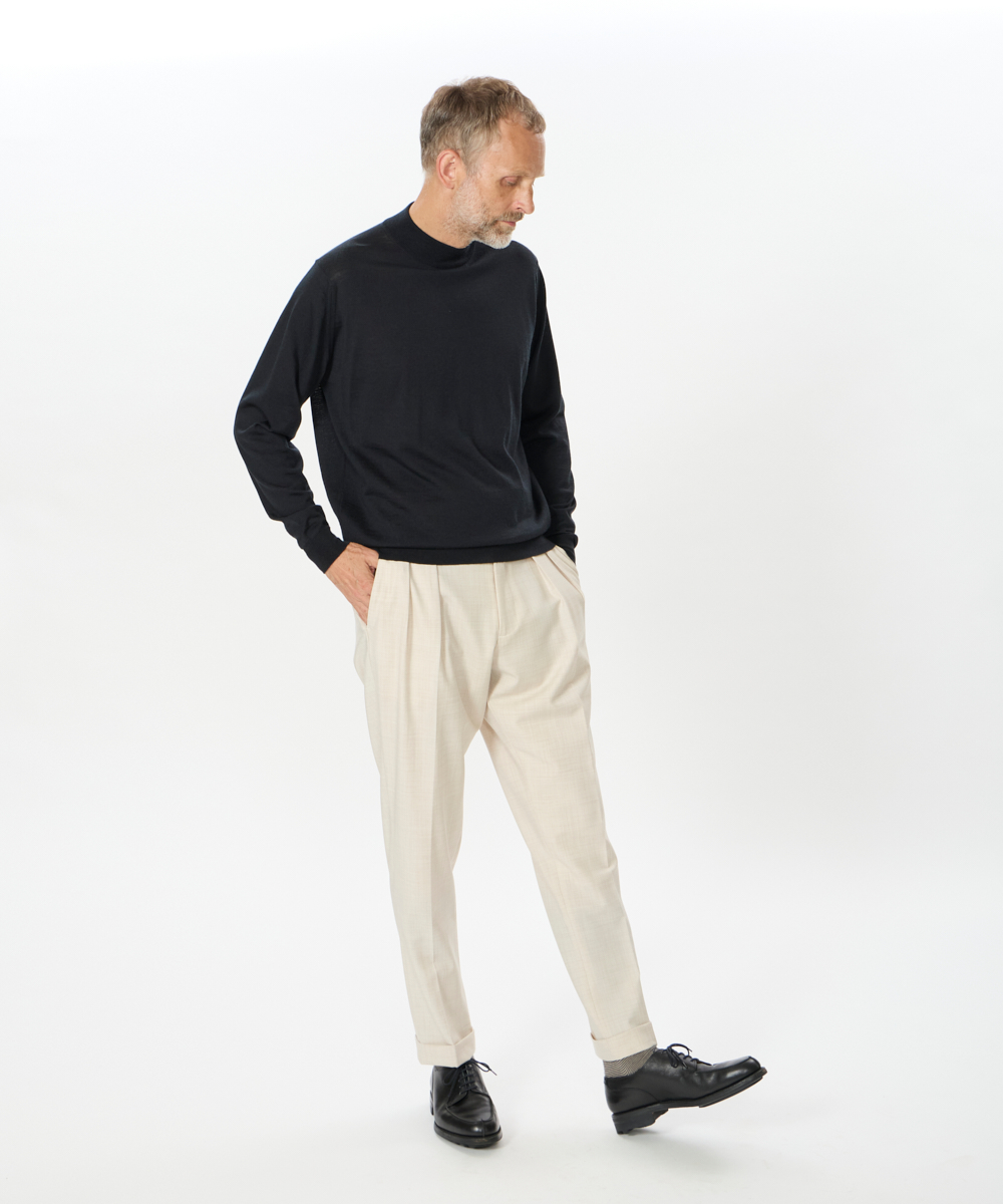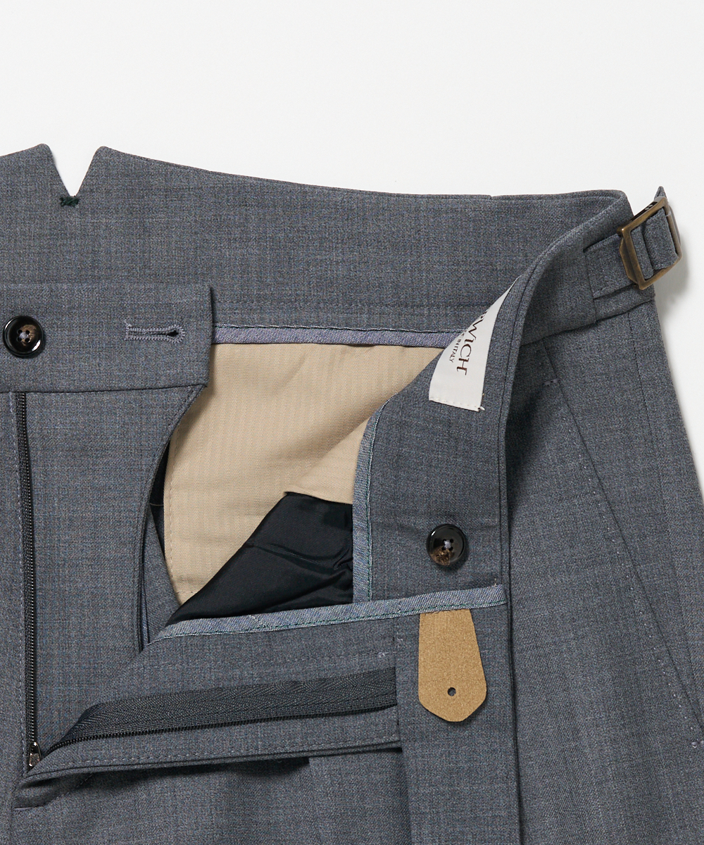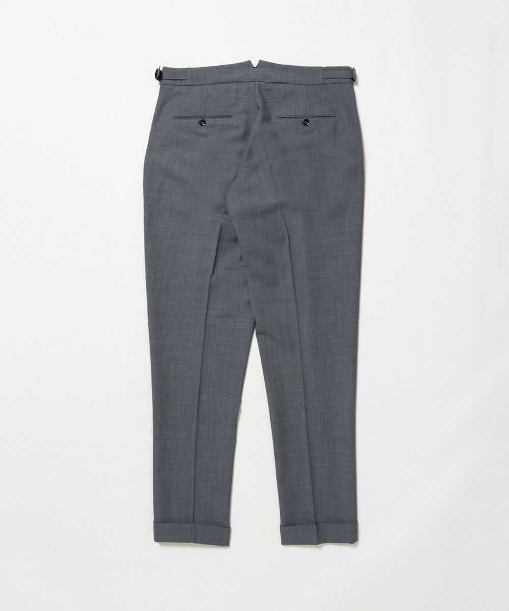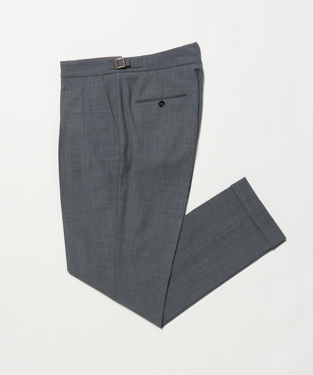 2プリーツが入りサイドアジャスターが付くクラシカルな仕様で、ゆったりとした腰回りと裾口にかけての美しいテーパードが目を惹くモダンクラシックな表情が特徴です。