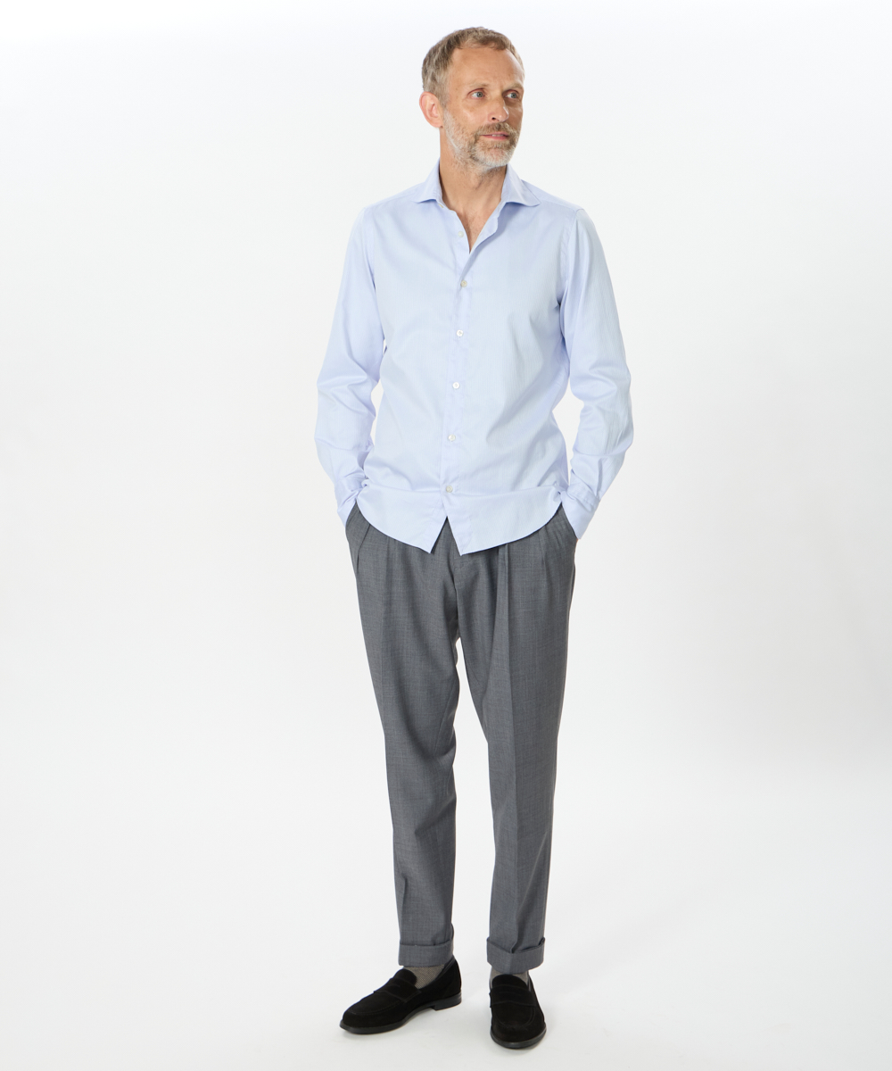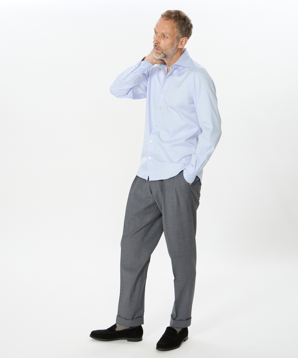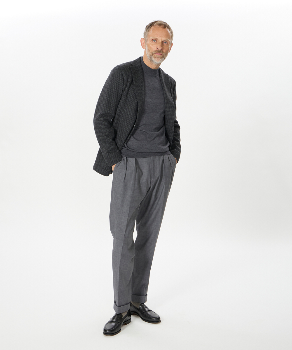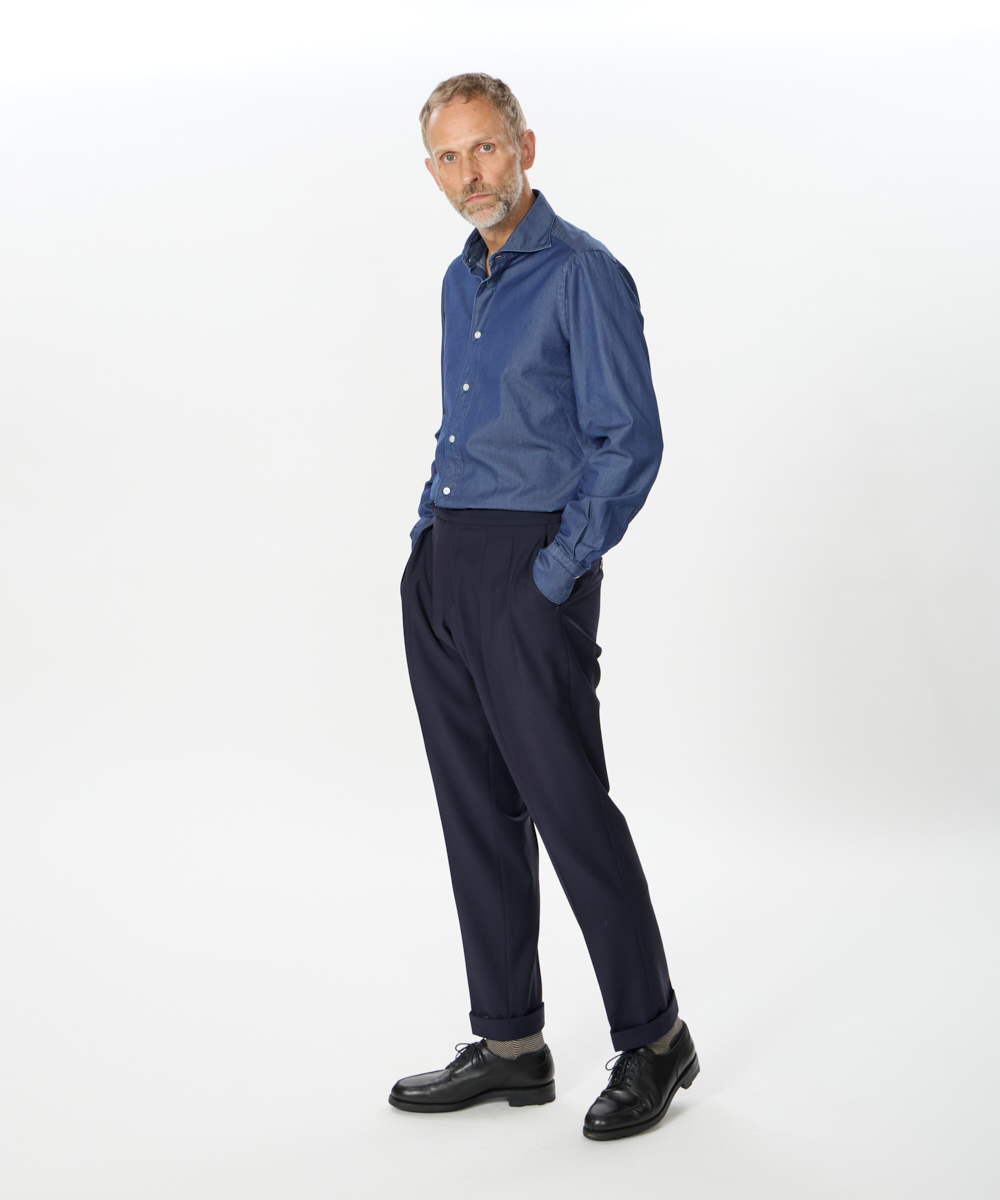 2プリーツが入りサイドアジャスターが付くクラシカルな仕様で、ゆったりとした腰回りと裾口にかけての美しいテーパードが目を惹くモダンクラシックな表情が特徴です。