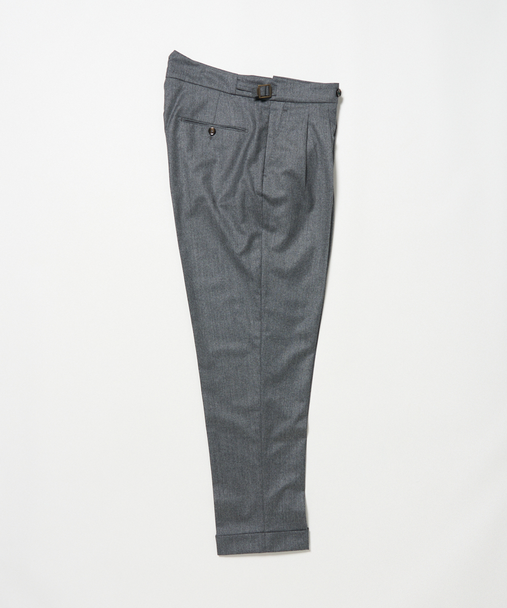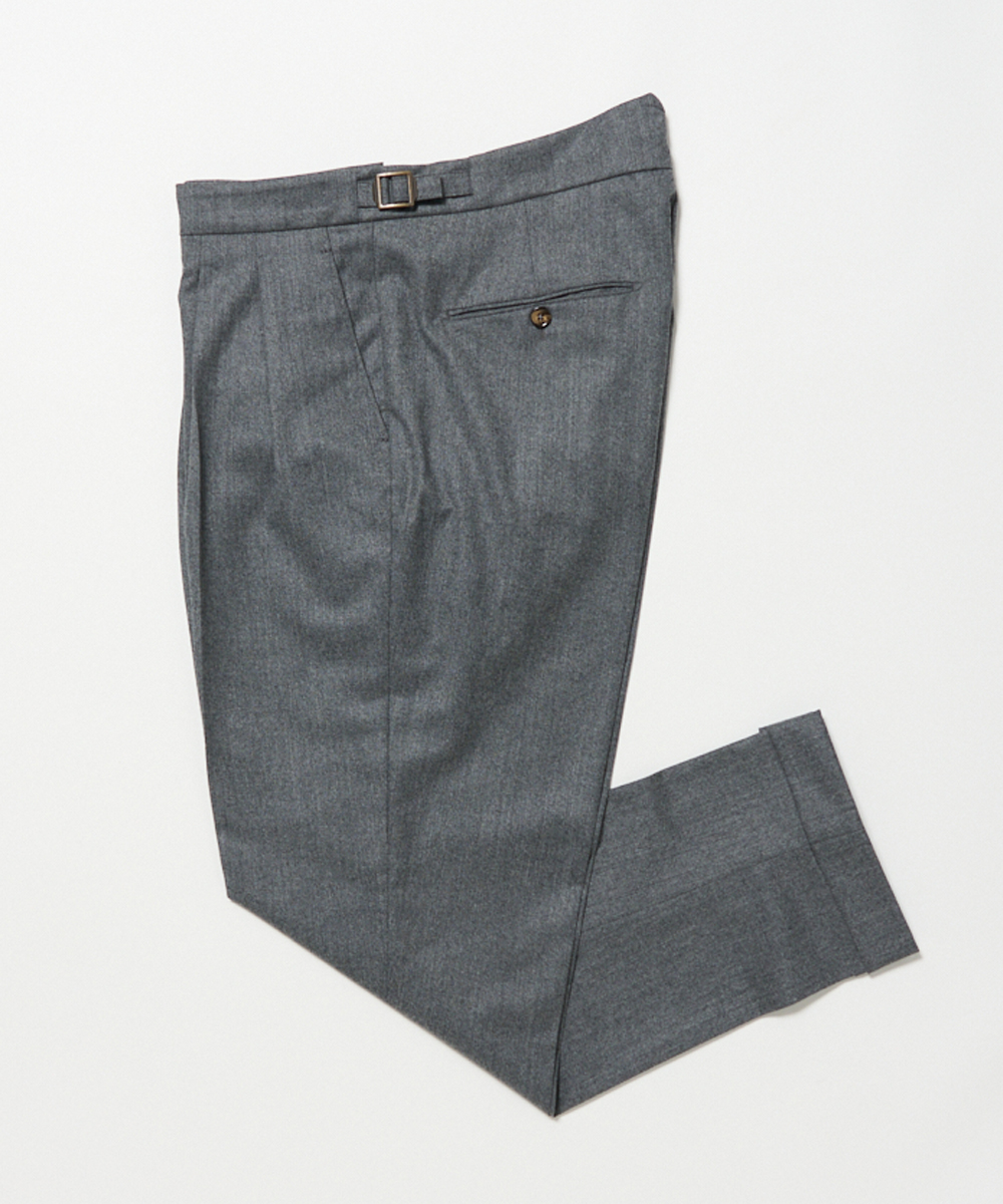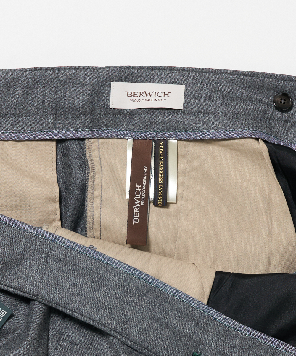 BERWICHのアイコン的存在ともいえる代表モデル「SCOTCH(スコッチ)」は、2プリーツ仕様に加え、ウエストにはクラシカルなサイドアジャスターを採用。腰回りにはゆとりを持たせながらも、裾に向かって美しくテーパードするシルエットが特徴で、現代的な感性を取り入れた“モダンクラシック”な一本に仕上がっています。
