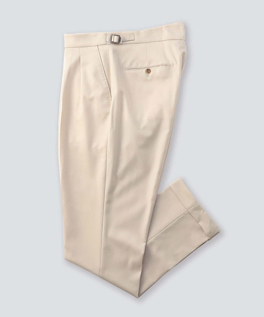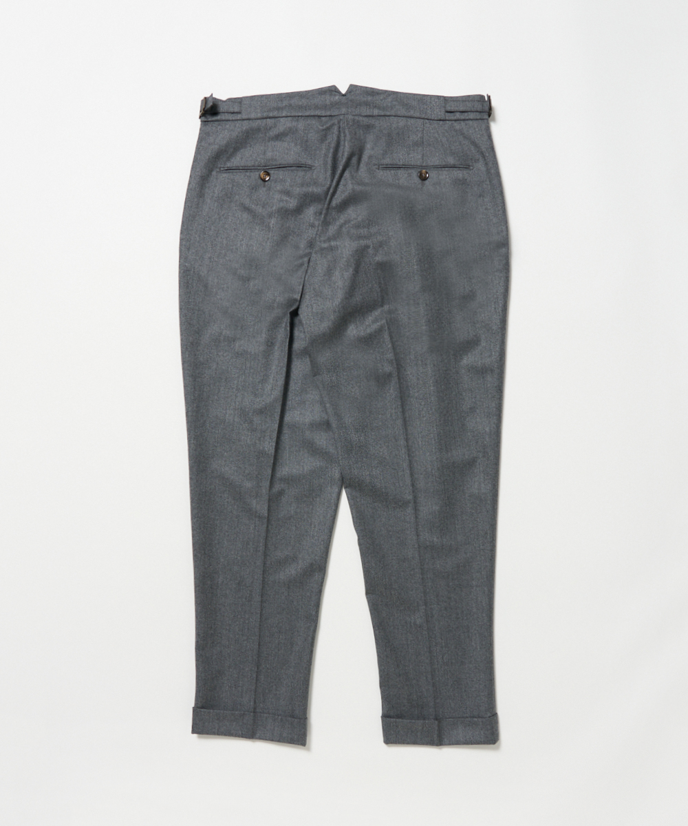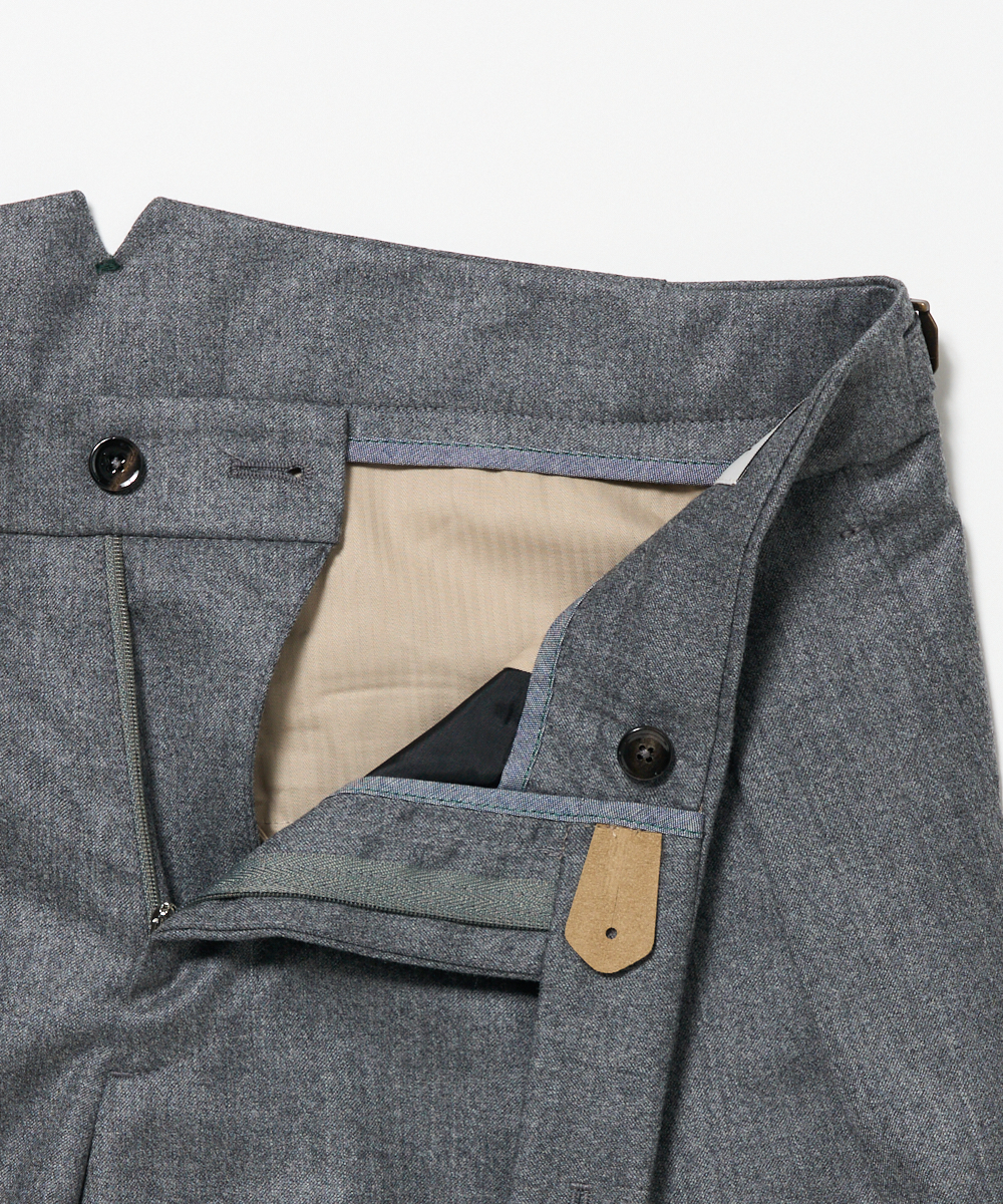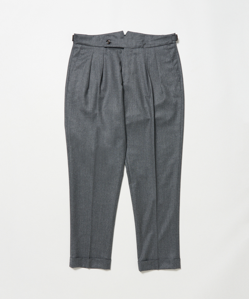 BERWICHのアイコン的存在ともいえる代表モデル「SCOTCH(スコッチ)」は、2プリーツ仕様に加え、ウエストにはクラシカルなサイドアジャスターを採用。腰回りにはゆとりを持たせながらも、裾に向かって美しくテーパードするシルエットが特徴で、現代的な感性を取り入れた“モダンクラシック”な一本に仕上がっています。