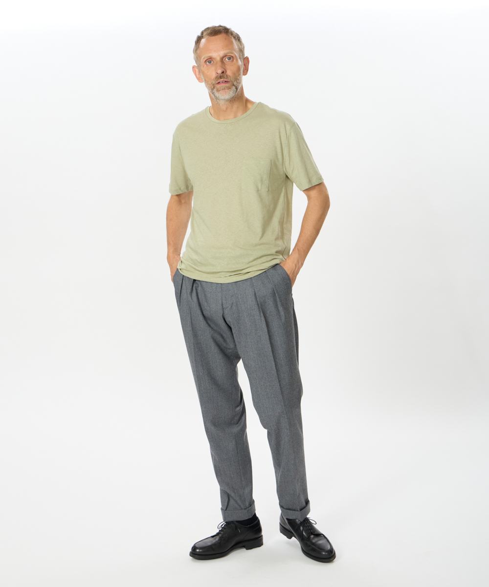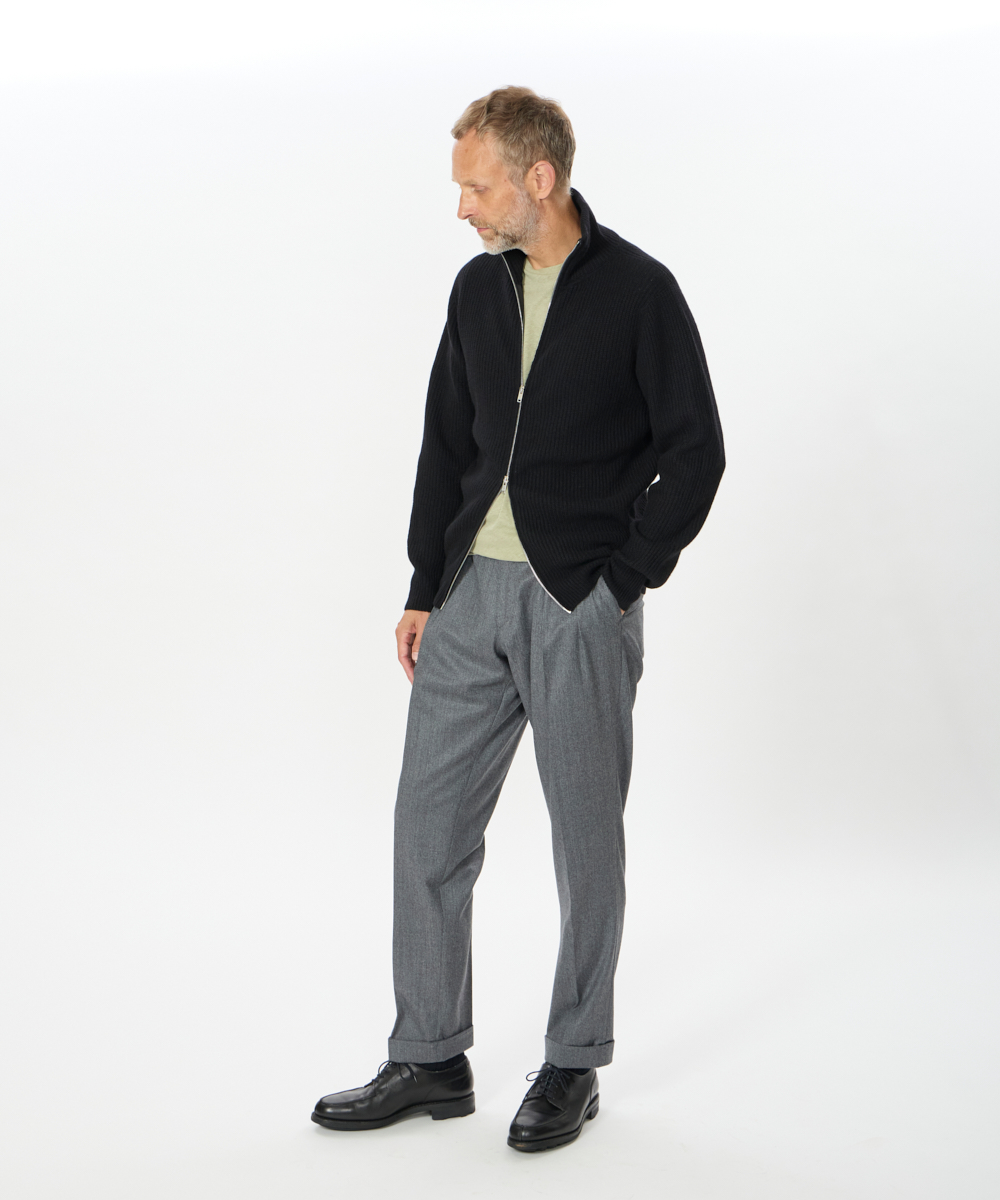 2プリーツ仕様に加え、ウエストにはクラシカルなサイドアジャスターを採用。腰回りにはゆとりを持たせながらも、裾に向かって美しくテーパードするシルエットが特徴で、現代的な感性を取り入れた“モダンクラシック”な一本に仕上がっています。