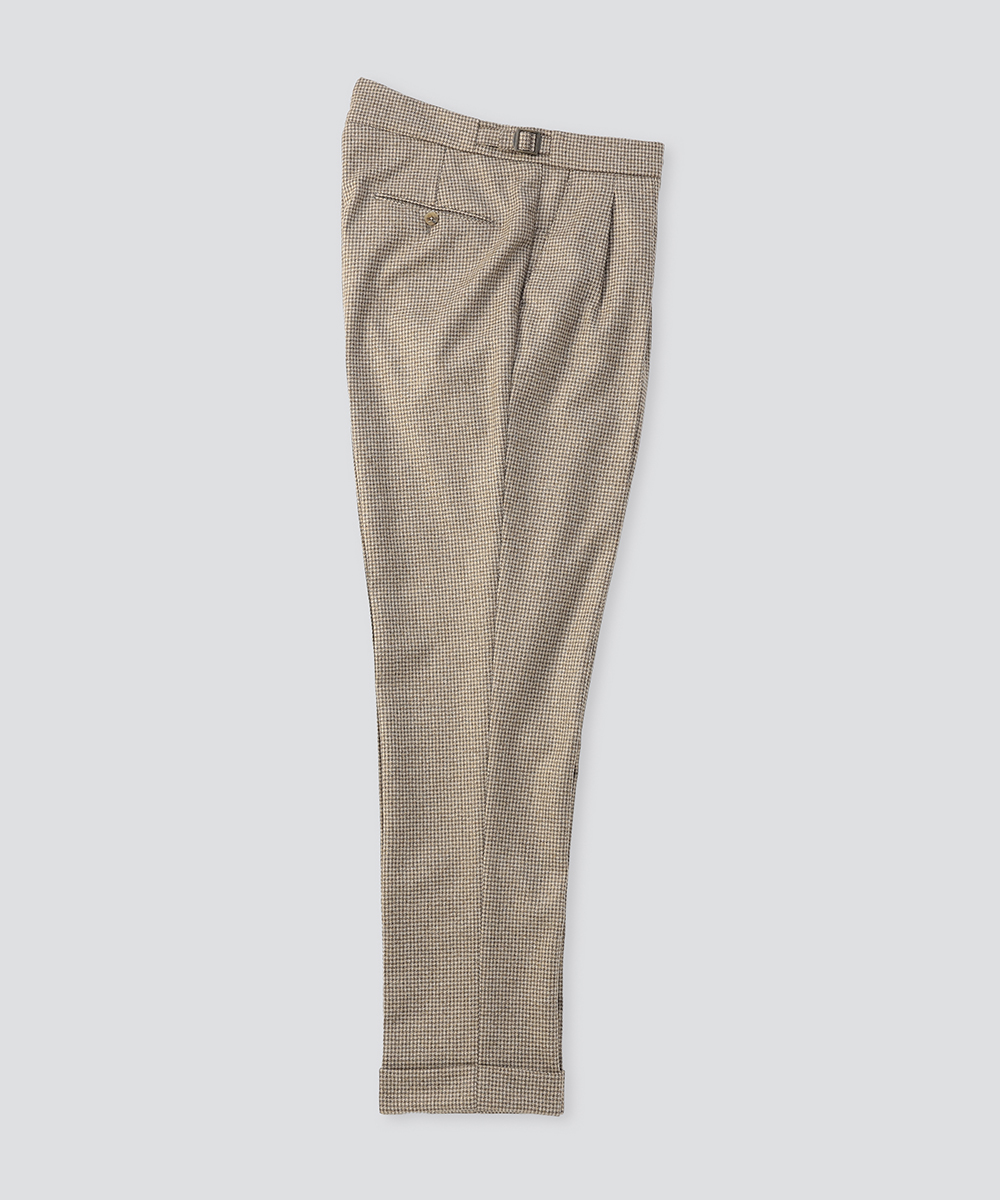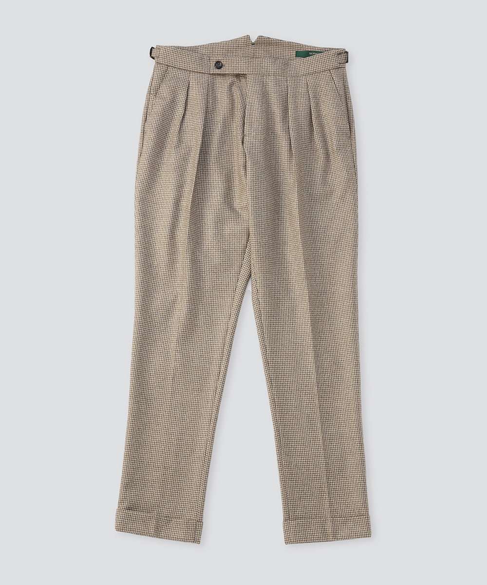 2プリーツとサイドアジャスターを備えたクラシカルなディテールに、現代的なフィットを融合した一本。腰回りには程よいゆとりを持たせつつ、裾にかけて美しくテーパードする洗練されたシルエットが、モダンクラシックな佇まいを演出します。