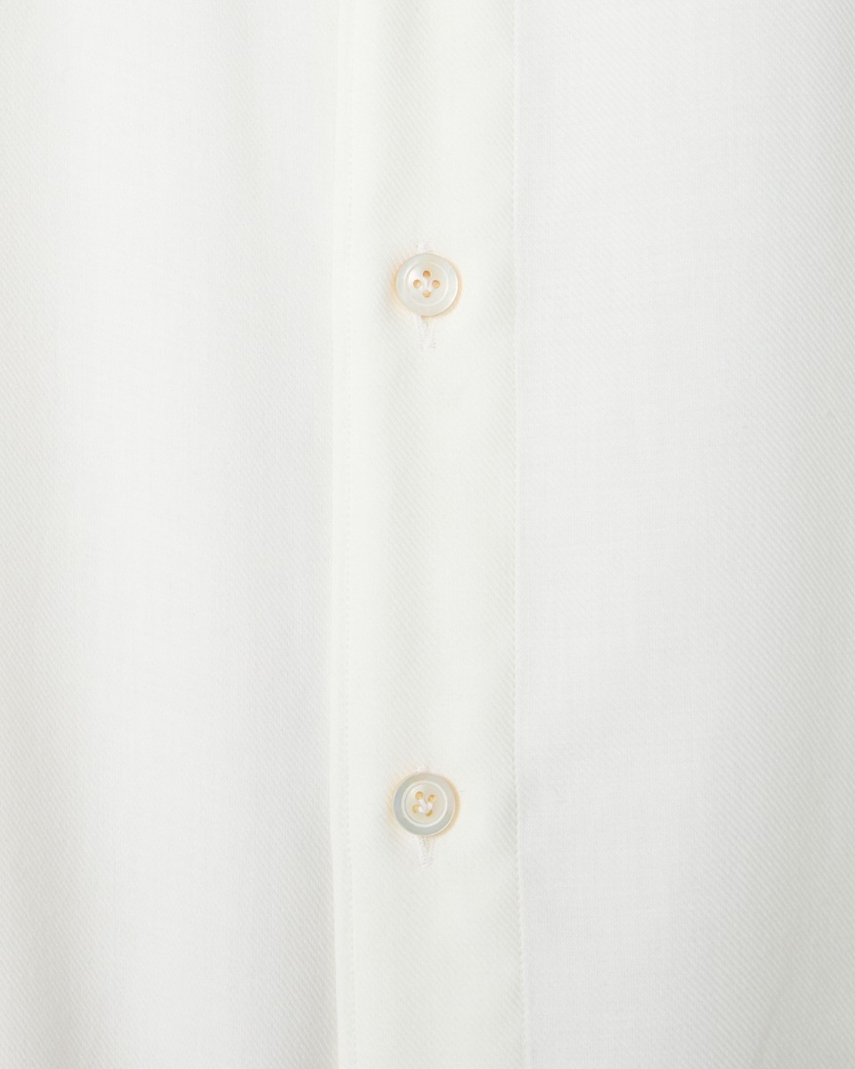 襟型「PANTELLERIA(パンテレリア)」は、台襟から襟までを一枚の生地で構成したワンピースカラー仕様。首元に自然な立体感と美しいロールを生み出し、Finamoreならではの高い縫製技術が際立つデザインです。