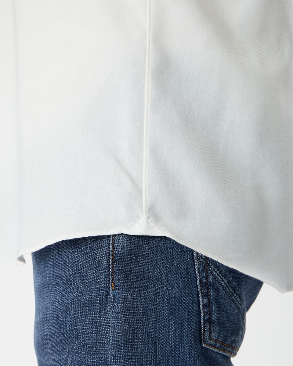 ボディは適度にリラックスしたシルエットで、タックアウトでもバランス良く着られるよう、丈感が細かく計算されたデザイン。シャツ一枚での着用はもちろん、羽織りものとの相性も抜群です。