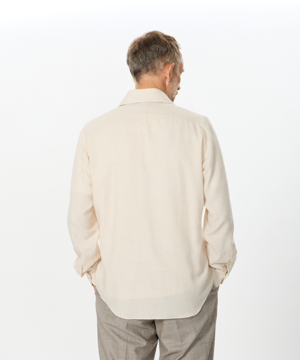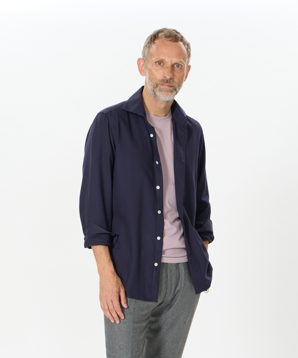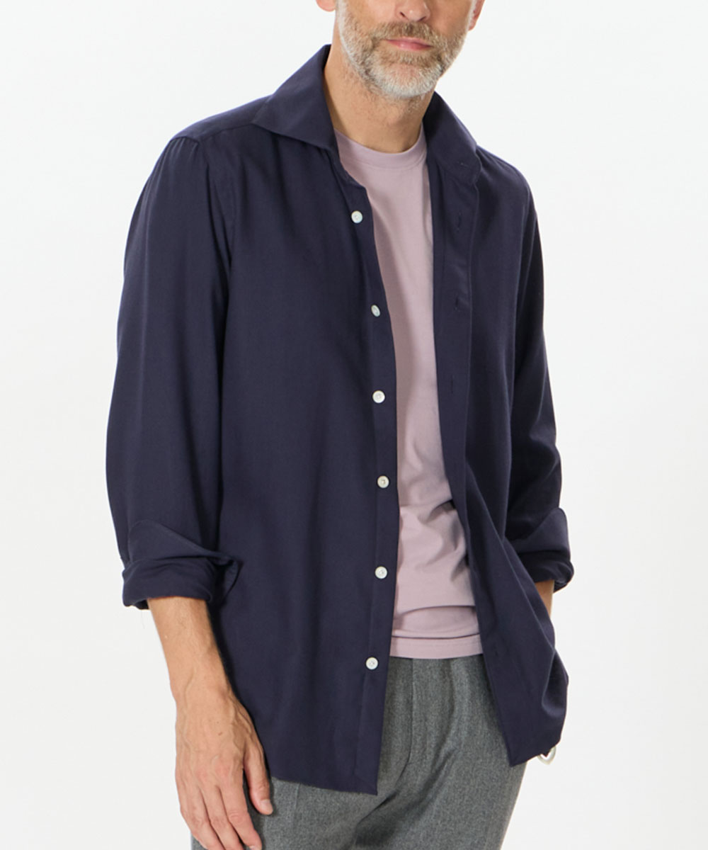 生地には、英国の名門・トーマス メイソン社のカシミアコットンを採用。カシミア混ならではの柔らかさと温かみ、上品な光沢感が特徴で、秋冬シーズンにふさわしい贅沢な一枚です。温もりある色味と肌触りの良い素材感は、着る人の印象を上品に引き立て、大人の装いを格上げしてくれます。Finamoreが誇る伝統と技術が詰まったシャツを、ぜひお試しください。