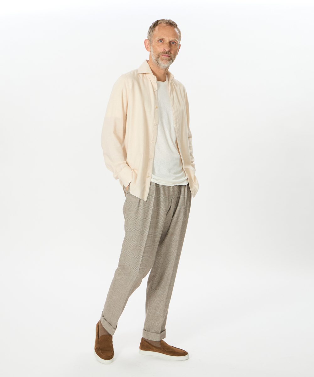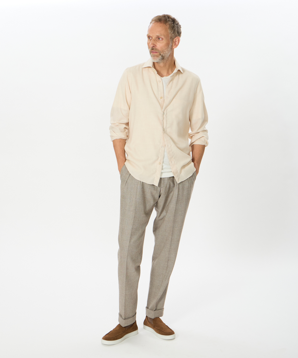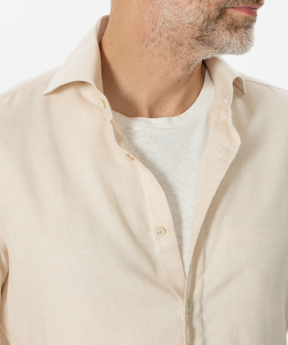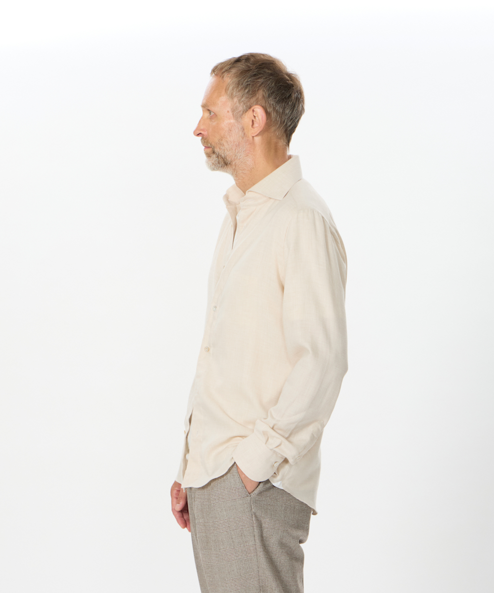 生地には、英国の名門・トーマス メイソン社のカシミアコットンを採用。カシミア混ならではの柔らかさと温かみ、上品な光沢感が特徴で、秋冬シーズンにふさわしい贅沢な一枚です。温もりある色味と肌触りの良い素材感は、着る人の印象を上品に引き立て、大人の装いを格上げしてくれます。Finamoreが誇る伝統と技術が詰まったシャツを、ぜひお試しください。