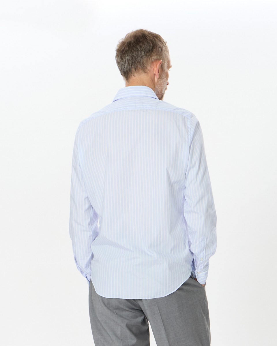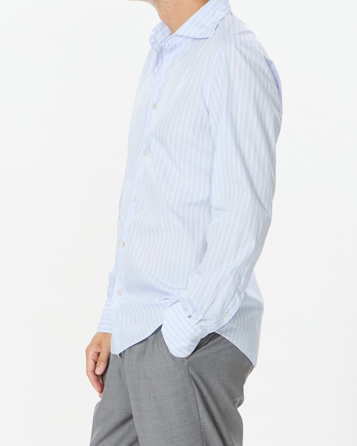 生地はコットン100%。上品なタッチと柔らかな風合いが特徴で、サックスブルーに白抜きのストライプ柄が爽やかな印象を演出します。柄物ながらも取り入れやすく、シンプルなボトムスとの相性も抜群。スタイリングにほどよいアクセントを加えてくれます。