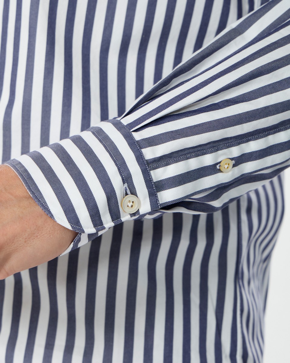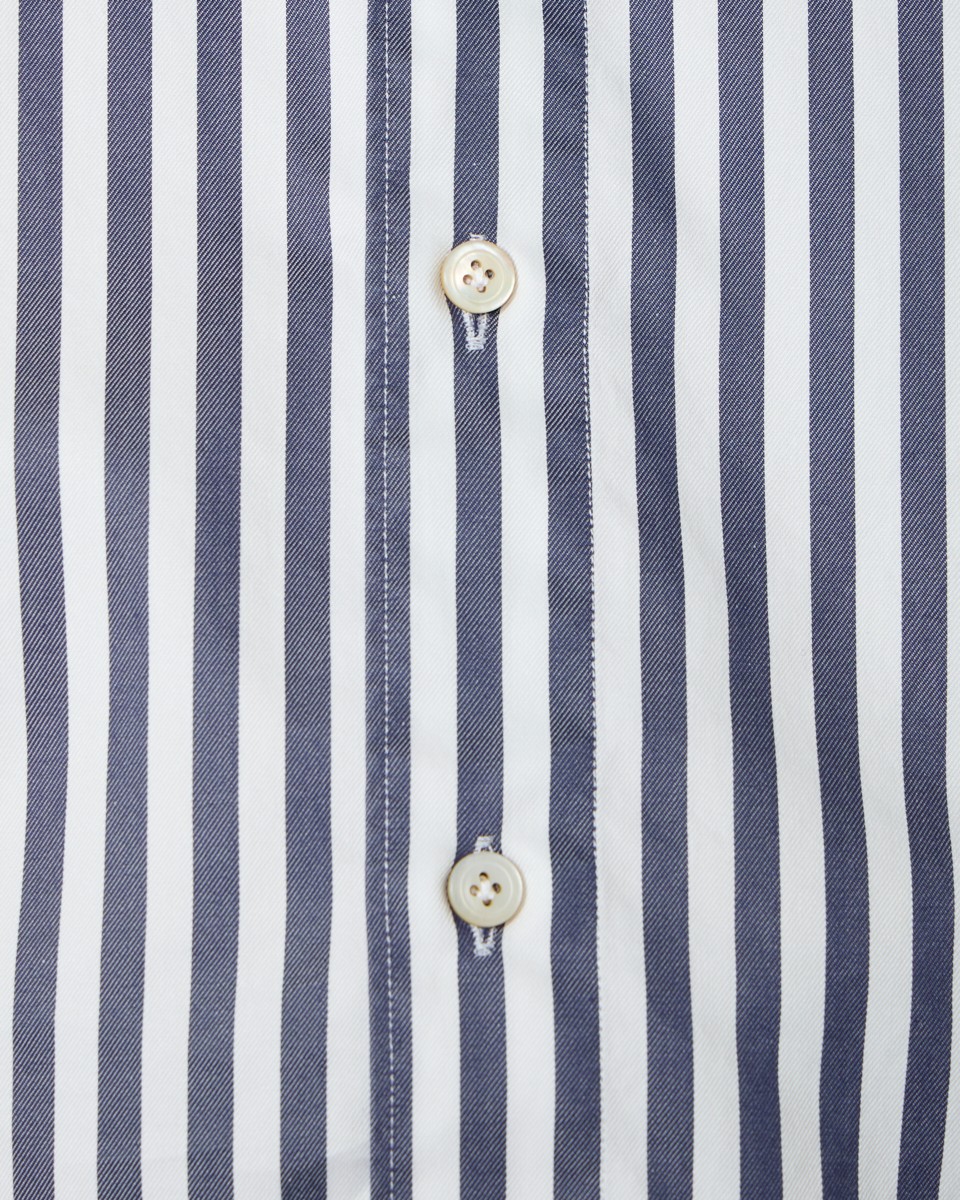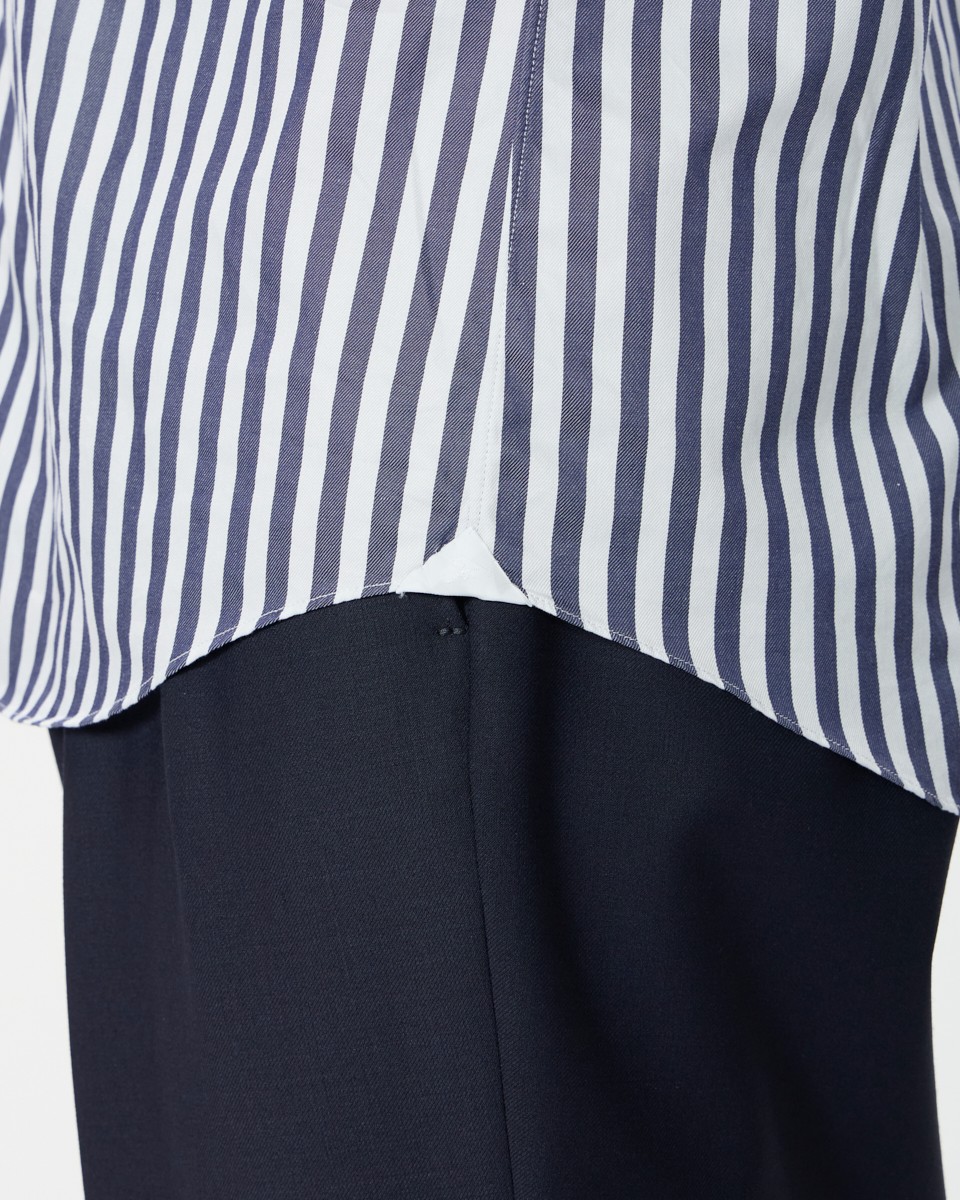 生地には、太めのストライプが印象的なコットンファブリックを採用。ビジネスライクな細かなピッチではなく、あえて存在感のあるストライプ柄にすることで、シンプルなスタイリングにアクセントを加え、より洗練された雰囲気を演出します。