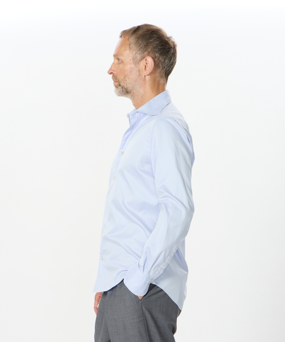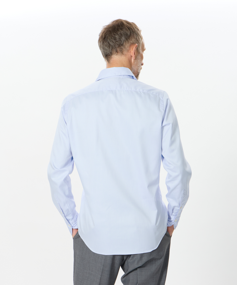 Finamore(フィナモレ)のスポーツラインは、袖付け・ボタン付け・ガゼット付けの3工程をハンドメイドで仕上げており、手仕事ならではの風合いと動きを妨げない独自パターンが秀逸です。
