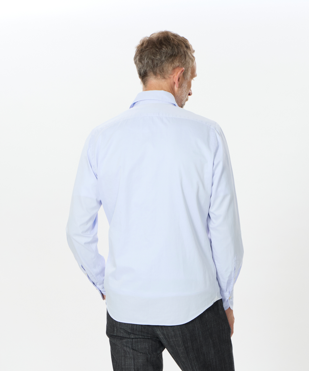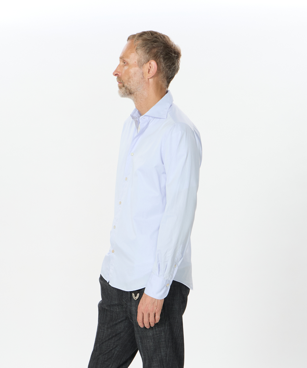 襟型"SIMONE(シモーネ)"は、Finamoreを代表するカッタウェイカラー。襟の開き方が絶妙なバランスで、エレガントな仕上がりです。