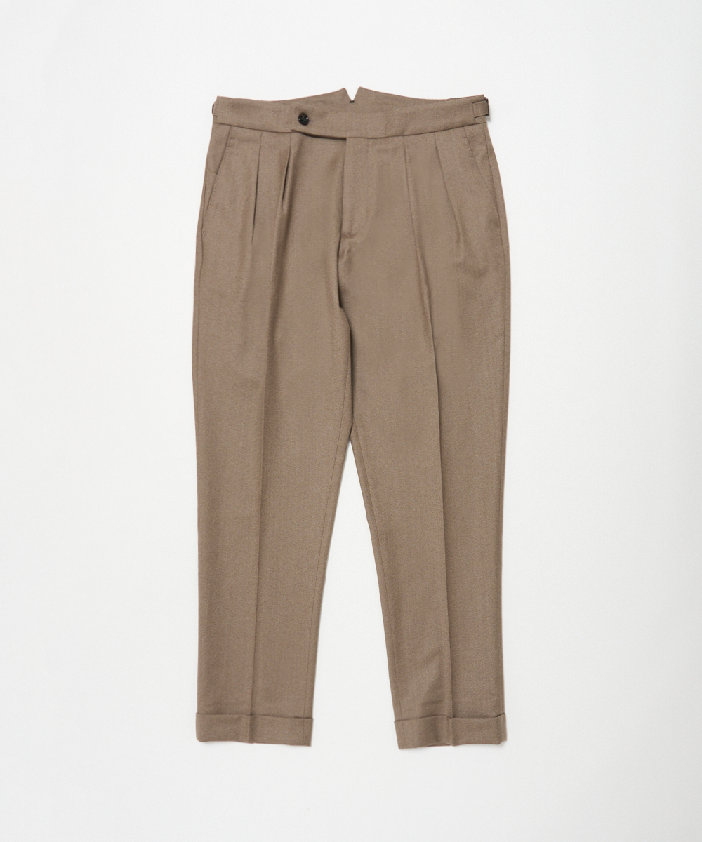 BERWICHを代表するモデル"SCOTCH(スコッチ)”は、2プリーツが入りサイドアジャスターが付くクラシカルな仕様で、ゆったりとした腰回りと裾口にかけての美しいテーパードが目を惹くモダンクラシックな表情が特徴のモデル。