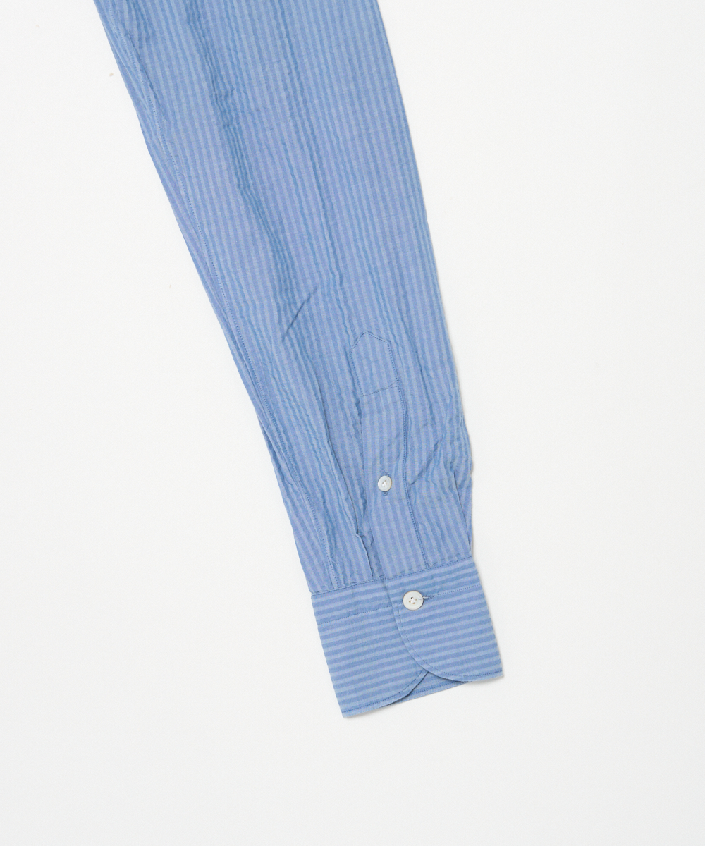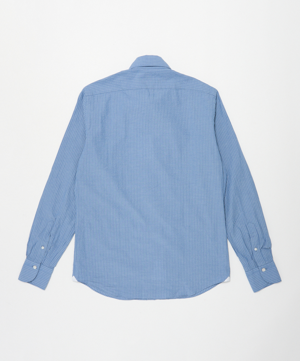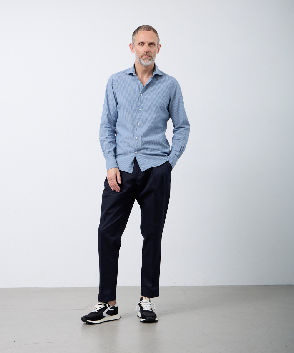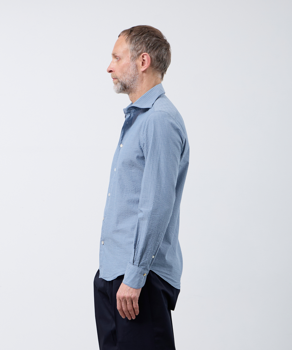 ひときわ清涼感のあるシアサッカー素材を使用した一着。サラリとした肌触りで、ベタつきにくく、さらにシワになりにくいのも魅力です。ブルーを基調にしたストライプは、上品な印象を保ちつつ、縦のラインがシルエットをすっきり見せます。大人のビジネスカジュアルやクールビズスタイルに合わせれば、清潔感と軽やかさを演出。一方で、ジャケットを外してラフに着こなすことで、休日のリラックススタイルにも自然になじむ汎用性の高さも魅力です。夏の装いに欠かせない、快適さと品格を兼ね備えた一着と言えるでしょう。