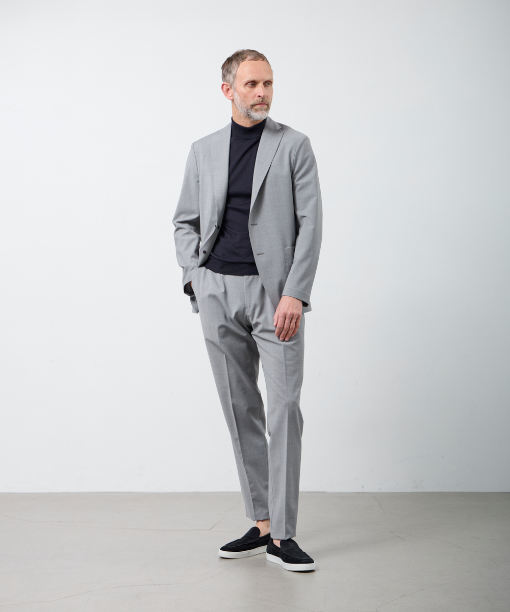 パンツはワンプリーツ仕様に加え、ウエストシャーリング加工とドローコードを採用。スーツでありながら、リラックス感があり、思わず手に取りたくなるような、穿き心地を実現しています。