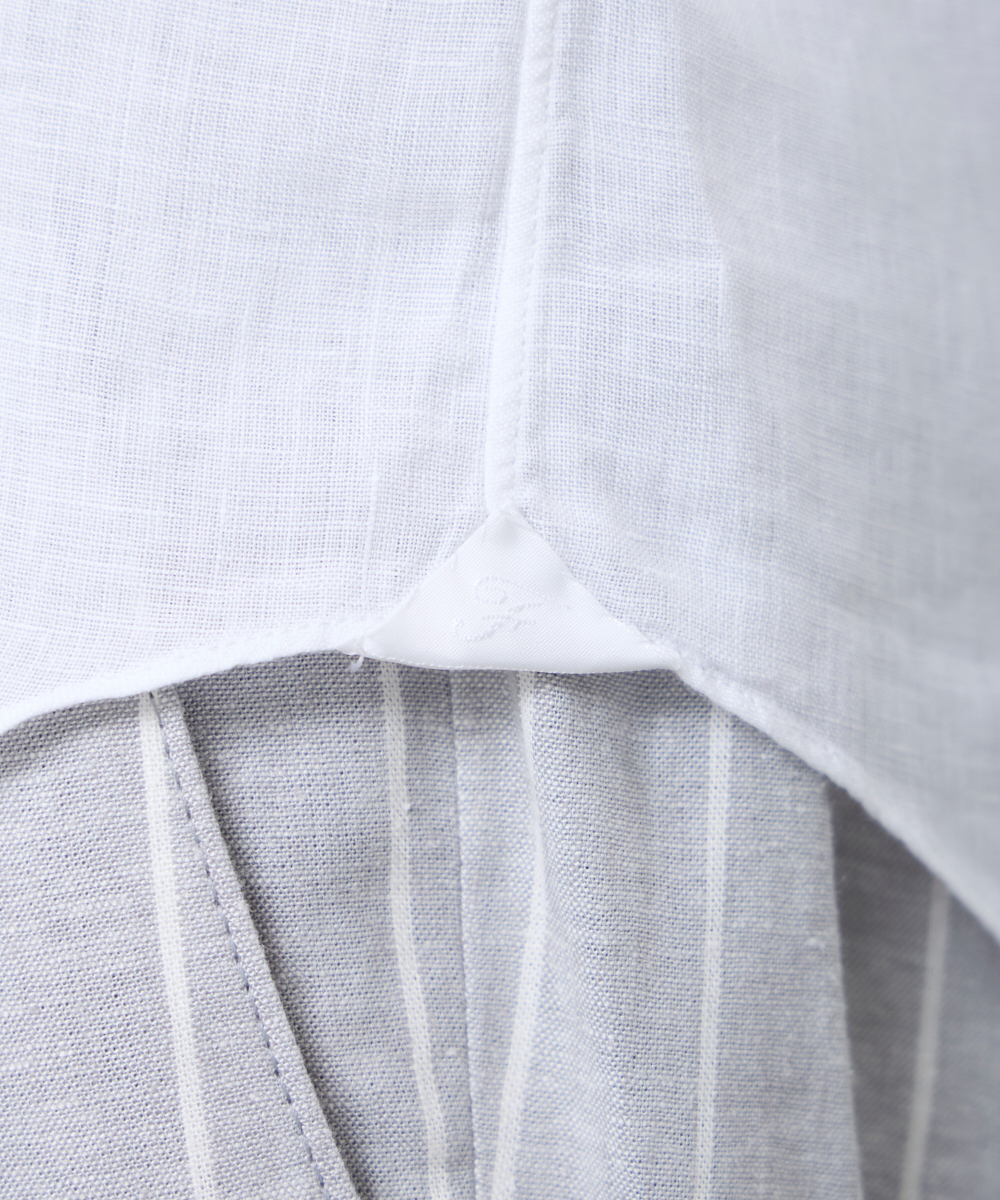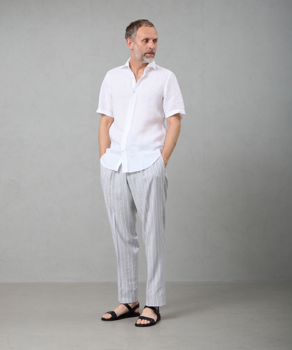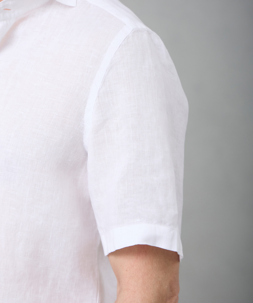夏には欠かせないリネンファブリックを採用。リネンならではの高い通気性と吸湿性により、熱がこもりにくく、快適な着心地を保ちます。リネン特有のさりげないシワ感が生み出す。