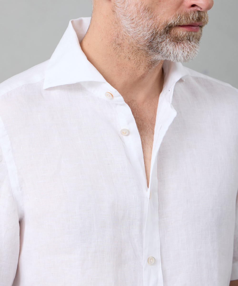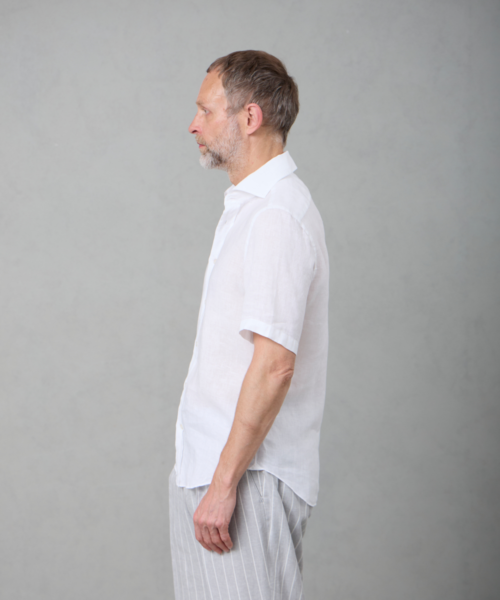 定番モデル「BALI(バリィ)」をベースに、着丈を約5cm短く設定した半袖シャツ。バランスの取れたシルエットで、一枚でも様になる仕上がりです。目の細かいステッチワークなど、細部にまで丁寧に作り込まれており、シンプルながらも味わいを感じさせる一着。上質さが自然と伝わる、Finamoreらしいシャツに仕上がっています。