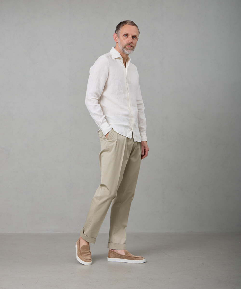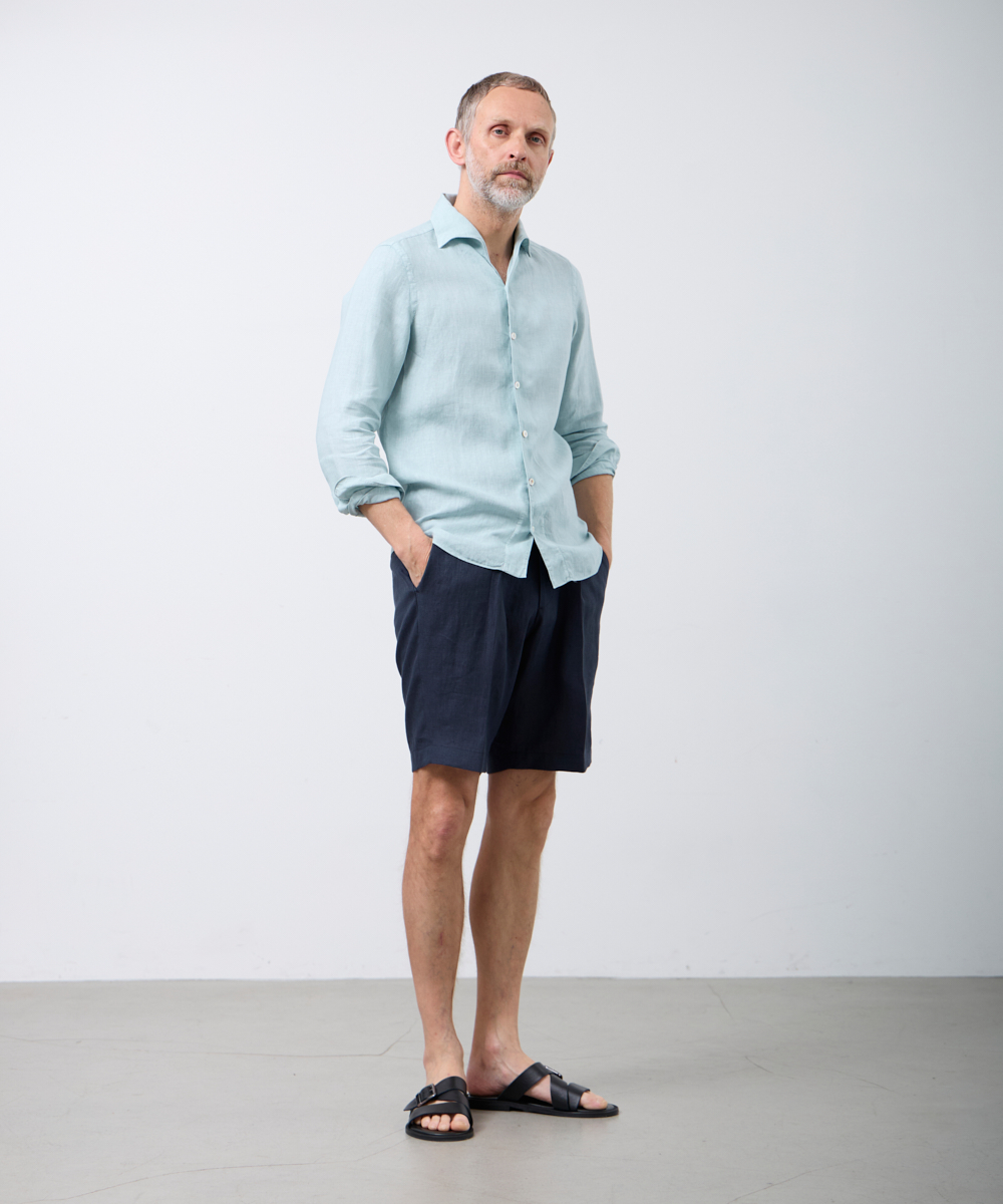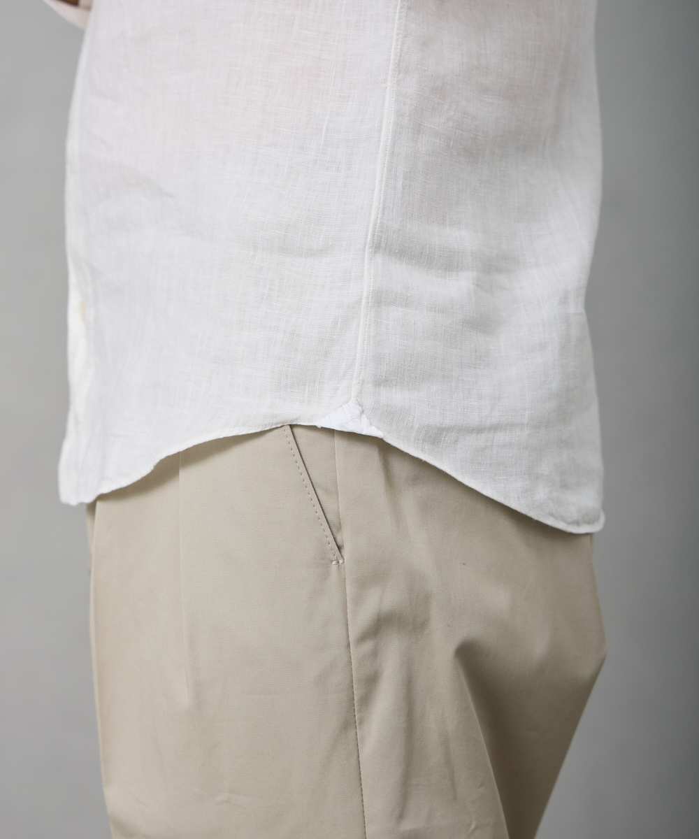 夏には欠かせないリネンファブリックを採用。リネンならではの高い通気性と吸湿性により、熱がこもりにくく、快適な着心地を保ちます。リネン特有のさりげないシワ感が生み出す表情は、かっちりしすぎない抜け感を演出。着込むほどに柔らかさが増し、身体に馴染むリネンの経年変化は、大人のカジュアルスタイルにさりげない品格をもたらします。カラーは、イタリアならではのペールカラーを採用。主張しすぎず、それでいて確かな存在感を放つ色味です。