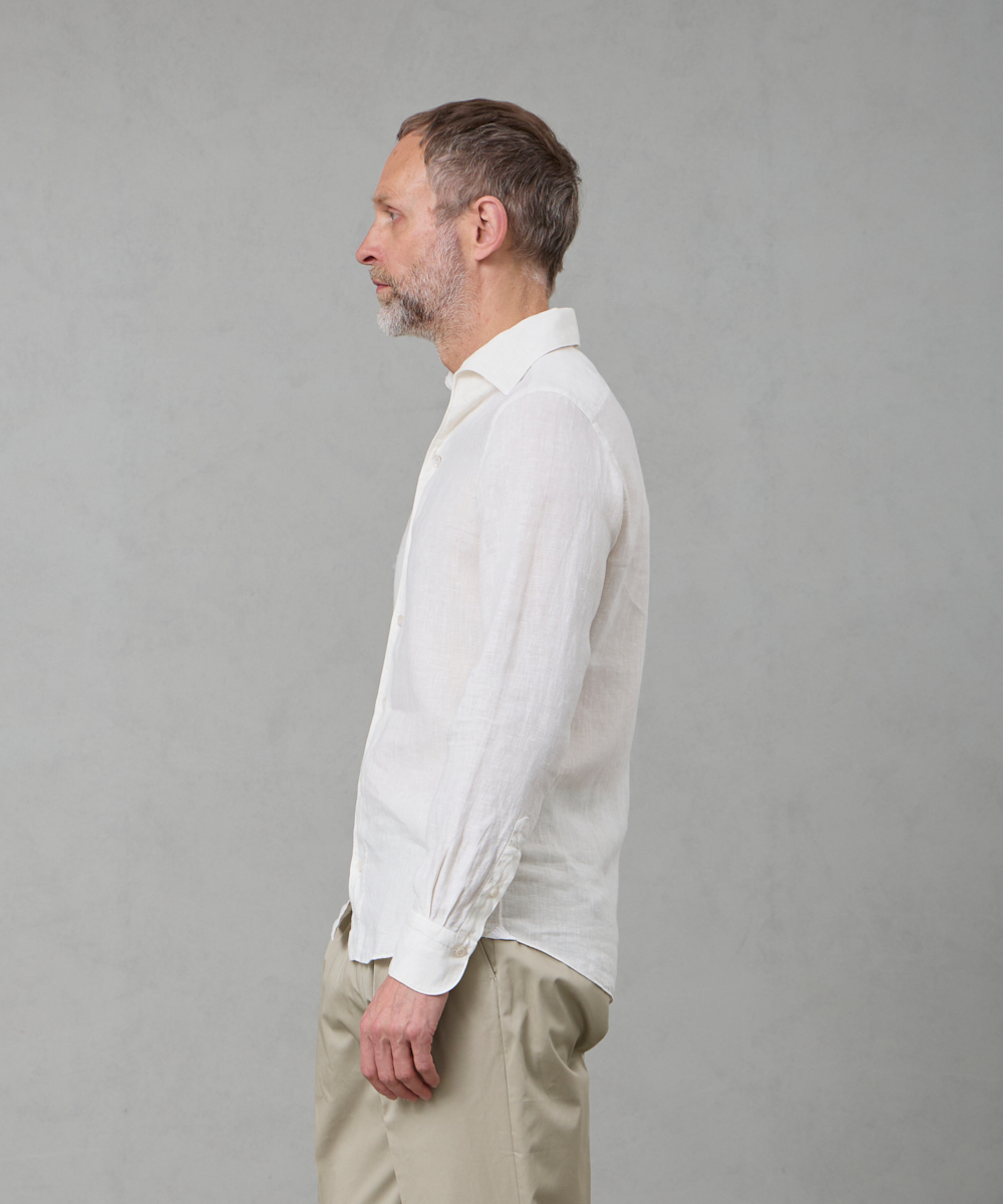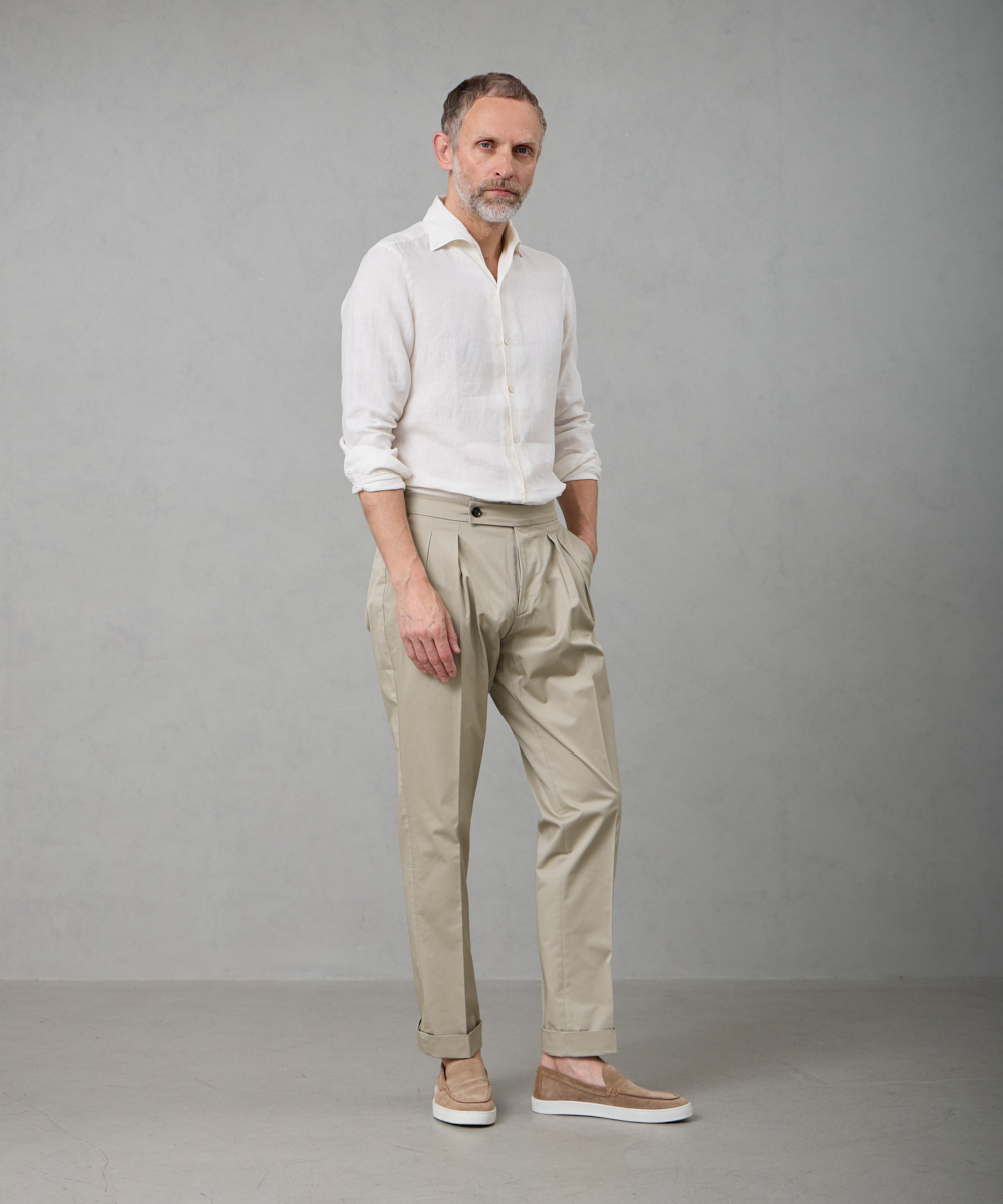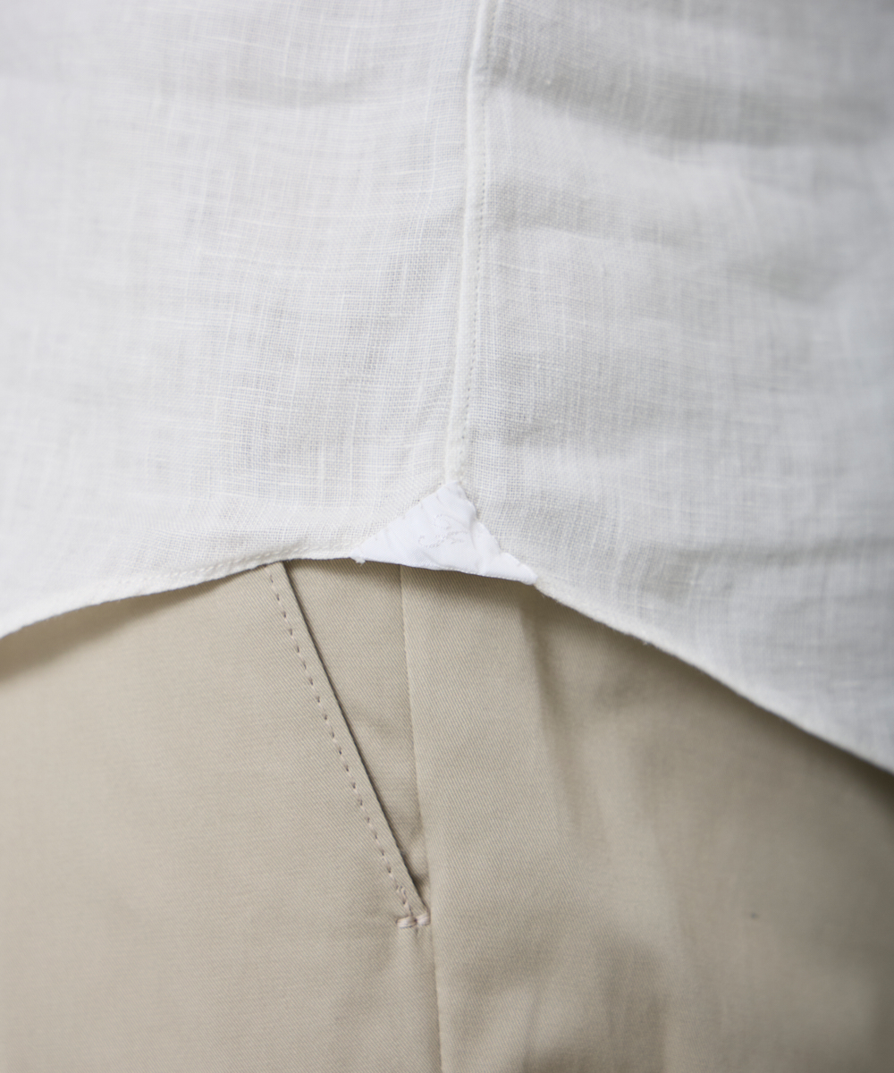 夏には欠かせないリネンファブリックを採用。リネンならではの高い通気性と吸湿性により、熱がこもりにくく、快適な着心地を保ちます。リネン特有のさりげないシワ感が生み出す表情は、かっちりしすぎない抜け感を演出。着込むほどに柔らかさが増し、身体に馴染むリネンの経年変化は、大人のカジュアルスタイルにさりげない品格をもたらします。カラーは、イタリアならではのペールカラーを採用。主張しすぎず、それでいて確かな存在感を放つ色味です。