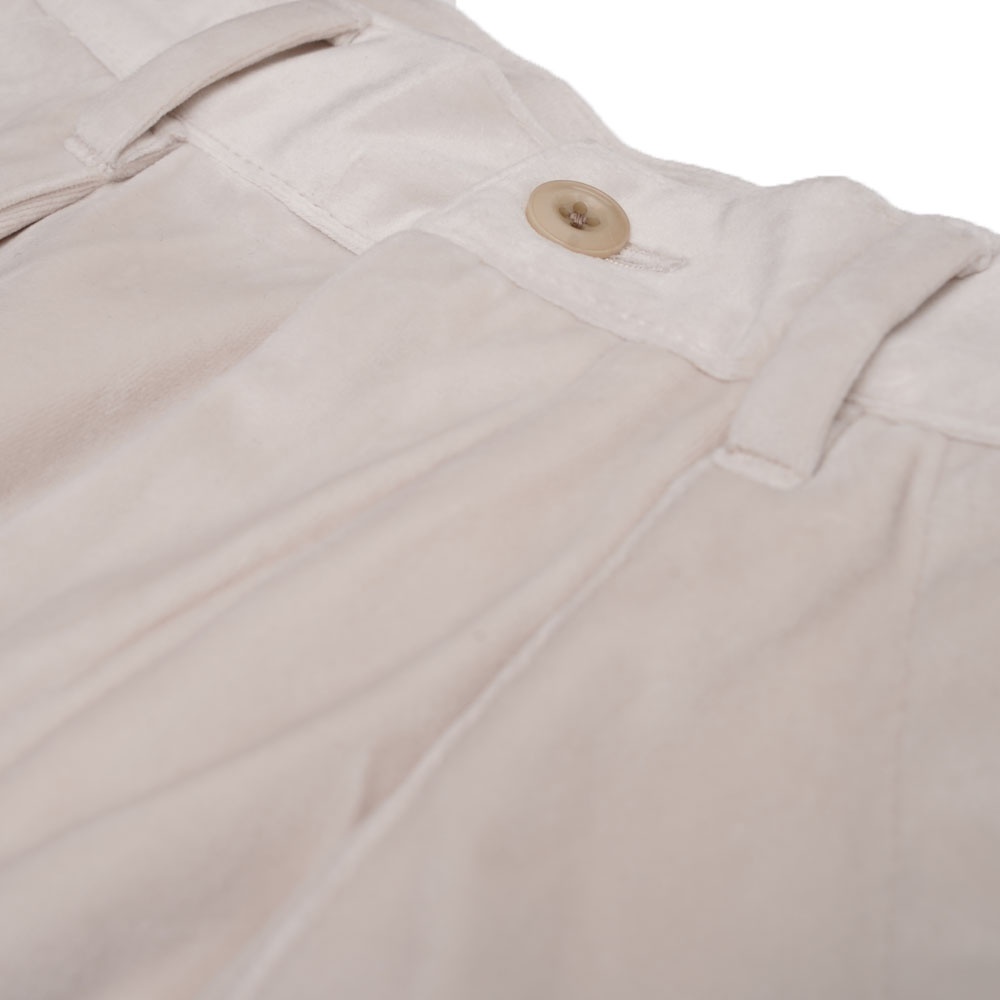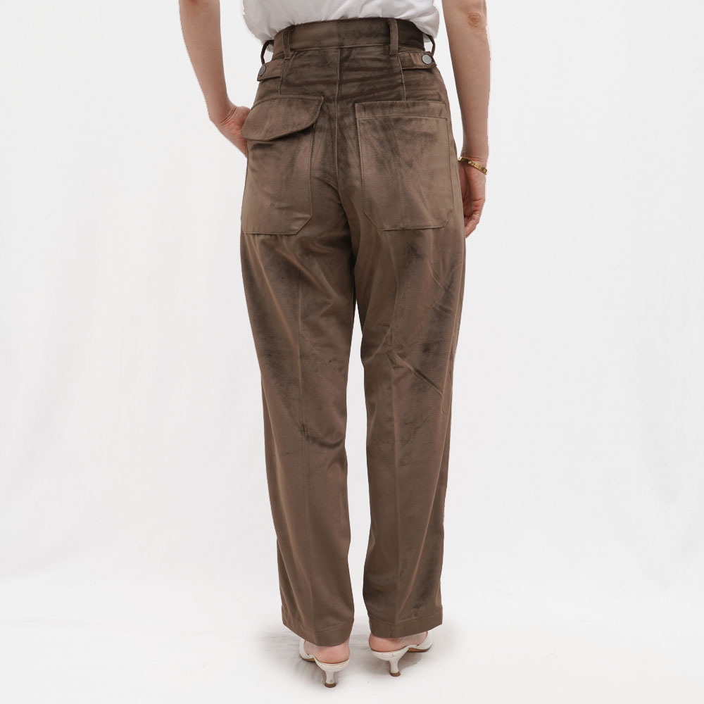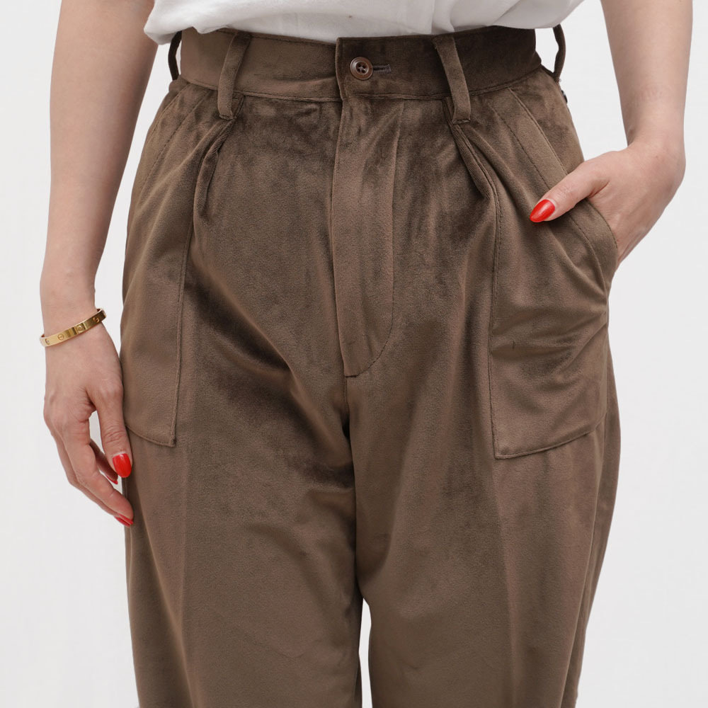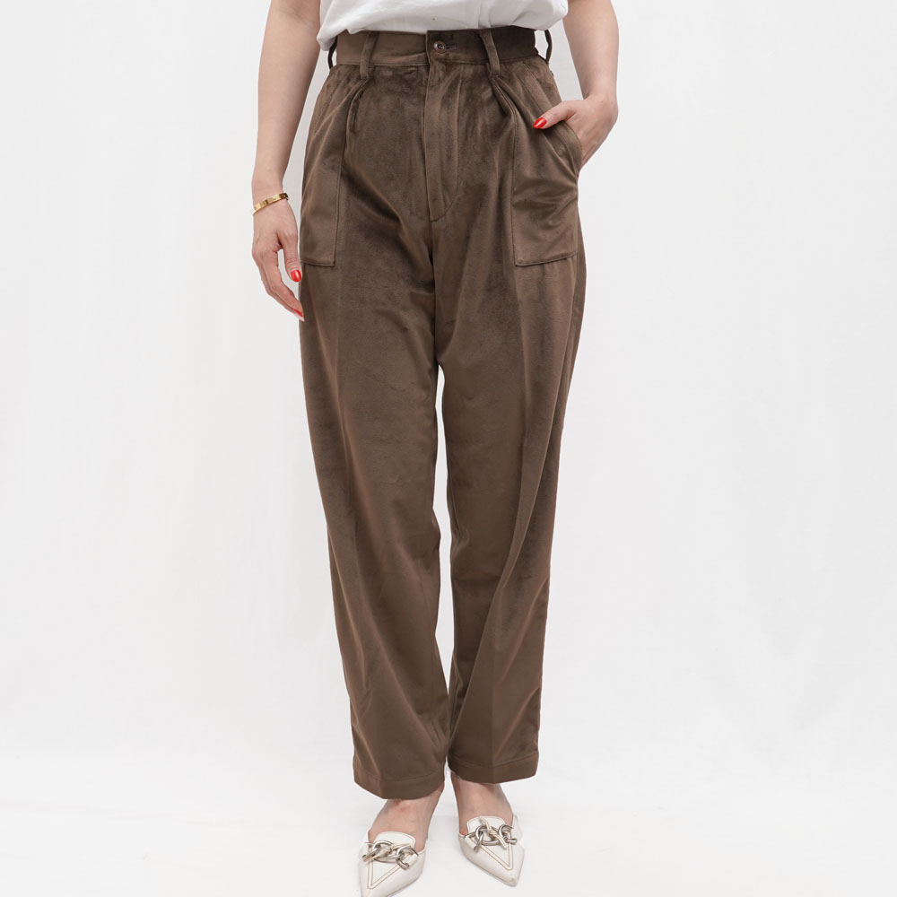 フロントにタックを施しヒップ部分に丸みを持たせたストレートシルエットのパンツ。